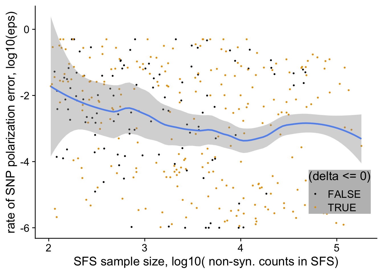 xlab("SFS sample size, log10( non-syn. counts in SFS)")+