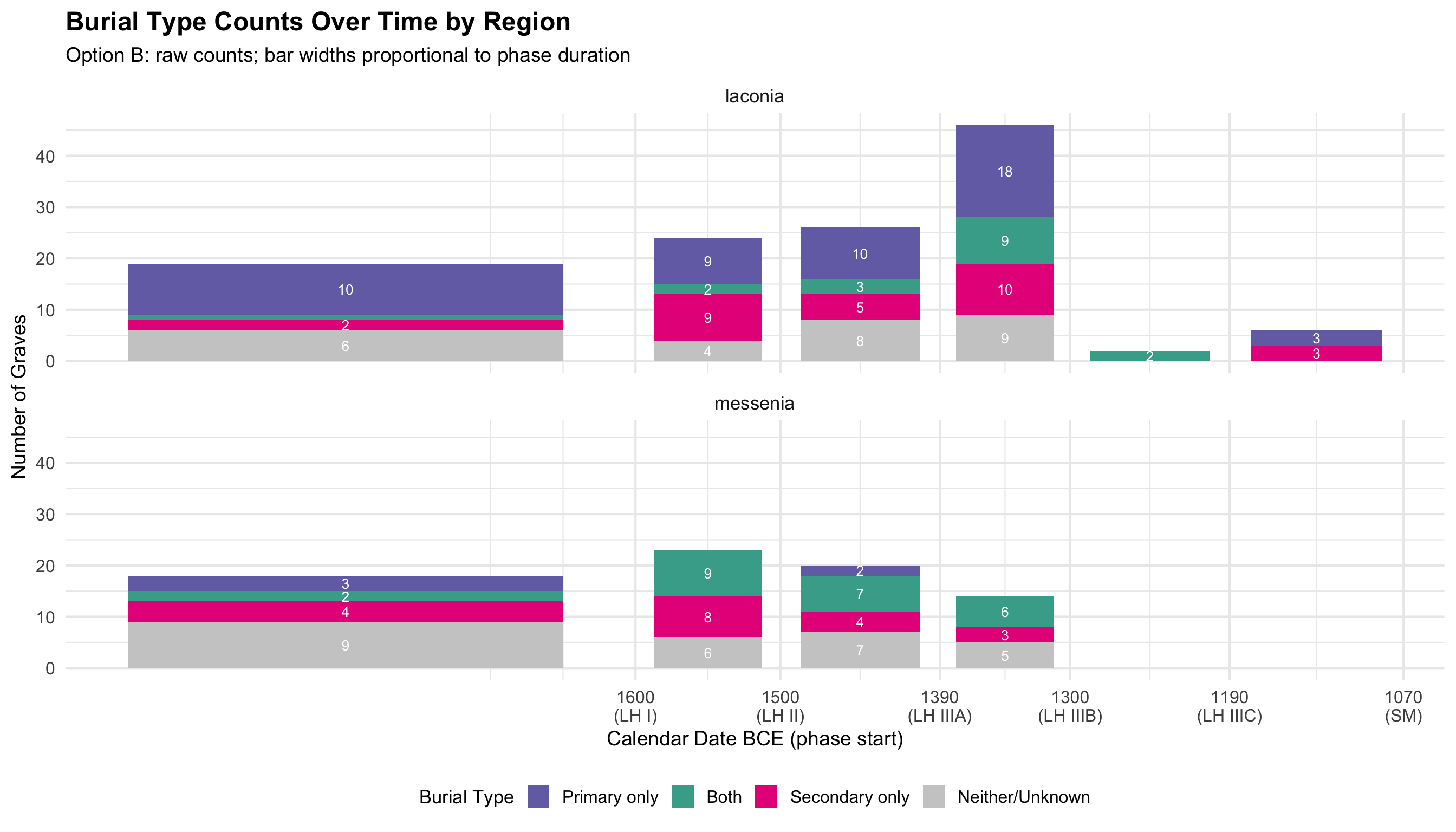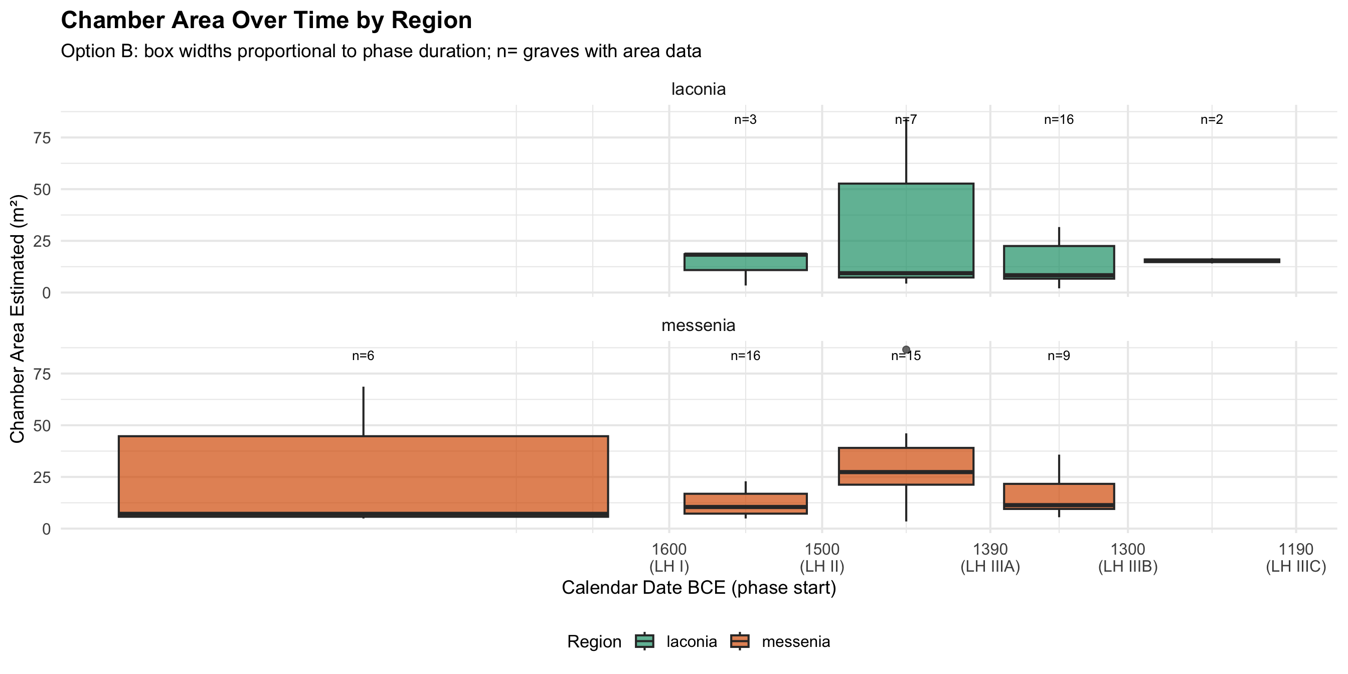 subtitle = "Option B: box widths proportional to phase duration; n= graves with area data",