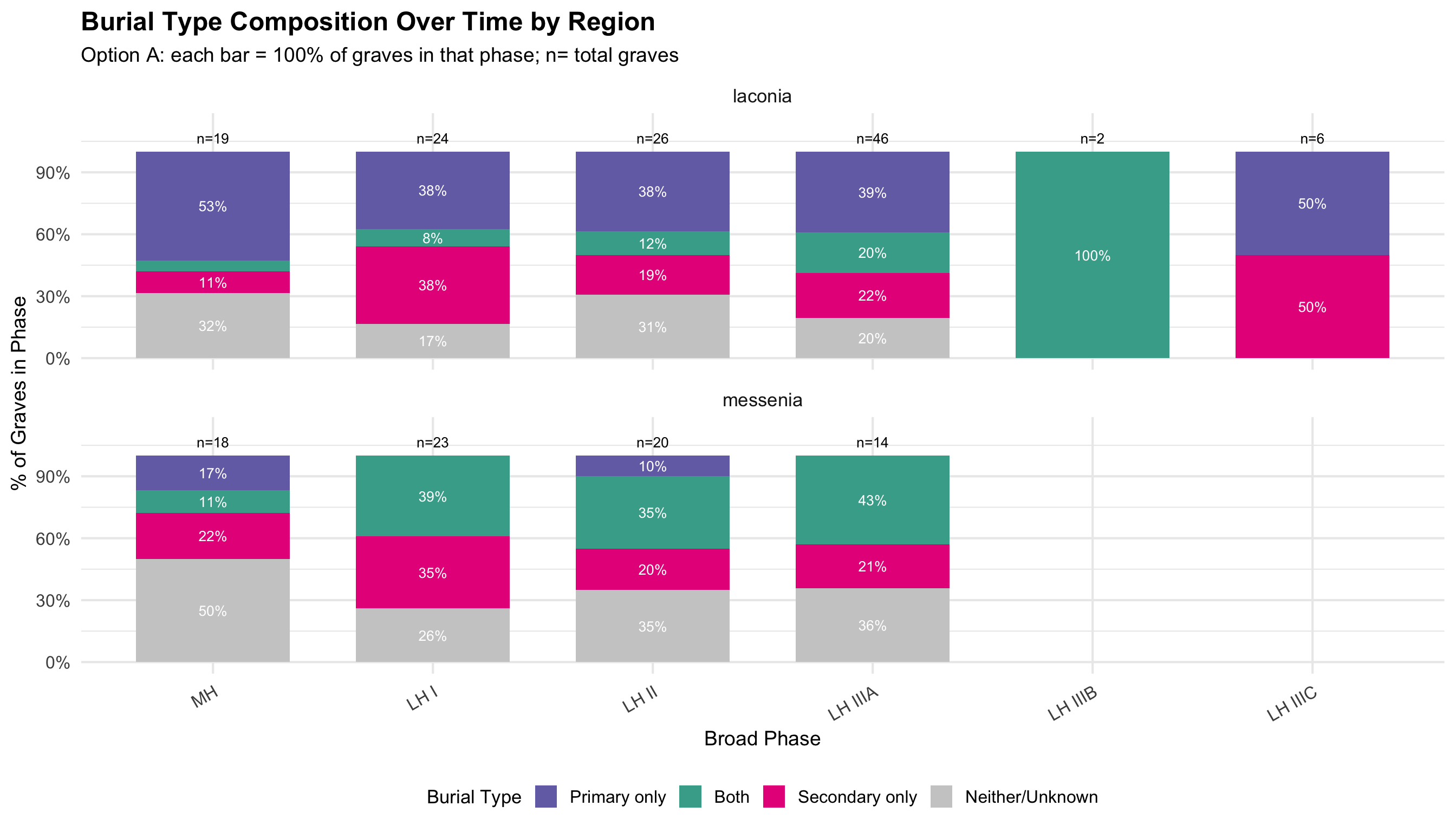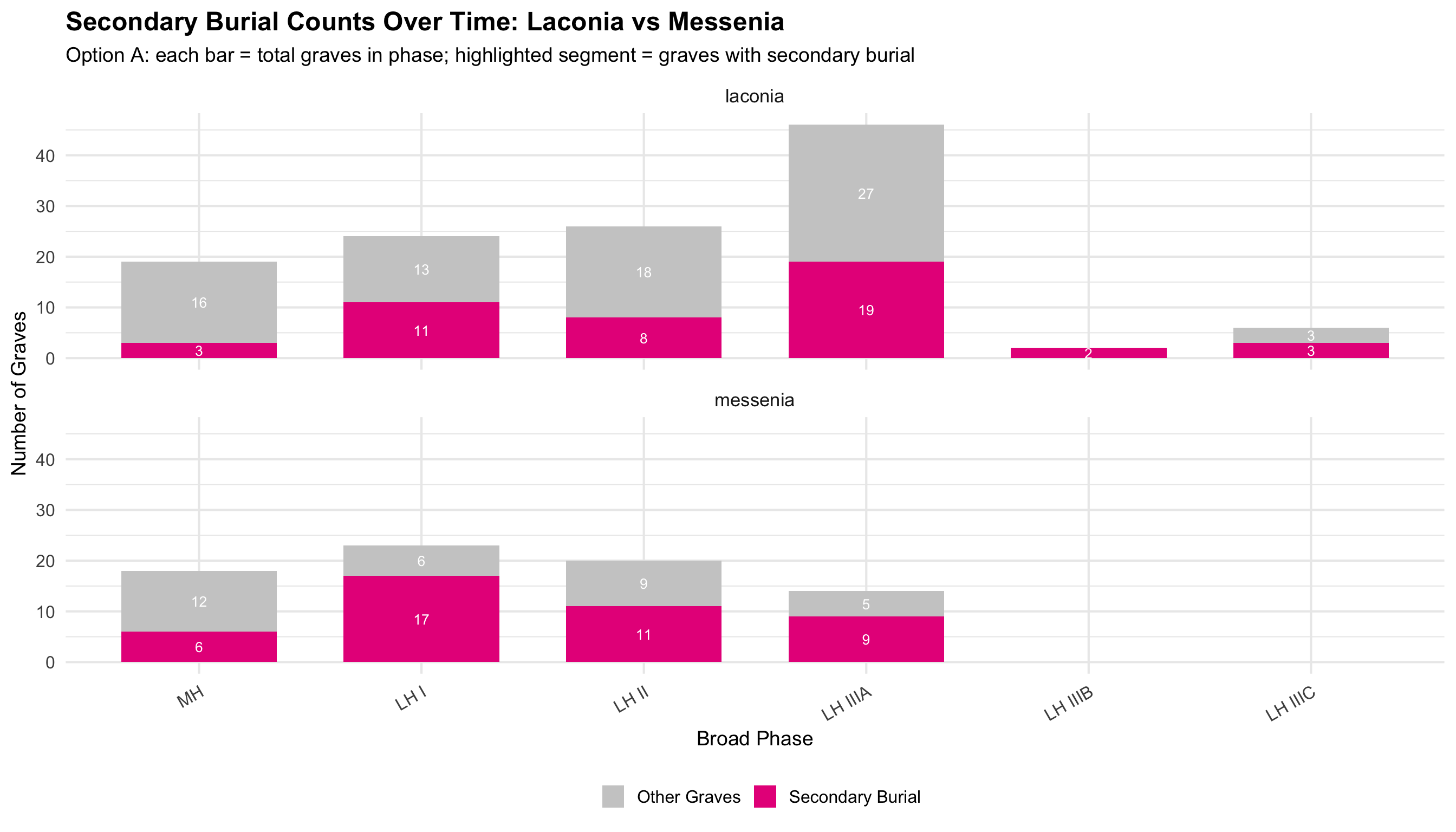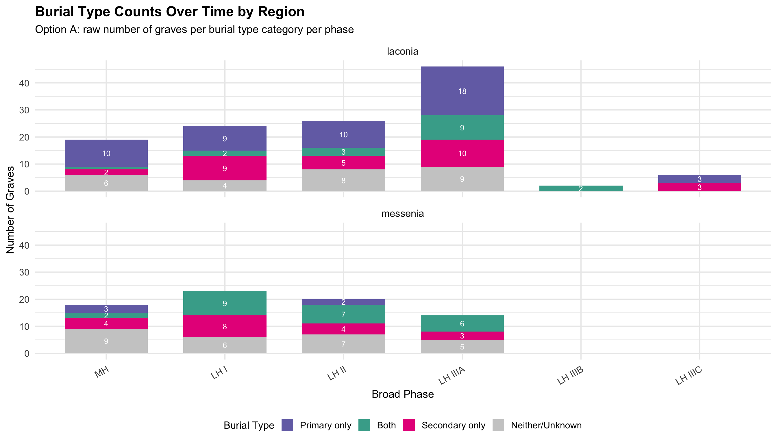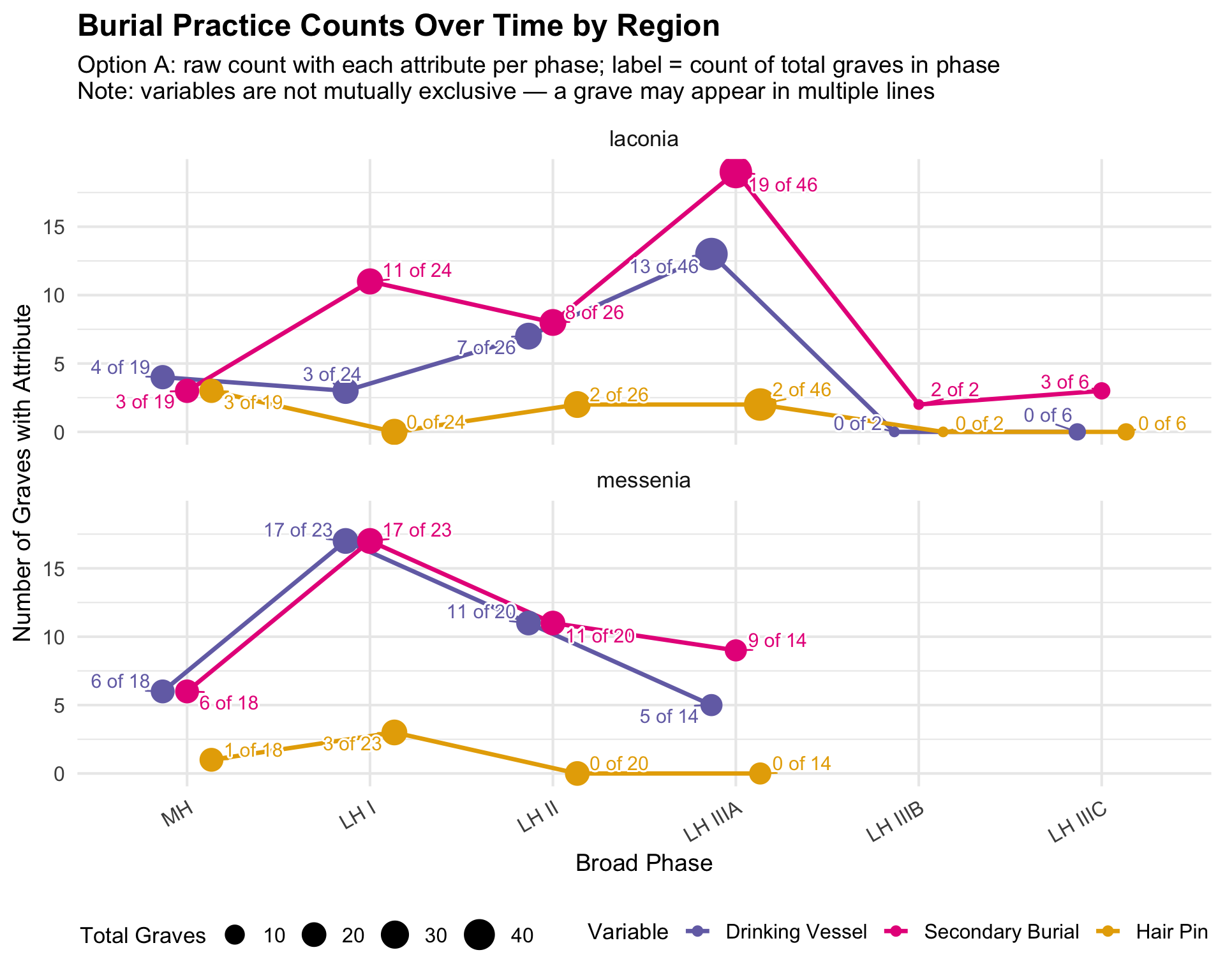 subtitle = "Option A: raw count with each attribute per phase; label = count of total graves in phase\nNote: variables are not mutually exclusive — a grave may appear in multiple lines",