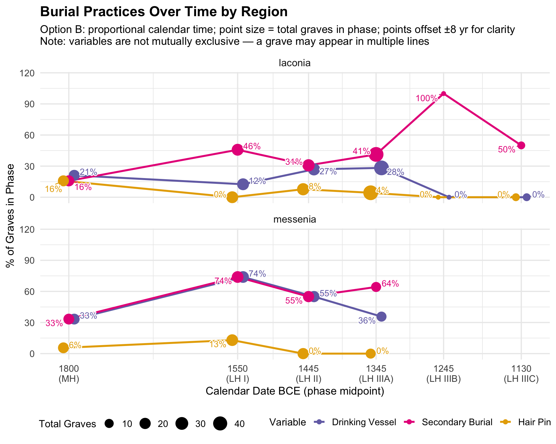 subtitle = "Option B: proportional calendar time; point size = total graves in phase; points offset ±8 yr for clarity\nNote: variables are not mutually exclusive — a grave may appear in multiple lines",