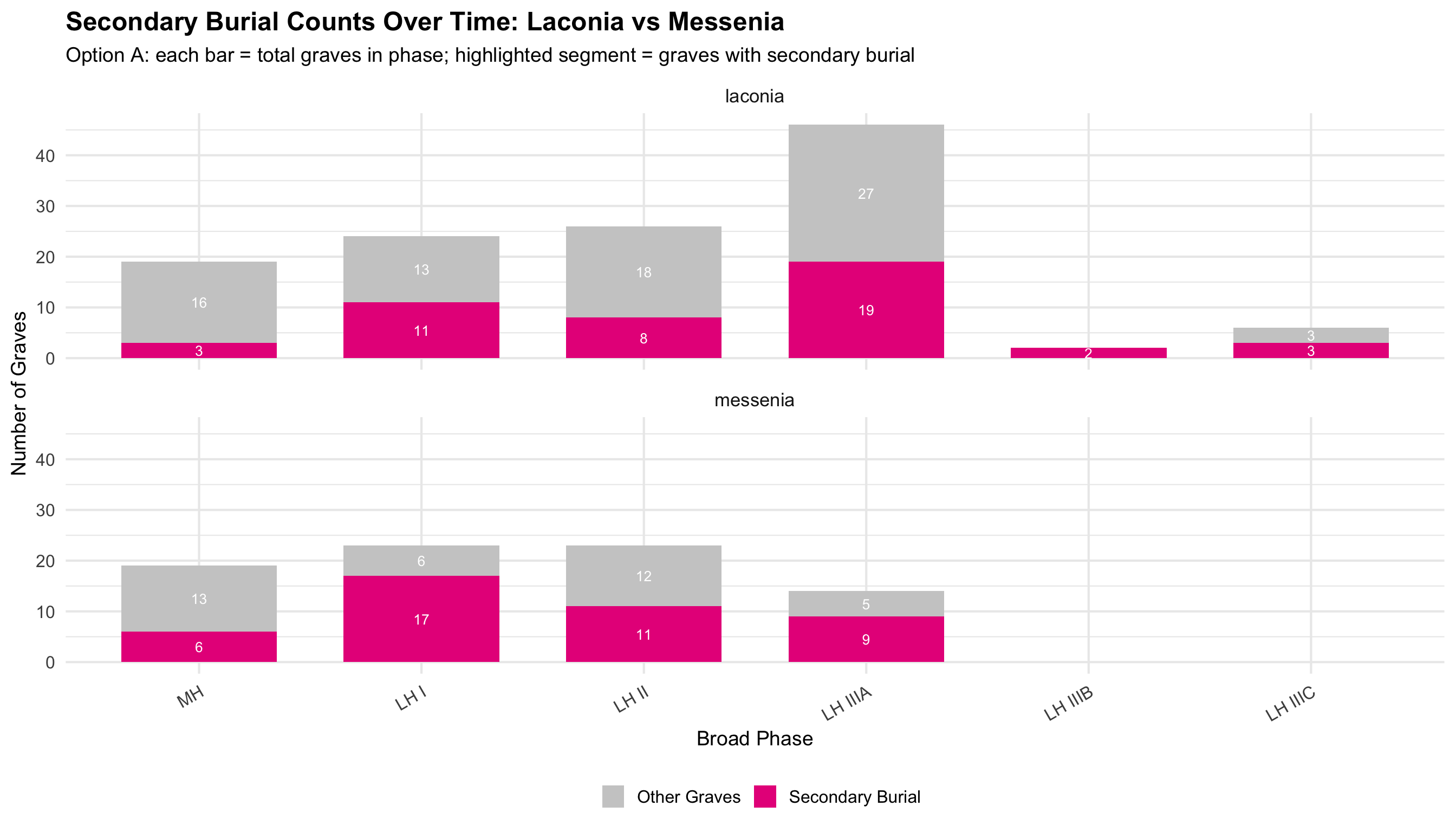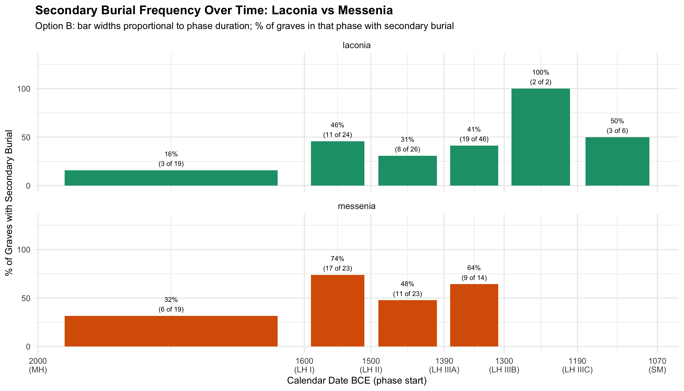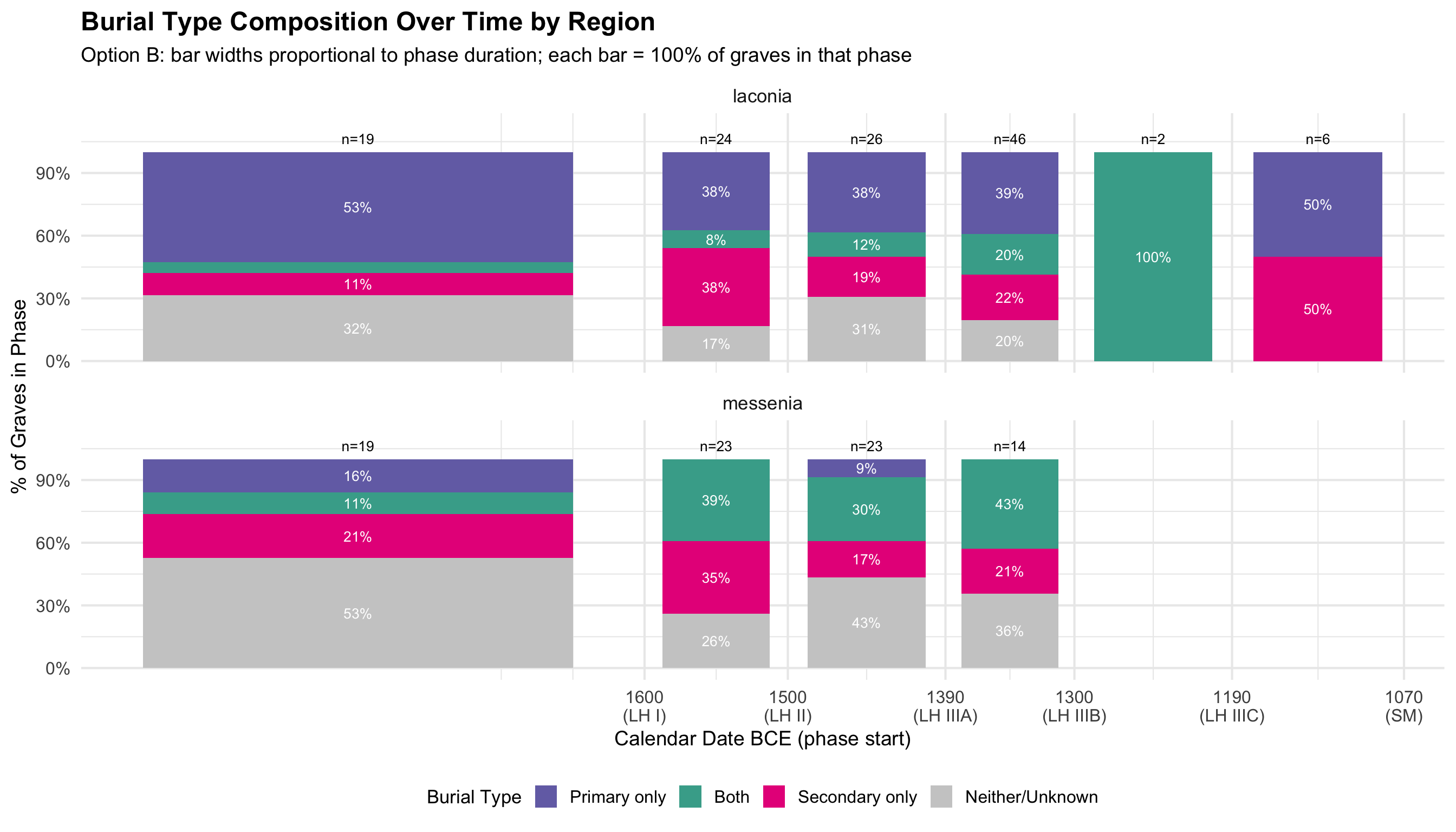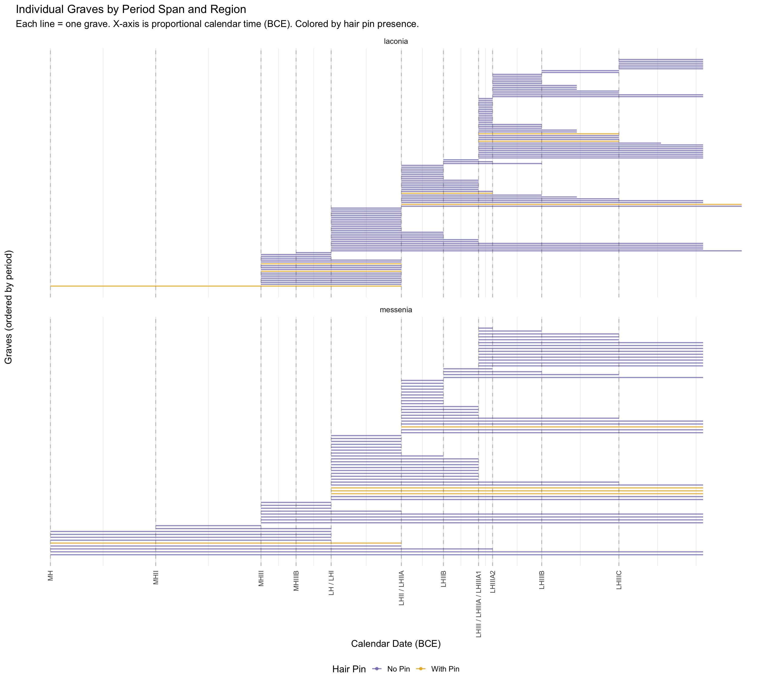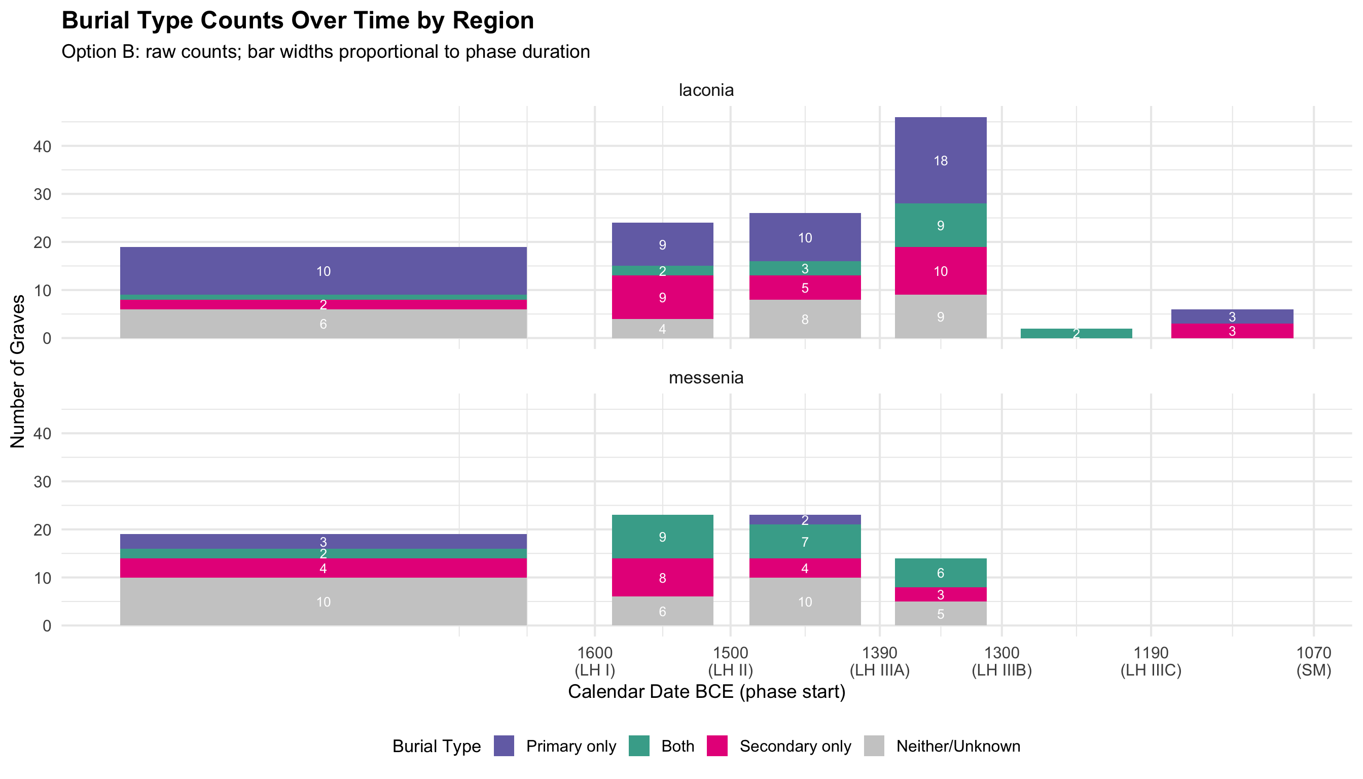 This document presents the quantitative analyses underlying the thesis. The dataset comprises funerary contexts from Laconia and Messenia spanning the Middle Helladic through Late Helladic periods (approximately 2000–1070 BCE). Each record corresponds to a single tomb or grave feature and includes information on tomb type, chronological attribution, burial practice, and the presence of drinking vessels, skeletal remains, and hair pins.