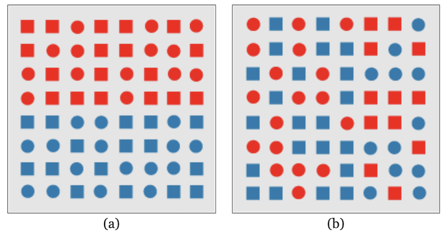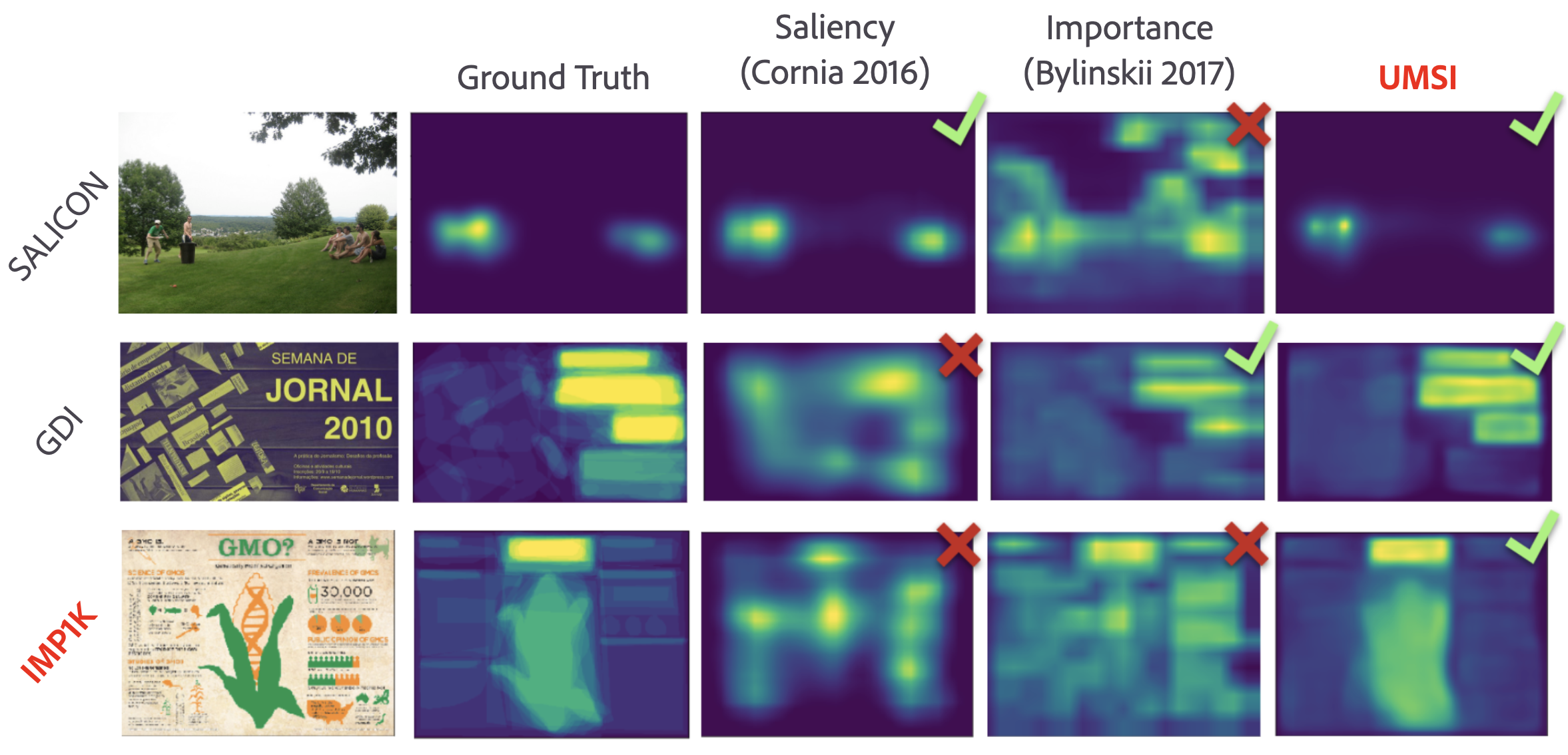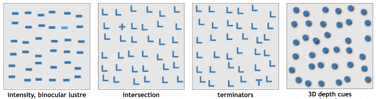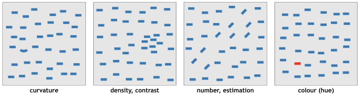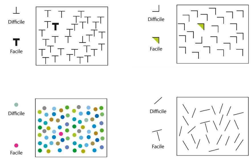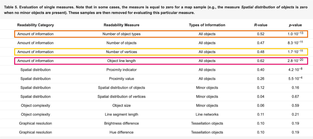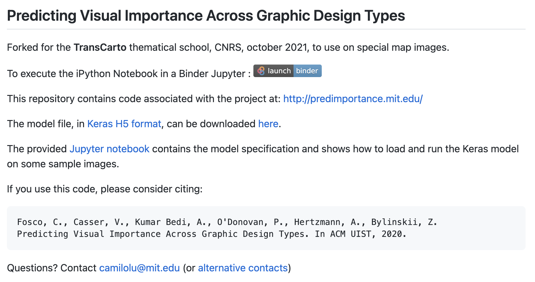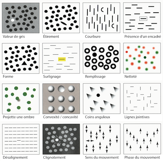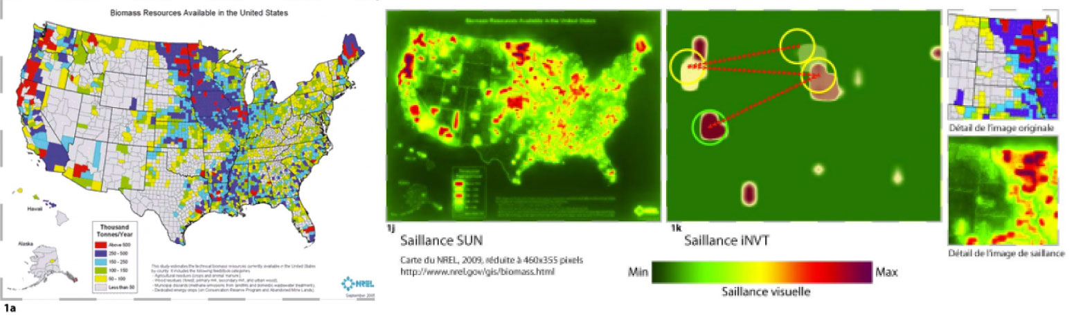 </p><p style="margin-left: 140px; padding-top: 20px"> L'image <b>interactive</b>, qui doit permettre d'<b>explorer</b> des composantes spatiales d'une information.</p> --- class: middle # Différents besoins de lisibilité des images cartographiques, selon leur fonctionnement -- - **Quelle adaptation de l'image à la *perception visuelle* humaine ?** > **→** Fonctionnement de la perception visuelle des images (graphique et cognitive) -- - **Quelle adaptation de l'image à une bonne expression de son contenu pour sa fonction ?** > **→** Conception et *design graphique* -- - **Quelle complexité cognitive, quelle *expérience du public* face à ce type d'image ?** > **→** État de l'art et études de *réception*, enquêtes. -- - **Quel *accompagnement* du public pour sa compréhension ?** > **→** Les lectures comme processus : animation, *storytelling*, interactivité, voire formation. --- ### L'évaluation de la complexité d'une image : typologie Plusieurs chercheurs ont essayé de mesurer la complexité visuelle, comme indice de la complexité de lecture. Cependant, cette complexité est multiple : .center[] [→ un article sur le sujet](https://journals.openedition.org/cybergeo/25271) --- # 2. Notions de perception visuelle des images graphiques **→** Principes de base de la perception visuelle **→** Conséquences pour la composition d'images cartographiques --- # 2.1 La perception visuelle n'est pas automatique, immédiate et parfaite (Contrairement à ce que notre cerveau tend à nous faire croire !) **→** Quelques illusions d'optique. [Pour aller plus loin : les travaux d'Akiyoshi Kitaoka](http://www.ritsumei.ac.jp/~akitaoka/index-e.html) --- class: middle .center[] > Illusion de Mond-Vergleich --- class: middle .center[] > Illusion de Mond-Vergleich --- class: middle .center[] > Spirale ou cercles ? --- class: middle .center[] > Spirale ou cercles ? : la solution --- # Perception visuelle : plusieurs niveaux d'attention ** a. La perception pré-attentive** > [Ch. G. Healey, "Perception in Visualization"](https://www.csc2.ncsu.edu/faculty/healey/PP/). --- .center[] .center[] .center[] --- **→** Des compléments apportés par C. Ware .center[] > "C. Ware, InfoViz, perception for design", 2008. --- ### Certaines variations visuelles sont plus efficaces que d'autres Car repérées par des neurones spécialisés, plus rapides, mais il faut aussi tenir compte de la perturbation. La variation de couleur seule (a) est plus lisible qu'un mélange couleur + forme (b). .center[] --- ### Mais la perception est aussi rapidement *perturbée* par la complexité .center[] --- class: middle **→** On retrouve des éléments de la **sémiologie graphique**, des variables rétiniennes > Cependant, une image cartographique, une planche d'infographie, est un ensemble plus complexe qu'une variation unique de formes simples : c'est une image *mise en page.* -- - Concrètement, la lecture d'une image infographique nécessite *plusieurs lectures successives*, avec des **réglages**, des **filtrages** différents de la perception, pour repérer des relations variées entre éléments, selon le type de graphique. -- - Ces lecture successives peuvent être guidées, encouragées, par une organisation de la page, la **composition graphique**, et par les principes du **storytelling**. --- **b. La perception post-attentive, la prise en compte de formes multiples, organisées : *la composition graphique* ** De nombreuses ressources existent pour guider la composition graphique, souvent sous des appellations comme "*principes*", "*règles*", voir "*lois*". Elles restent subjectives, liées à l'expérience et sont rapidement perturbées par la complexité visuelle. --- - **Le sens de lecture** .center[] --- class: middle .center[] --- class: middle .center[] --- - **La hiérarchie visuelle** **→** Le sens de lecture est aussi guidé par le *poids visuel* des éléments graphiques, et leur organisation dans la page. L'idée est de proposer des *gradients perceptibles* de certaines propriétés pour guider la lecture (ou la perturber rhétoriquement) : - Taille / échelle relative - Couleur / Contraste - Alignement / liaison - Répétition / rythme - Proximité / espace vide --- ## Illustration de ces principes À partir des dessins d'un [tutoriel de Visme](https://visme.co/blog/visual-hierarchy/) **Taille / échelle** .center[] --- class: middle **Couleur / contraste** .center[] --- class: middle **Alignement / Liaison** .center[] --- class: middle **Répétition / rythme** .center[] --- class: middle **Proximité / espace vide** .center[] --- ## Certaines caractéristiques graphiques vont aussi avoir des effets esthétiques/rhétoriques - L'équilibre / le déséquilibre - la tension - Les harmonies colorées - La capacité d'évocation du contenu - L'effet de surprise, de découverte --- **Illustration avec deux posters primés au FIG**  Liens : [Poster Khumbu, UMR Passages](http://mappemonde-archive.mgm.fr/num45/mois/moi15101.html) - [Poster Nuit étoilée, Collectif Renoir](https://renoir.hypotheses.org/1174]) --- class: middle # 3. Existe-t'il des outils pratiques pour évaluer la lisibilité d'une image facilement ? **→ Oui !** Grâce aux progrès de la simulation de la vision et de l'intelligence articificielle (aidée par le travail de petites mains...) --- ## Comment tester la lisibilité de ses mise en pages? -- - Le **flou** -- - La mesure de la **complexité graphique** -- - L'évaluation de la **complexité de lecture** : - La simulation de systèmes de perception (saillance visuelle) - Une IA entraînée sur des infographies pour indiquer les zones d'importance visuelle dans une image. --- ### Le flou Longtemps, la seule technique disponible pour évaluer la hiérarchie visuelle d'une image complexe était le flou. -- Un outil en ligne : [Pine Tools](https://pinetools.com/blur-image). .center[] --- class: middle ### L'évaluation de la complexité visuelle Rappel : les différent