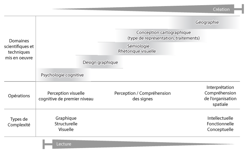# **Les images cartographiques** ## Leur lecture, leur fonctionnement :<br> prenons un peu de recul #### École thématique TRANSCARTO, Aussois <br> .left[Laurent Jégou - jegou@univ-tlse2.fr] .left[UT2J / UMR LISST-Cieu, 21 oct 2021] .logo1[ <img src ="img/logo-Universite-Jean-Jaures.png"></img> ] .logo2[ <img src ="img/cnrs.gif"></img> ] --- class: middle # Programme -- 1. Le contexte, le **fonctionnement** de la carte comme image -- 2. La **lisibilité** de l'image : principes -- 3. Comment **l'évaluer** et **l'améliorer** ? -- 4. De **nouveaux supports** pour mieux accompagner les lecteurs --- # 1. Le contexte Pour prendre du recul, il faut s'interroger sur *l'acte de cartographier*, ses auteurs et leurs objectifs. -- Pendant longtemps, la production de cartes a été comprise, sous-entendue, selon un contexte de communication (théorie de l'information, C. Shannon). --- #Le paradigme de la communication  > "Processus de l’information cartographique", A.A. Moles, 1964. -- L'**auteur** concevait le document, en demandait la production par un.e **cartographe**, en lui fournissant des données. Le document était ensuite **édité sur papier**, puis **diffusé**. La carte diffusée était potentiellement **reçue** par un **lecteur** ou une **lectrice** (relativement passif.ve). --- class: middle **Ce paradigme impliquait que :** -- - La carte était faite une fois pour toutes >**→** C'est un document figé, dont on ne maîtrise pas l'utilisation qui en est faite. -- - Elle devait être rapidement lisible, donc utiliser des formes simples et reconnaissables >**→** L'enjeu est donc du côté du langage graphique, à maîtriser par le cartographe et à apprendre du côté des lecteurs. -- - Elle était fournie comme image isolée, avec parfois un bloc de texte descriptif >**→** Elle devait se comprendre toute seule, sans accompagnement discursif. --- #Un paradigme remis en cause Cette façon de concevoir la production de carte est souvent sous-entendue, elle constitue un *paradigme*, qui est logiquement remis en cause par les évolutions des *pratiques* et des *techniques*. Elle présente la cartographie selon un angle *positiviste*, voire scientiste, ce qui évacue toute une série d'autres *fonctionnements* de la carte... [Un ouvrage essentiel : "Cartography, the Ideal and its History" de M.H. Edney](https://journals.openedition.org/mappemonde/1711) .center[] --- - la carte **performative**, qui vise à faire réagir, de propagande, rhétorique (vision *post-moderniste*, B. Harley) .center[] > Brian J. Harley, The New Nature of Maps, 2001 --- - la carte comme **outil d'analyse**, moyen de découvrir des phénomènes et des relations, dans un *processus d'exploration*, de **→** **transformation** (paradigme *analytique*, W. Tobler, K. Clarke, vers la géomatique et les SIG) .center[] > K. Clarke, Analytical and Computer Cartography, 1990. --- - la carte comme **outil d'organisation d'une communauté** sur son territoire (paradigme *participatif*, M. Noucher, Th. Joliveau) .center[] > N° spécial de l'Information Géographique n°774, 2013 --- - la carte comme **outil de visualisation de *son* propre territoire et de navigation**, adaptée et centrée sur sa position actuelle (paradigme de *l'égo-cartographie*). .center[] --- - la carte *décorative* a valeur esthétique, historique, émotive, (d'où son utilisation dans des publicités...). .center[] >L. Boucher, affiche publicitaire Air France, 1937 --- - la carte *imaginaire* ou *poétique*, aussi à valeur esthétique, rhétorique, qui vise à faire réfléchir. Souvent, on ne la comprend pas immédiatement. .center[] > Terra Forma, F. Aït-Touati, A. Arènes, A. Grégoire, éditions B42, 2019. --- class: middle # Prendre du recul .center[