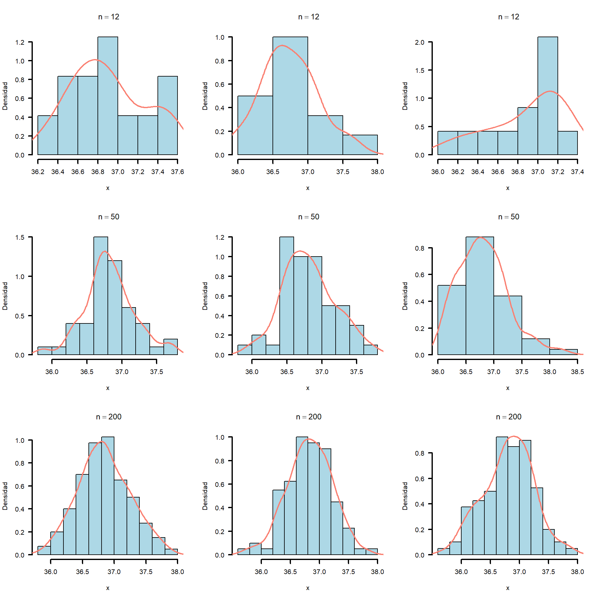 Con una cantidad de datos de la muestra suficientemente grande (n>30) la violación del supuesto de la normalidad no debería causar mayores problemas. Esto implica que podemos ignorar la distribución de los datos y usar pruebas paramétricas si estamos tratando con muestras de gran tamaño.
