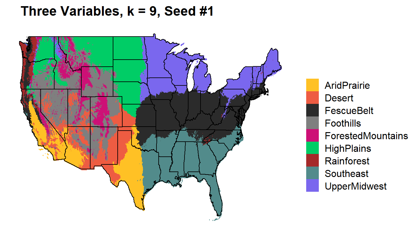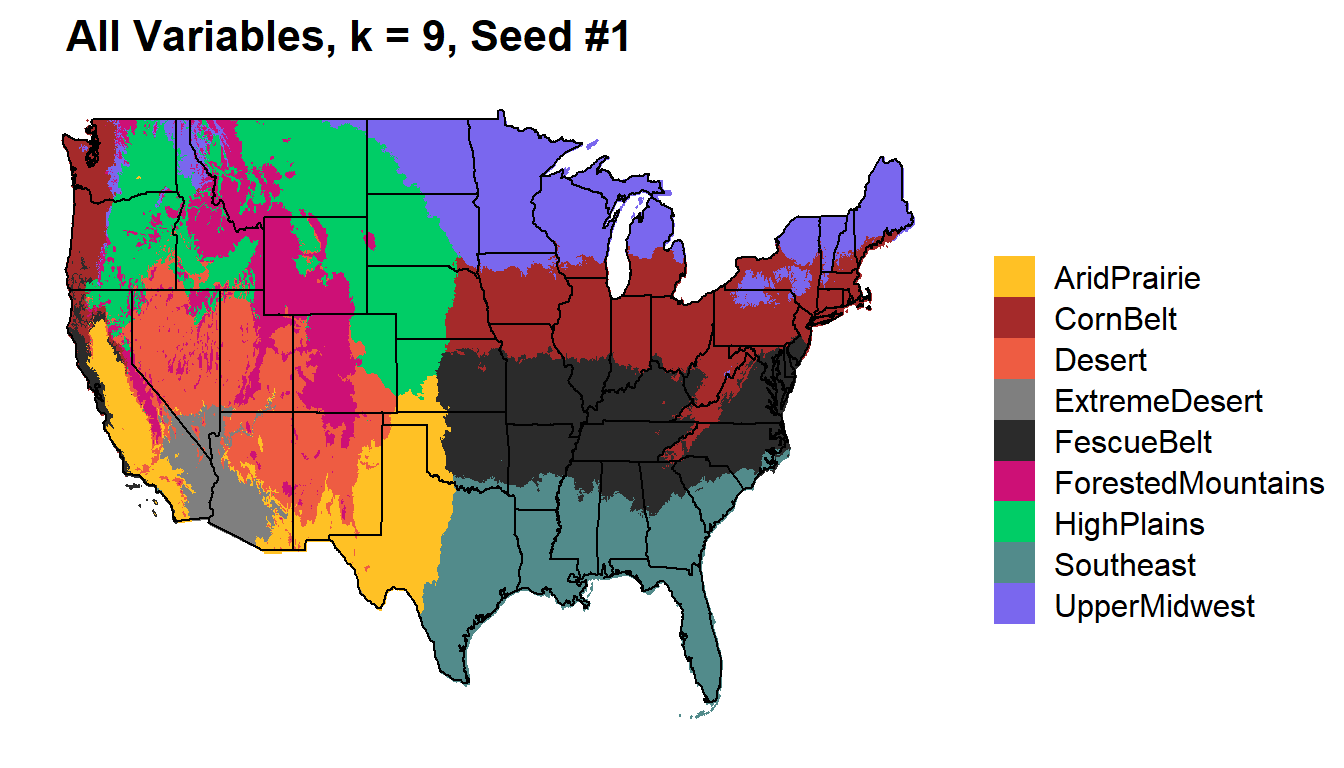 colorkey = c("HighPlains"="springgreen3", "UpperMidwest"="slateblue2", "Desert"="tomato2", "AridPrairie"="goldenrod1", "FescueBelt"="gray17", "Rainforest" = "brown", "CornBelt"="brown", "Southeast"="darkslategray4", "ForestedMountains"="deeppink3", "Foothills" = "gray50", "ExtremeDesert" = "gray50")