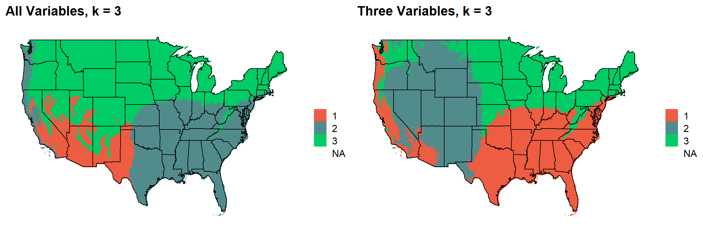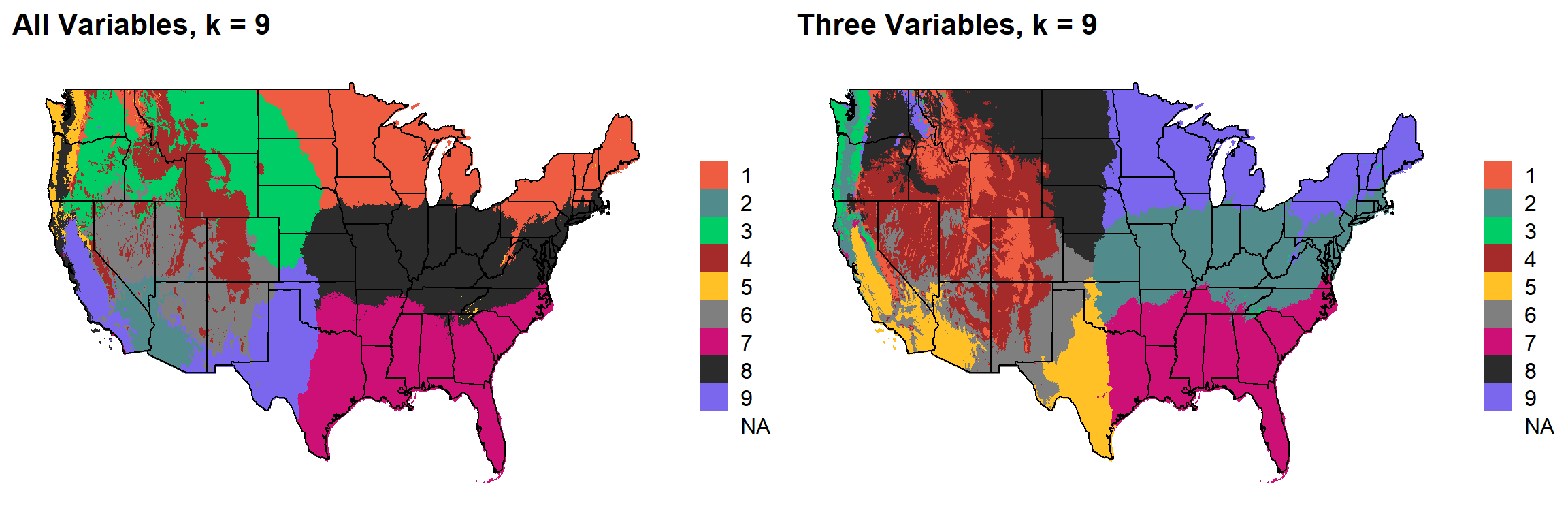 These are the resulting maps from using the full PRISM dataset (all 8 variables) or just three (Temperature, Precipitation, Elevation).
