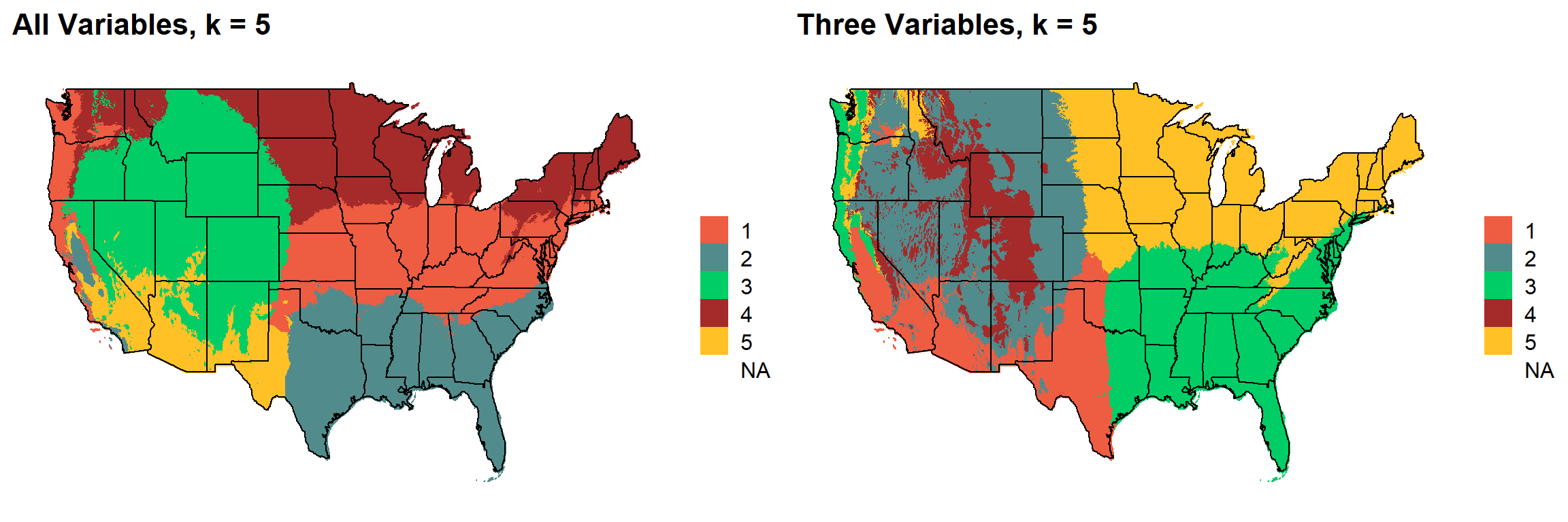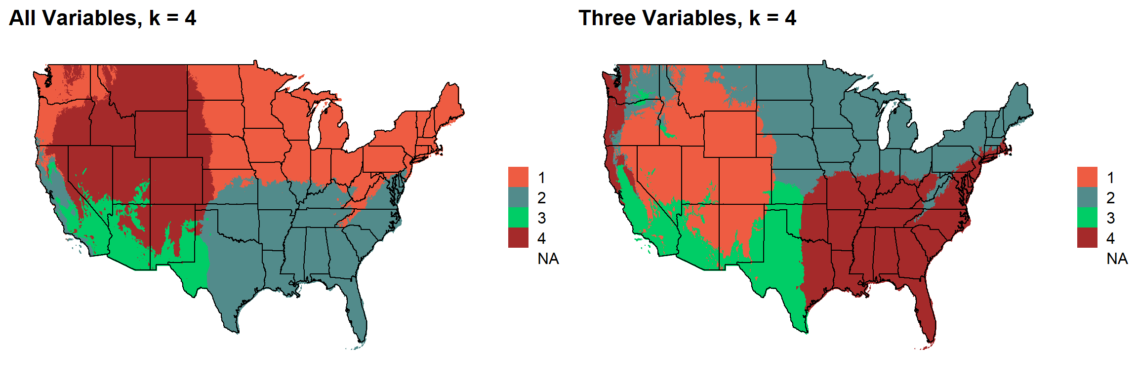 This uses k-means clustering and 30-year normal climate variables to divide the United States into distinct ecoregions.