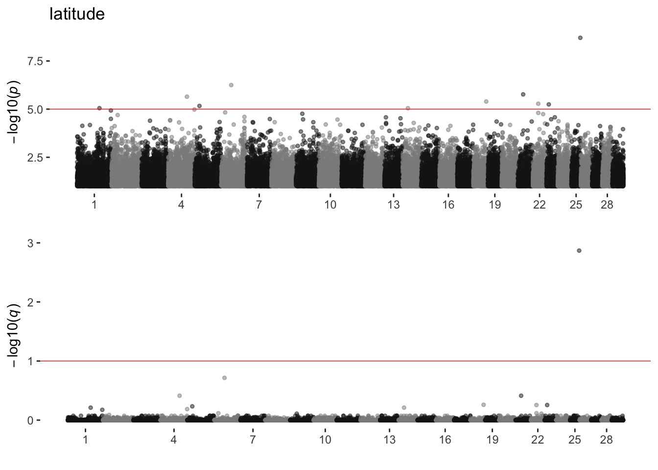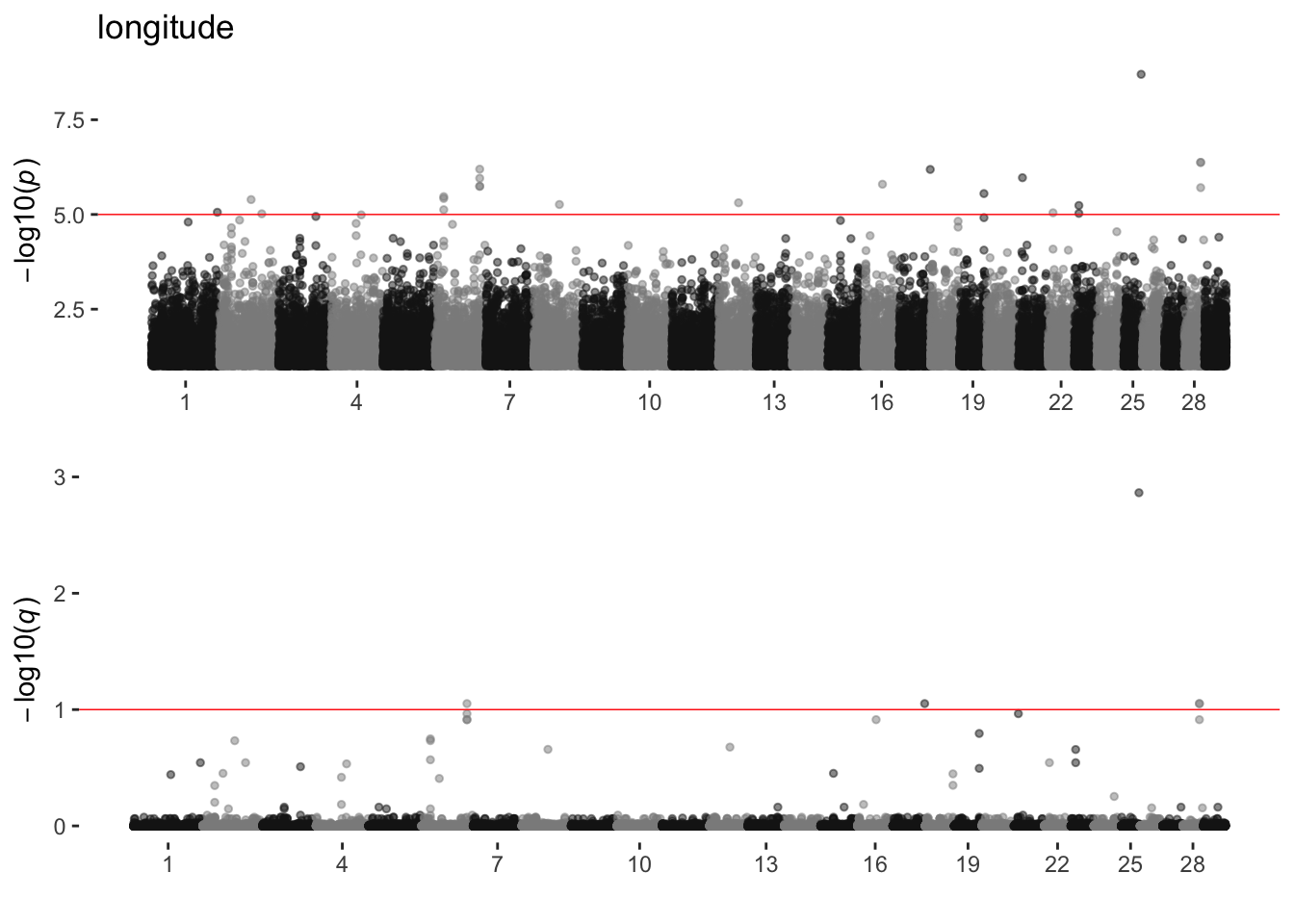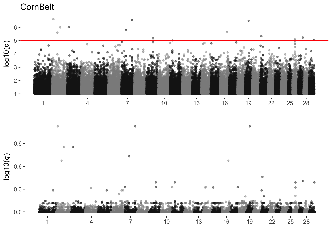 Manhattan plots with both p and q values