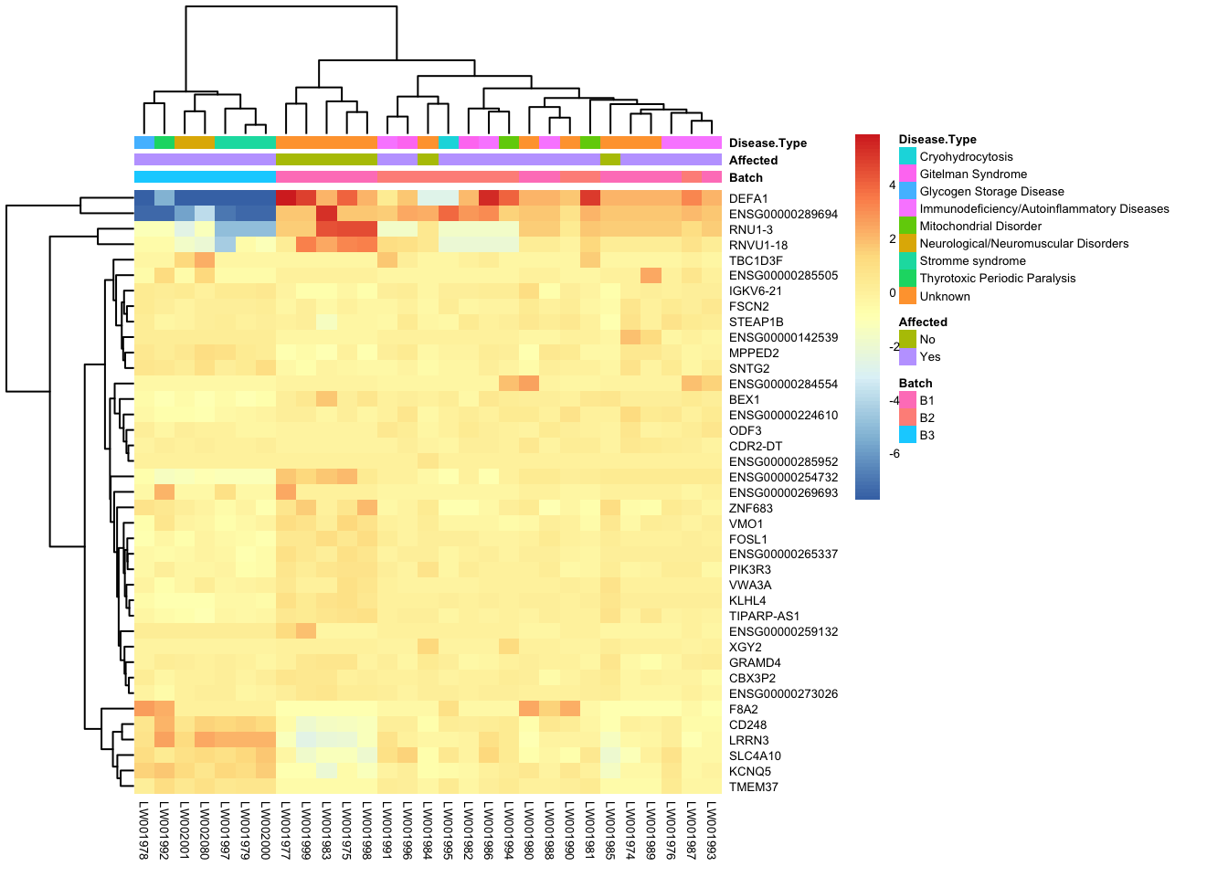 Below is a heatmap highlighting the expression of our genes of interest across batch, disease type, and affected status.