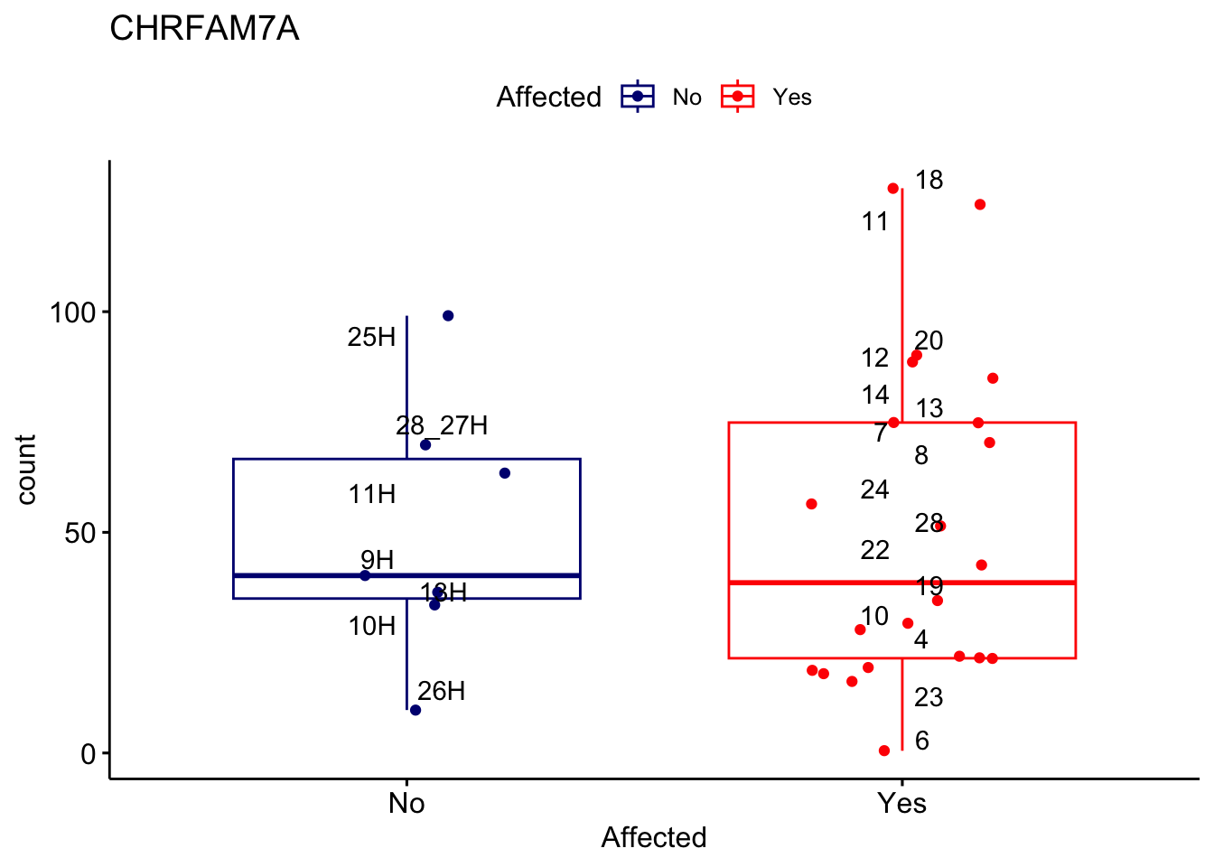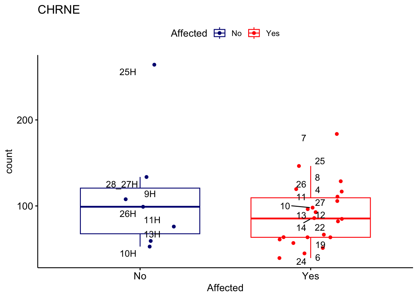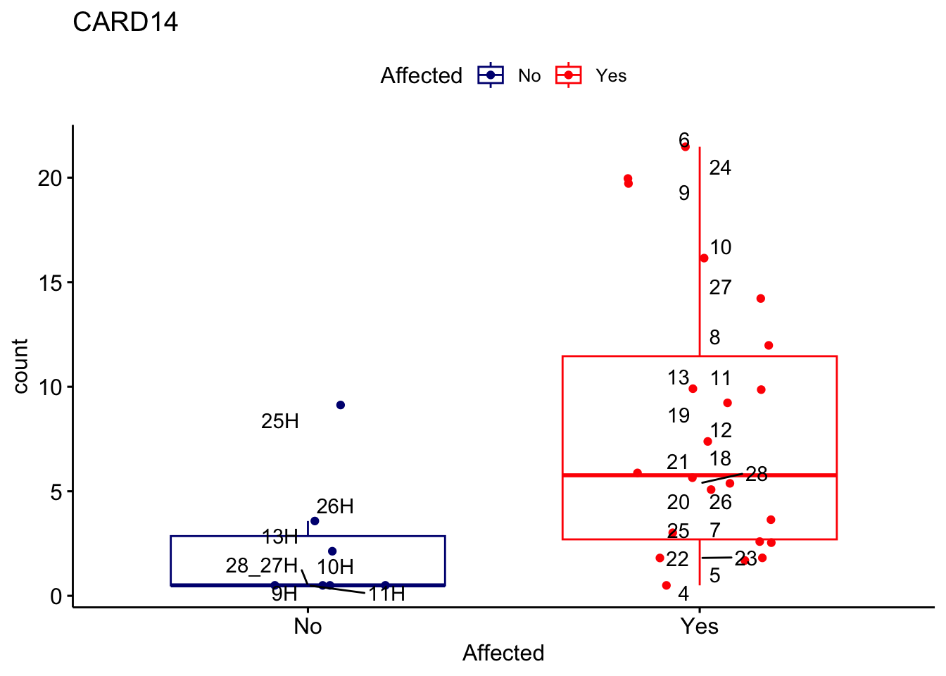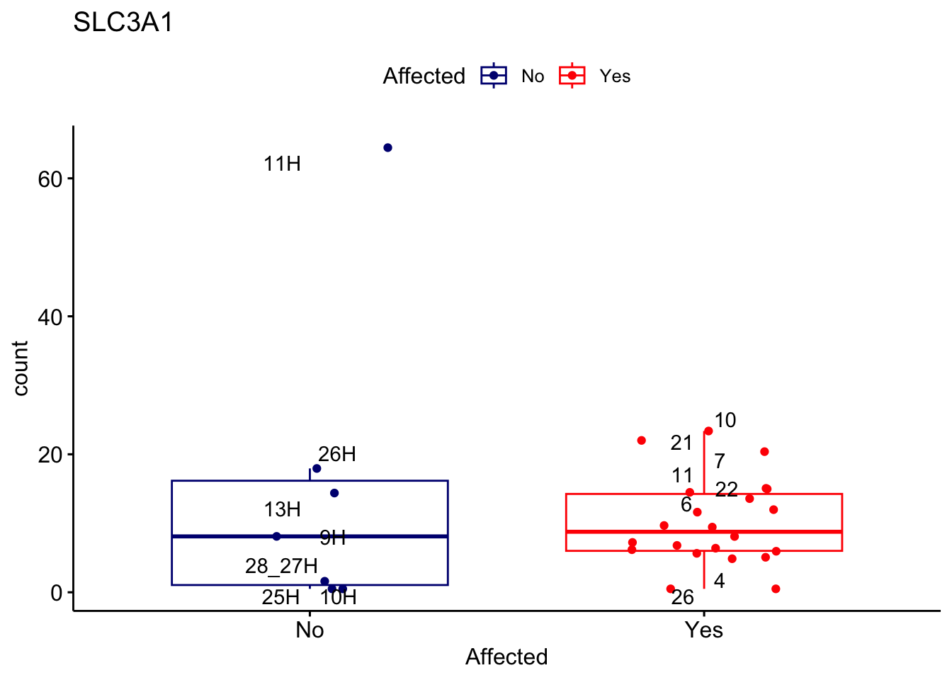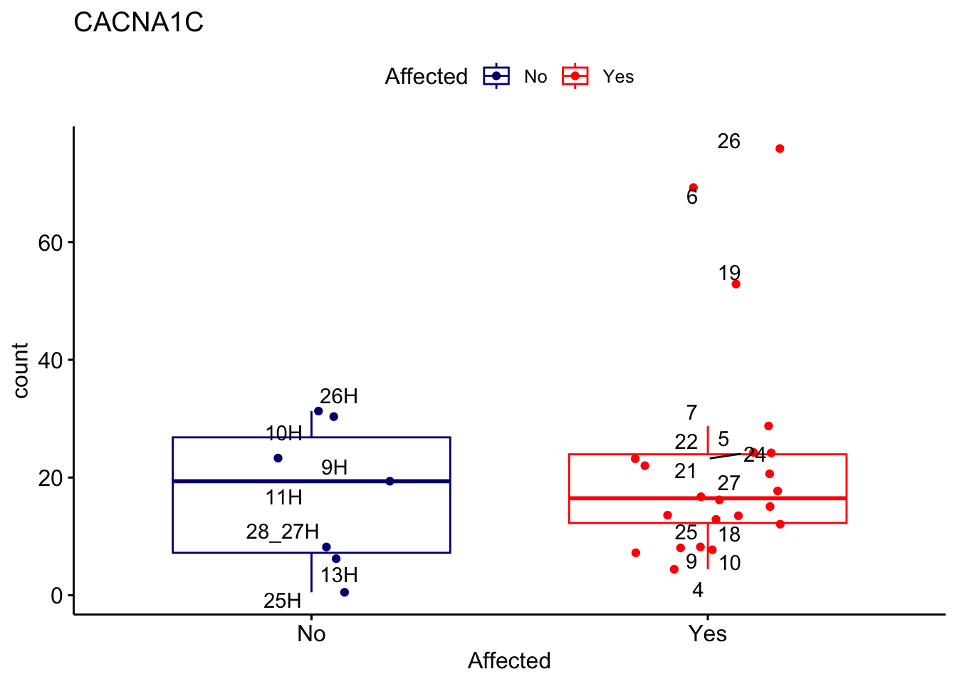 ggplot_box <- ggboxplot(d, x="Affected", y="count", add = "jitter", color = "Affected", palette = c("navy", "red"), title = gene_name) + geom_text_repel(aes(label = rownames(d)))