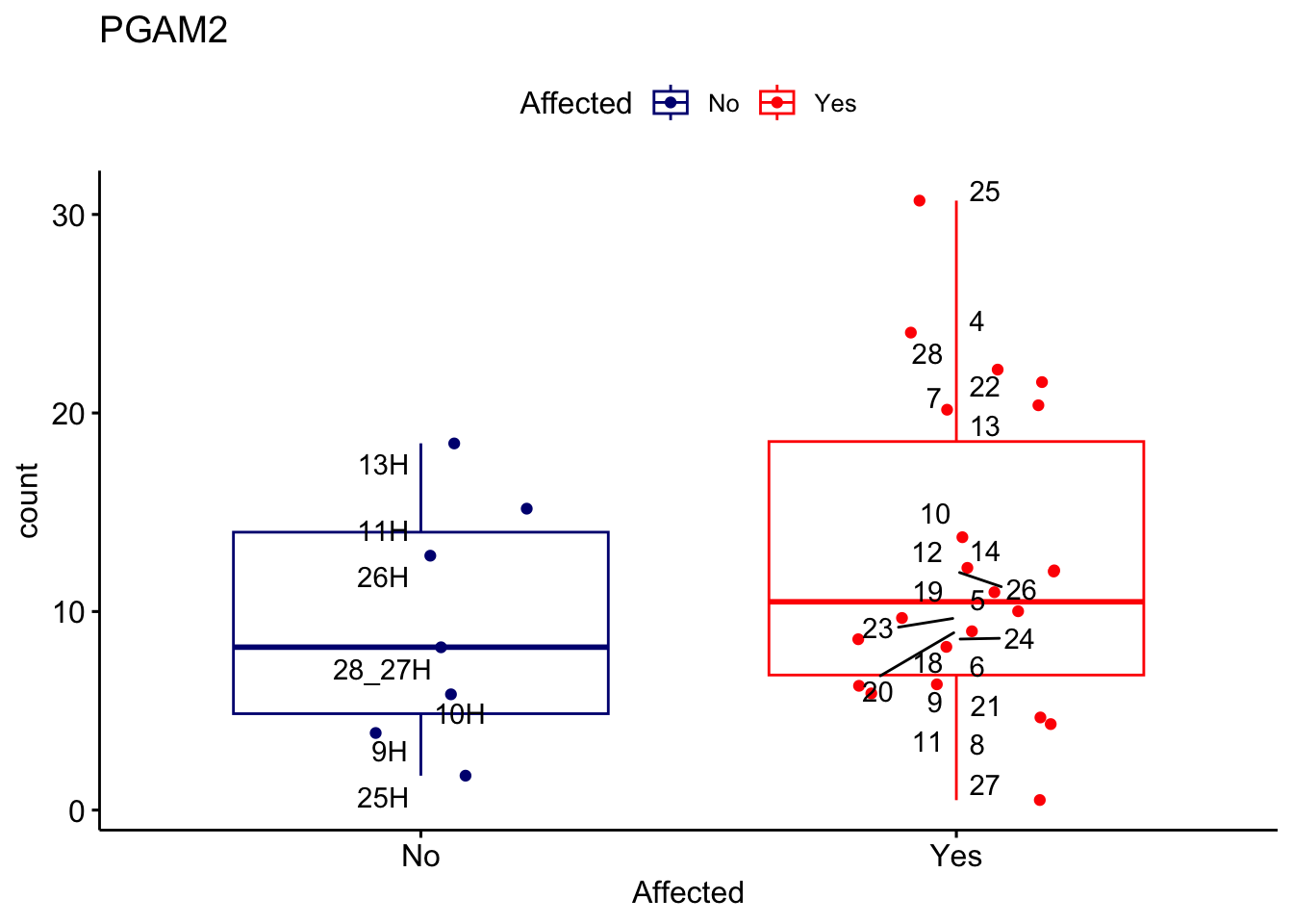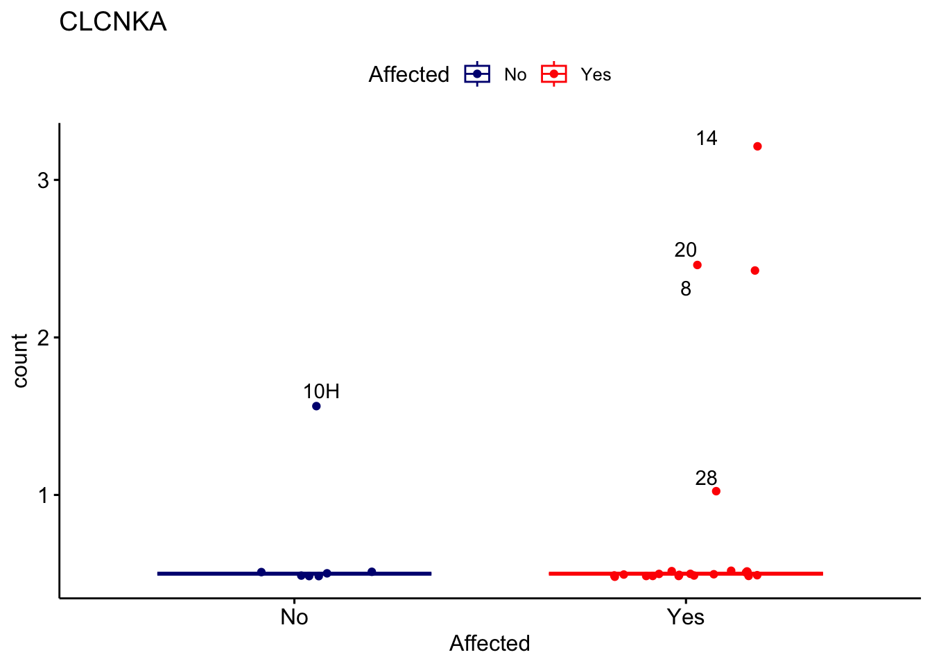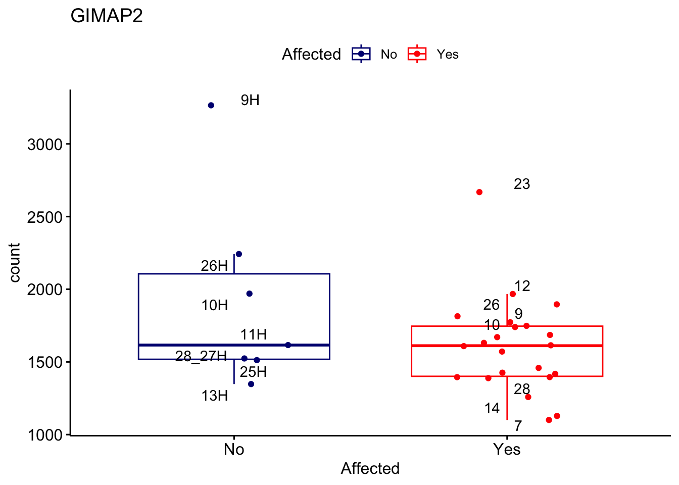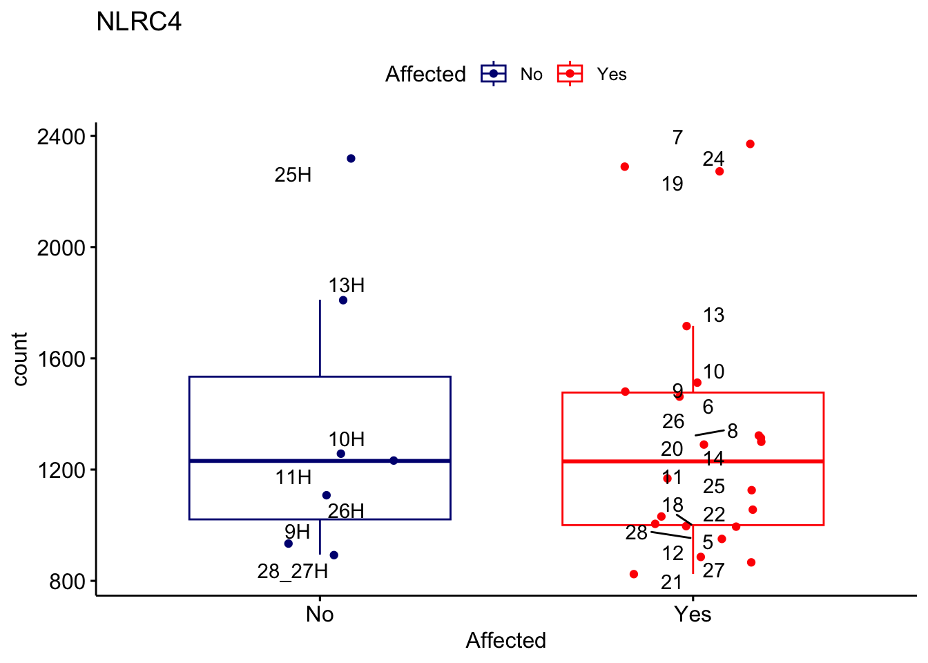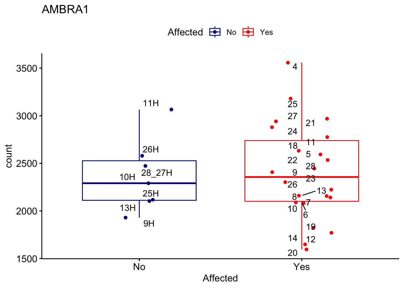 ggplot_box <- ggboxplot(d, x="Affected", y="count", add = "jitter", color = "Affected", palette = c("navy", "red"), title = gene_name) + geom_text_repel(aes(label = rownames(d)))