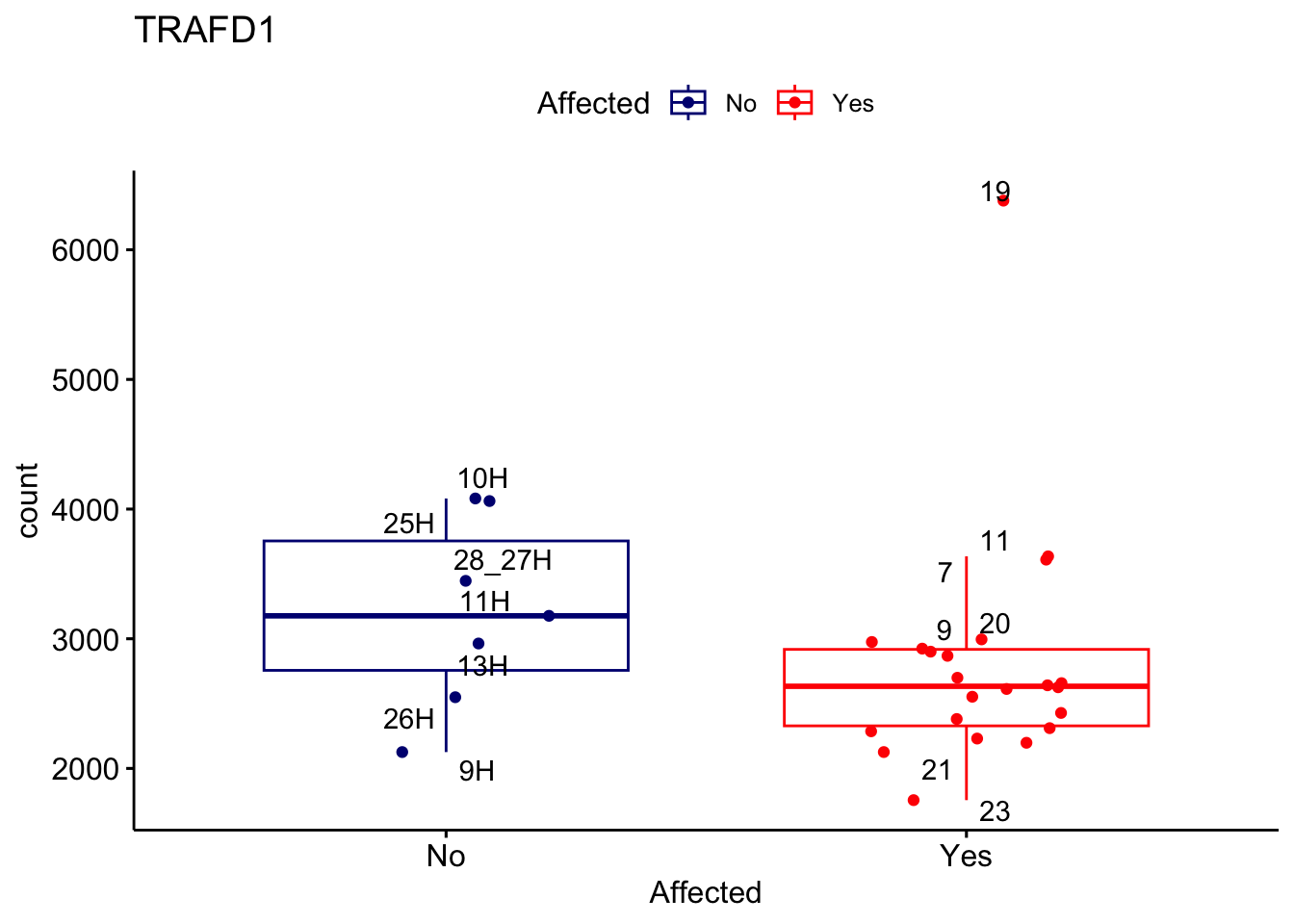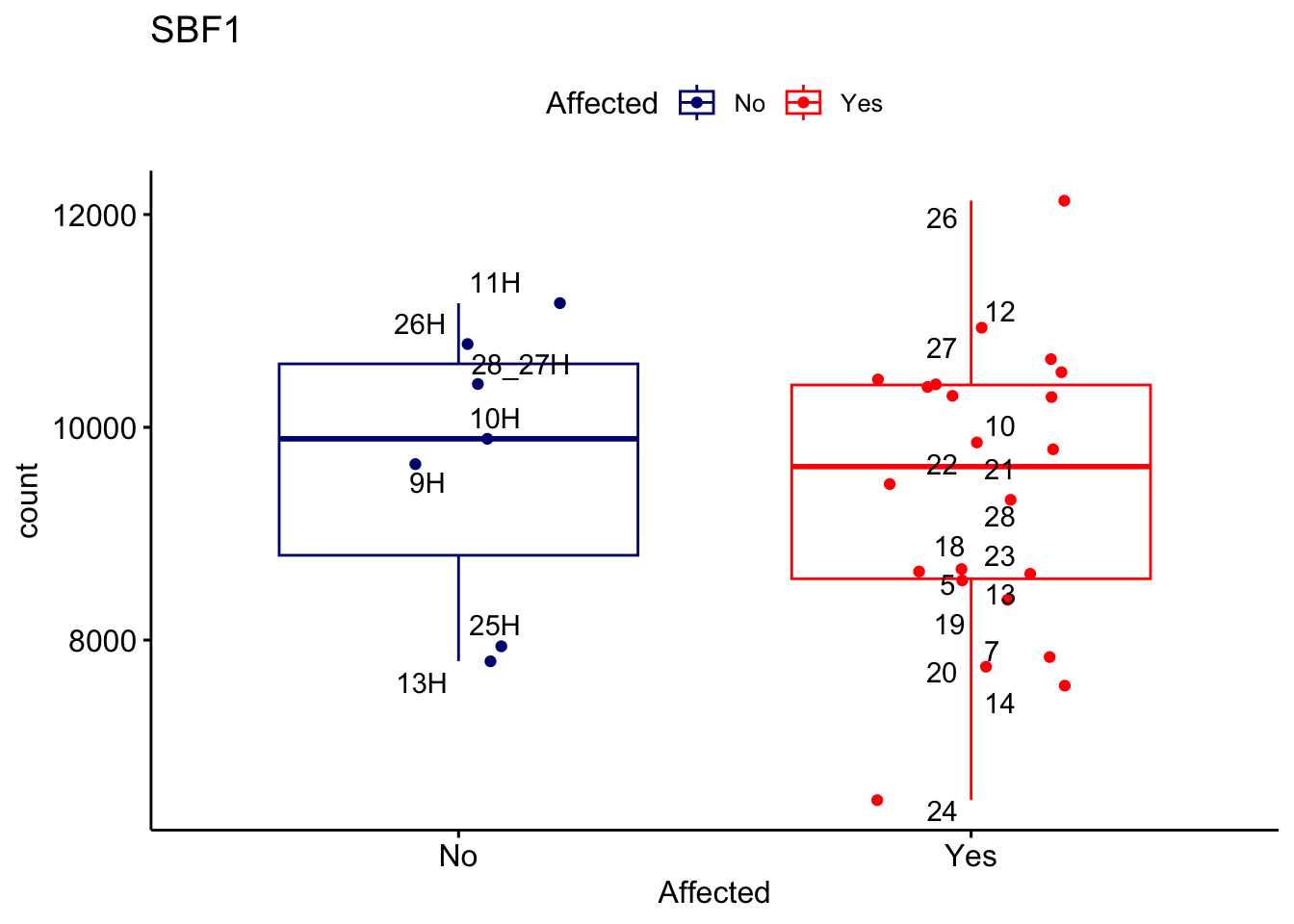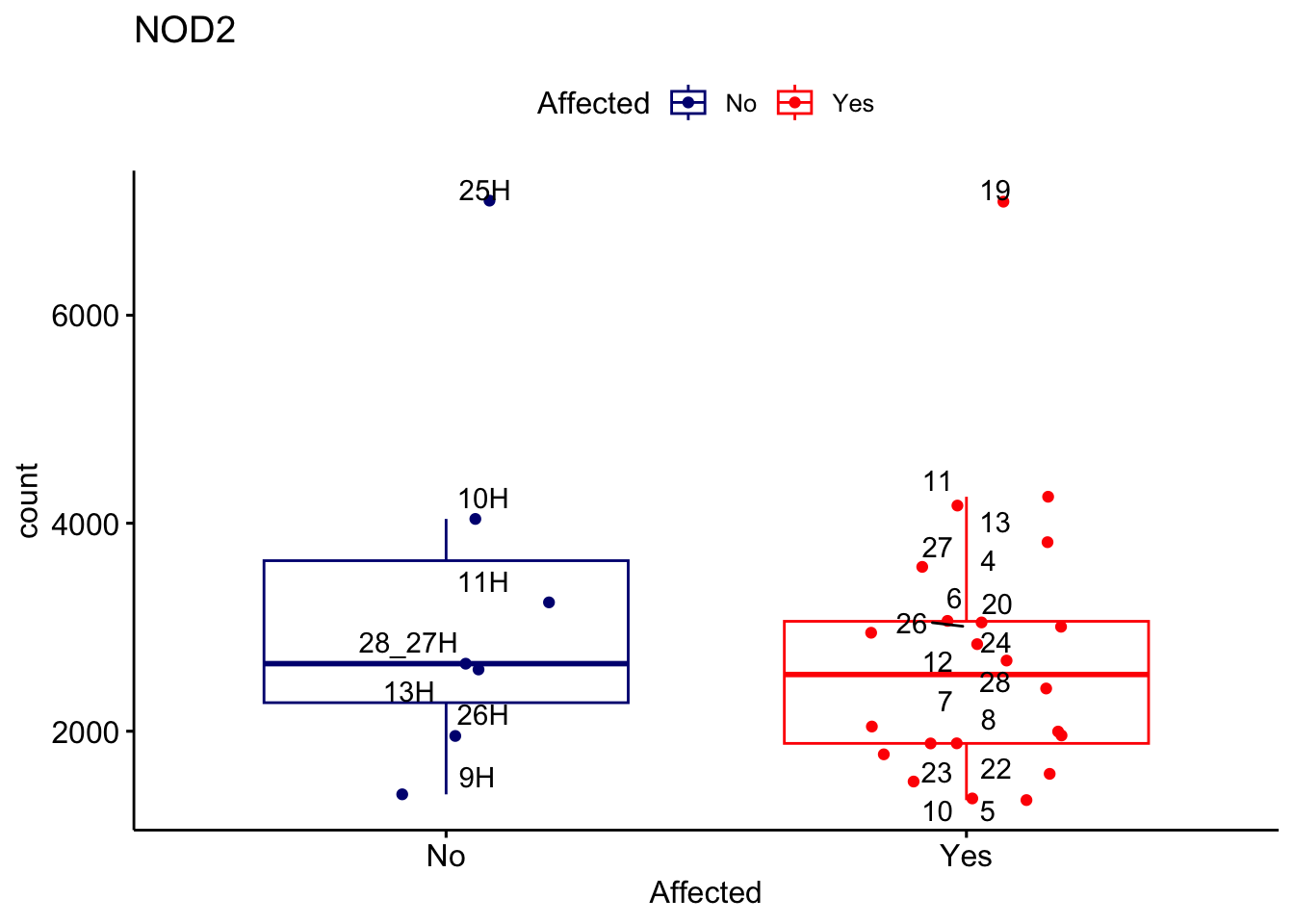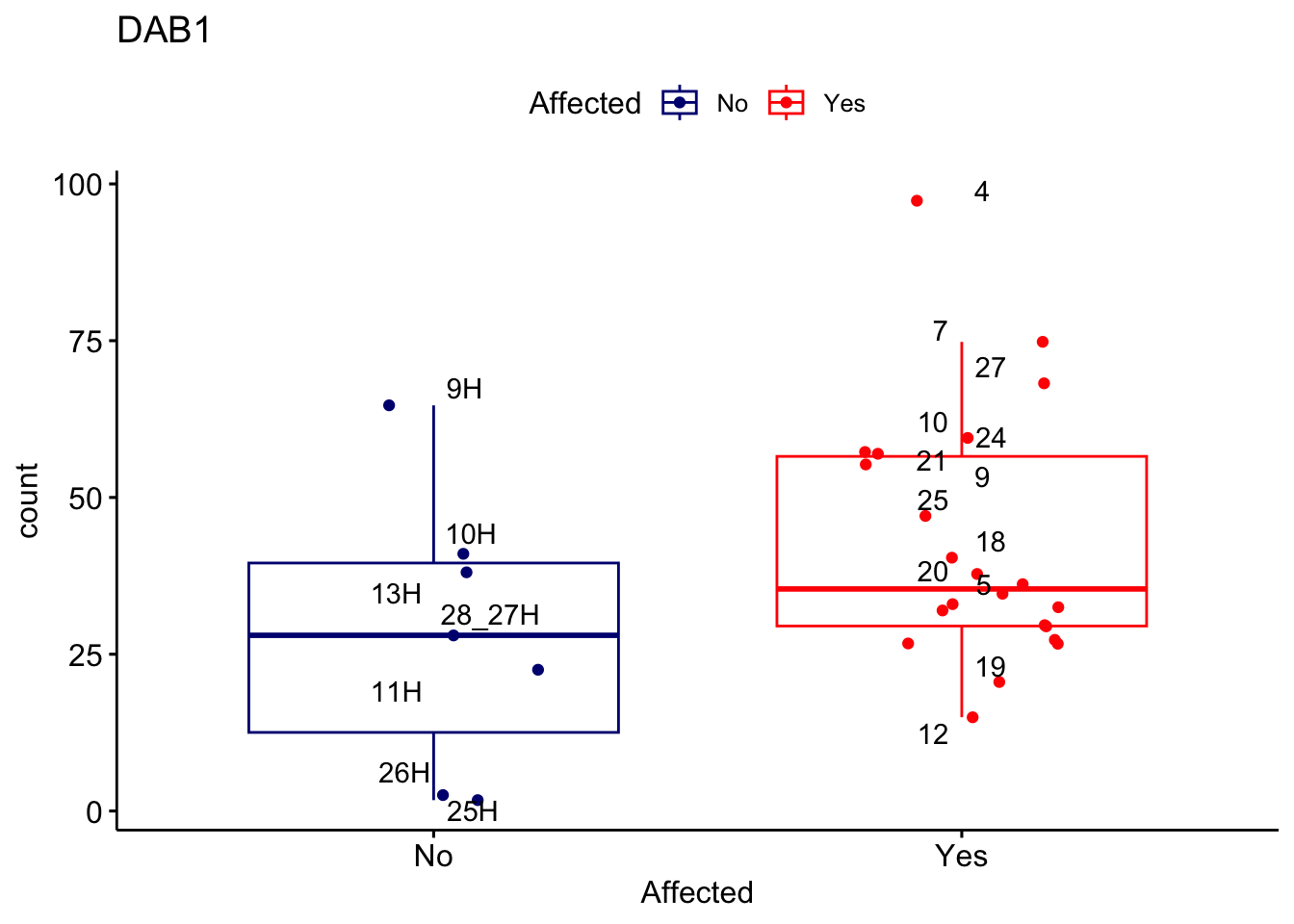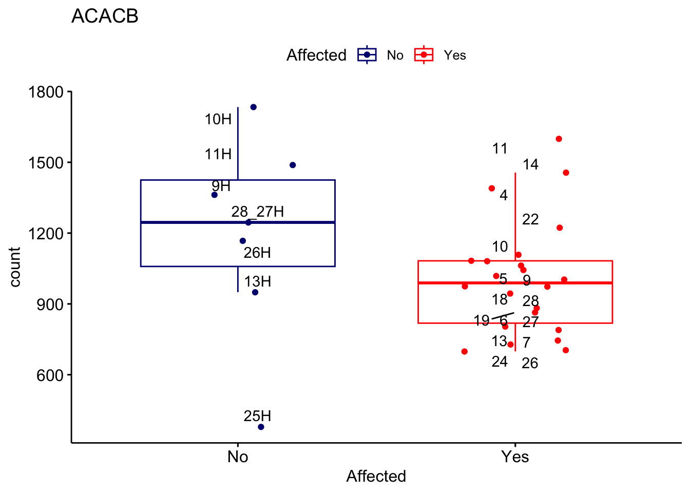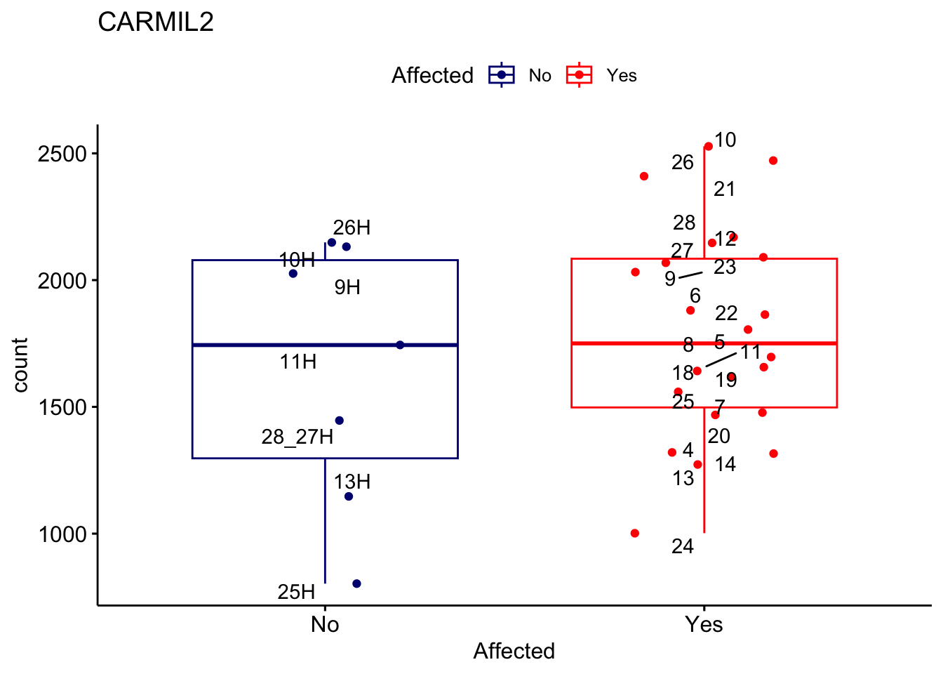 ggplot_box <- ggboxplot(d, x="Affected", y="count", add = "jitter", color = "Affected", palette = c("navy", "red"), title = gene_name) + geom_text_repel(aes(label = rownames(d)))