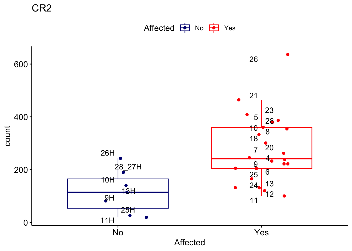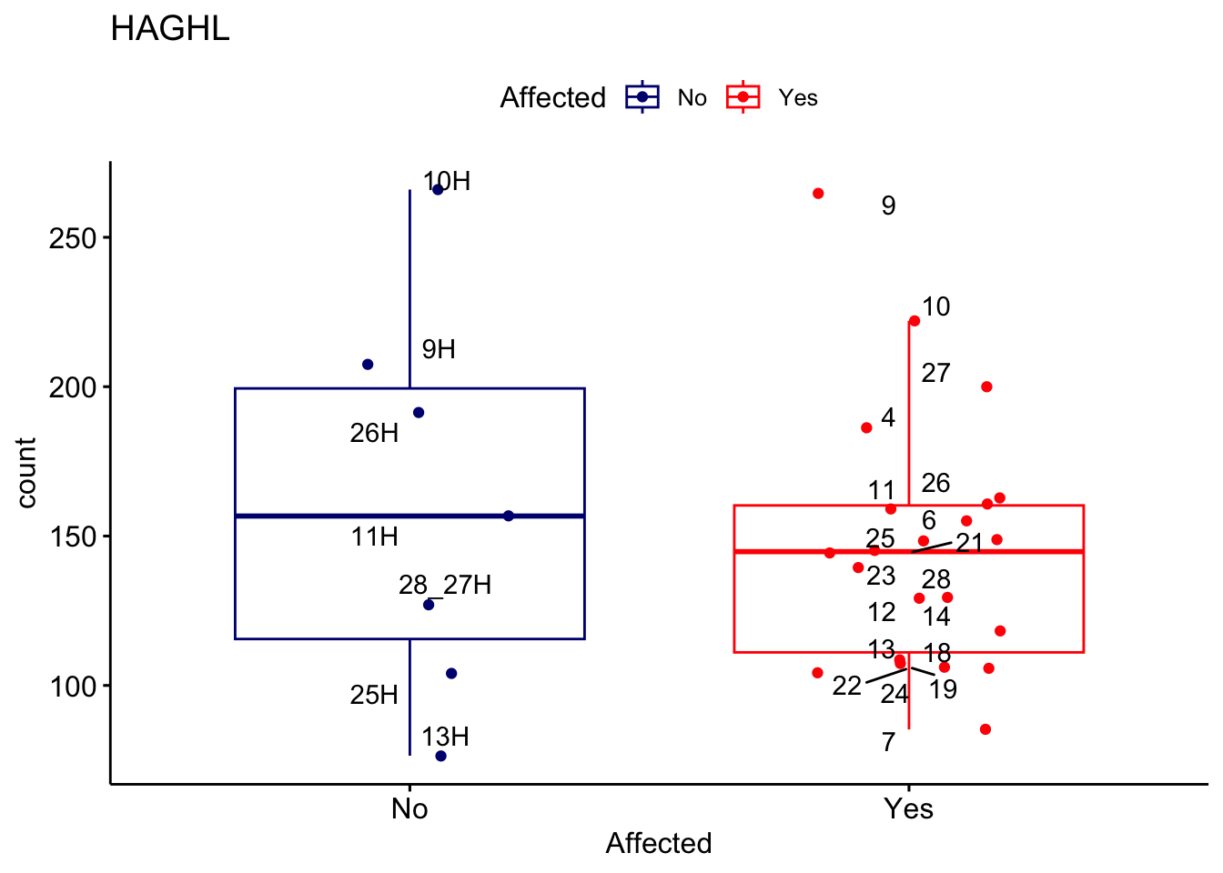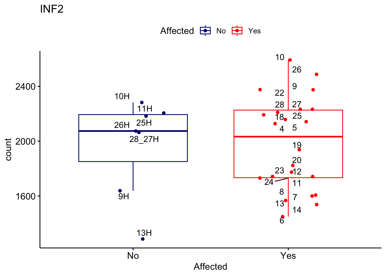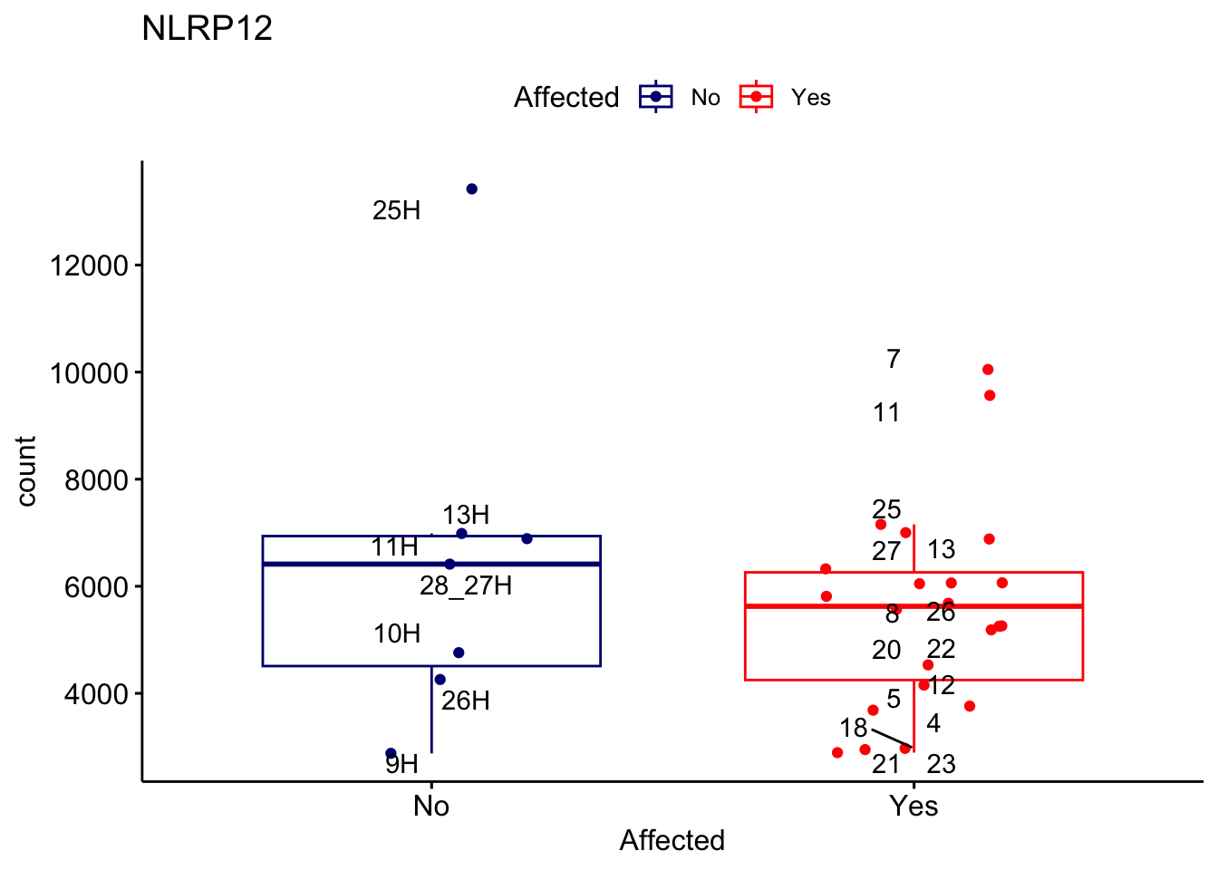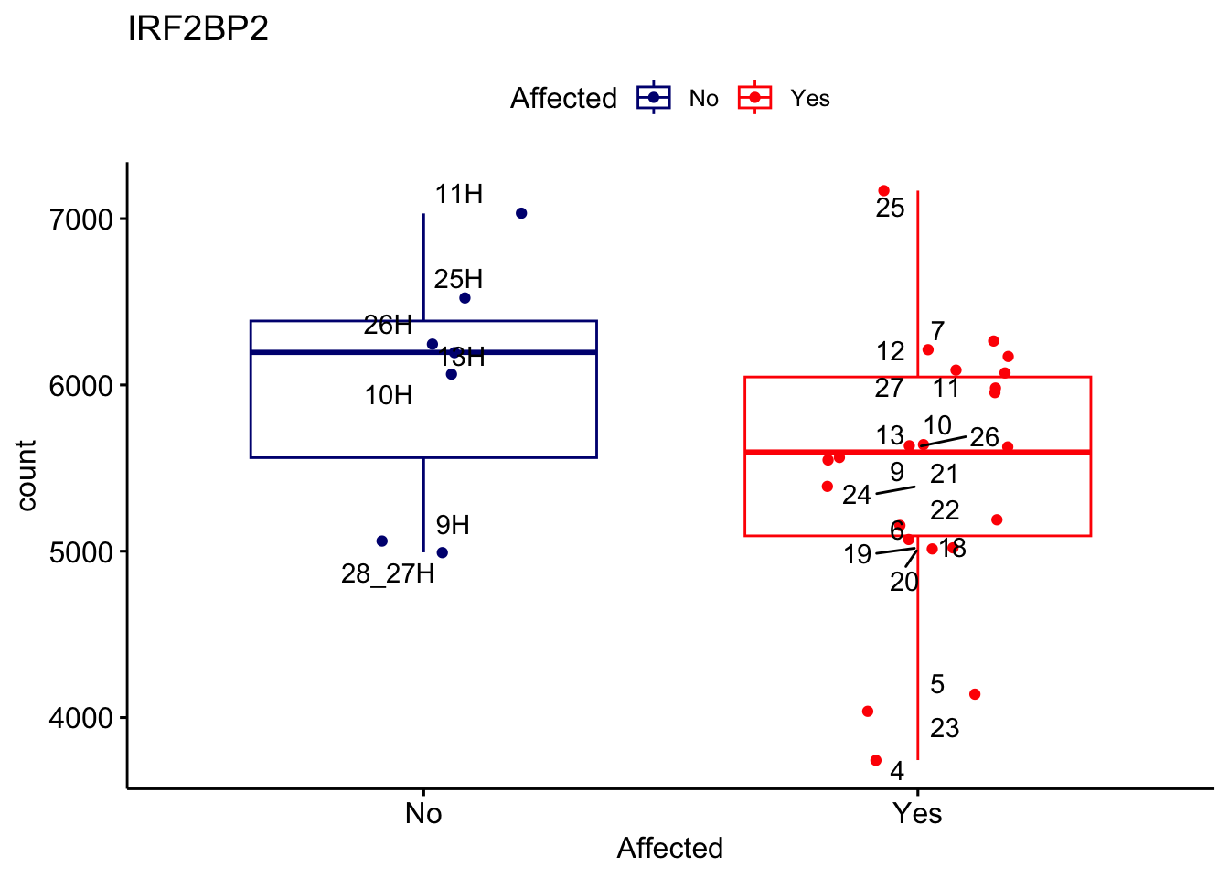 ggplot_box <- ggboxplot(d, x="Affected", y="count", add = "jitter", color = "Affected", palette = c("navy", "red"), title = gene_name) + geom_text_repel(aes(label = rownames(d)))