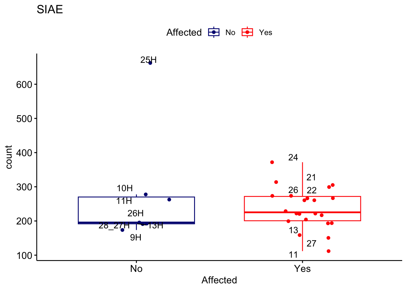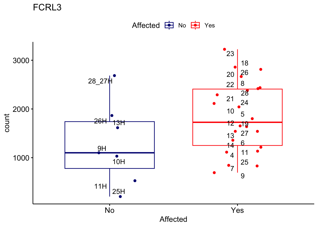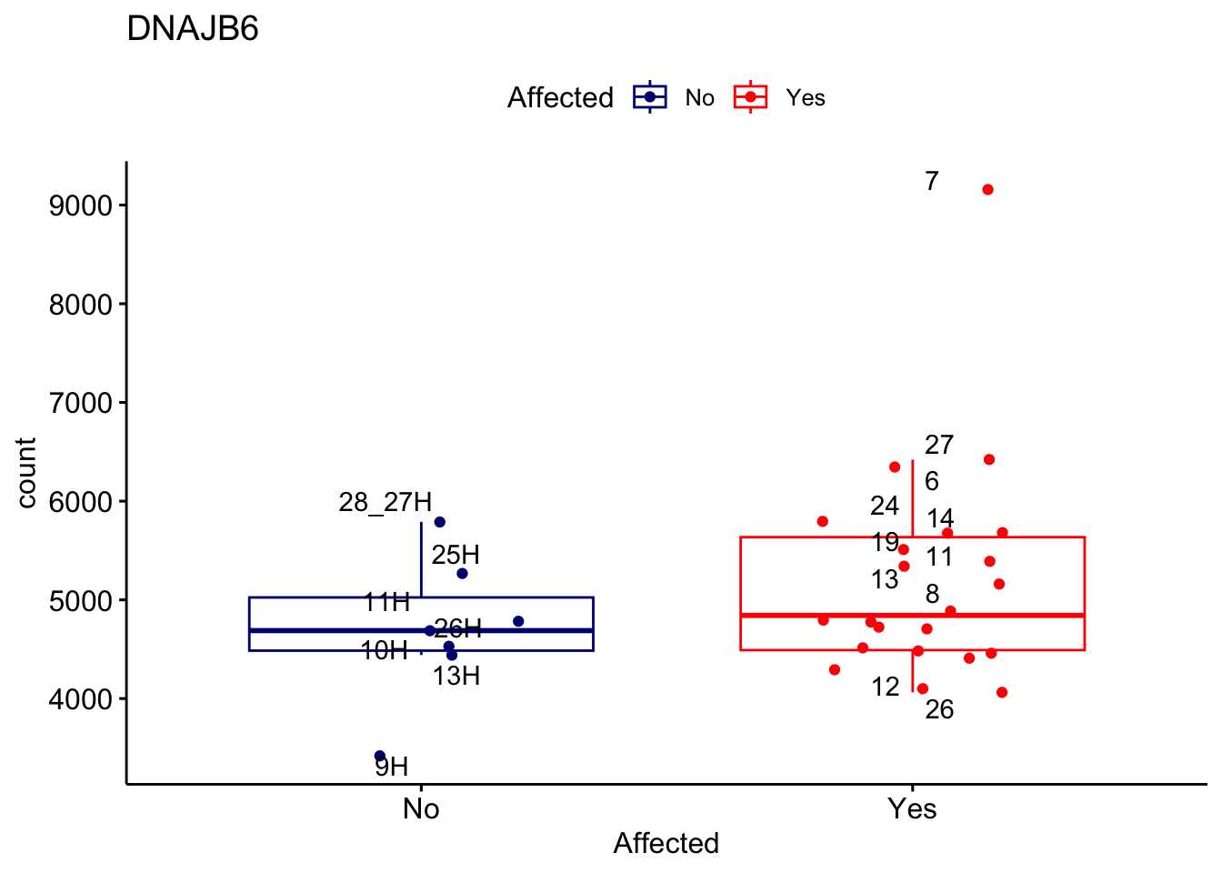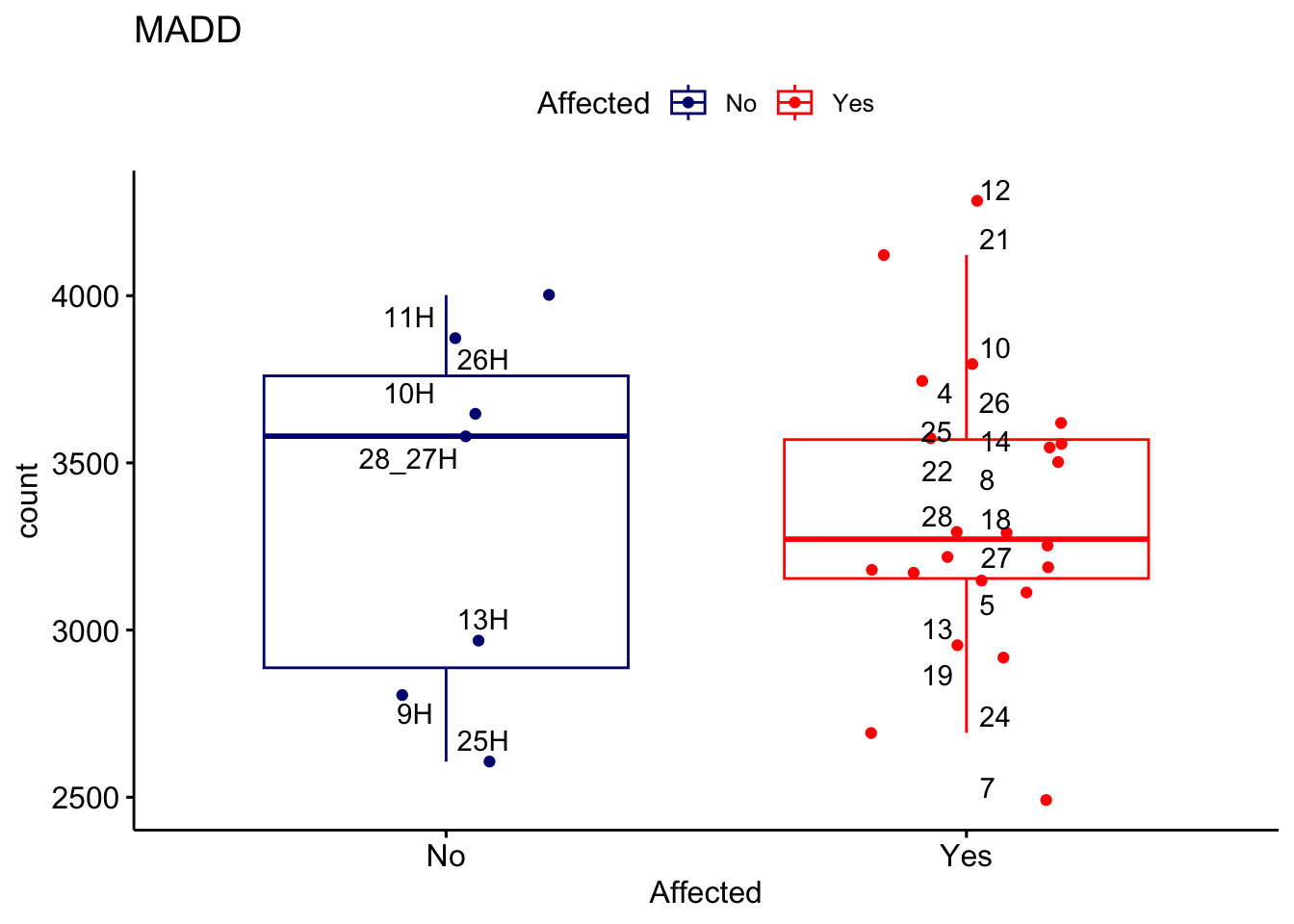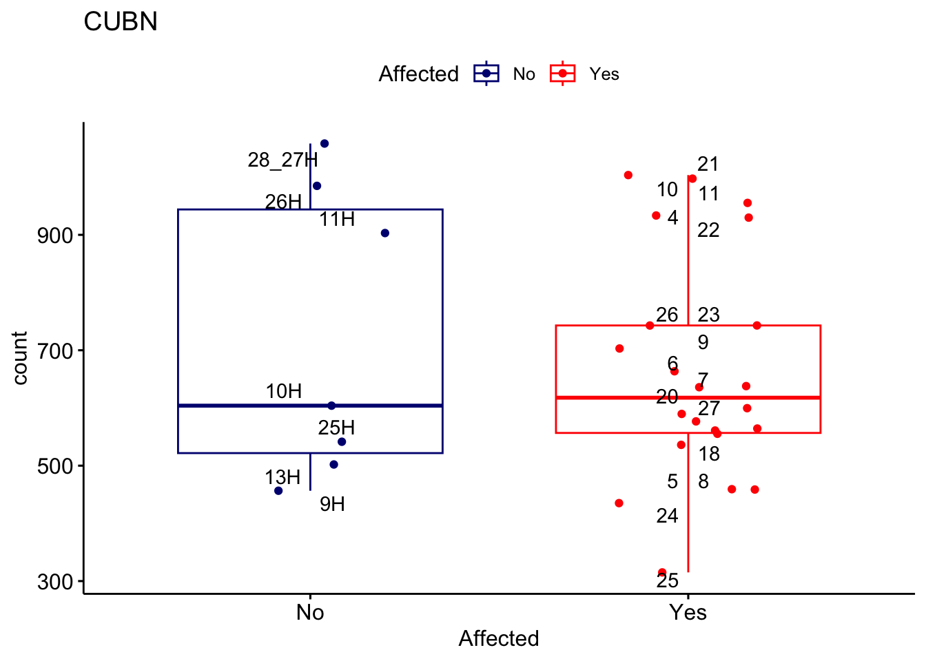 ggplot_box <- ggboxplot(d, x="Affected", y="count", add = "jitter", color = "Affected", palette = c("navy", "red"), title = gene_name) + geom_text_repel(aes(label = rownames(d)))