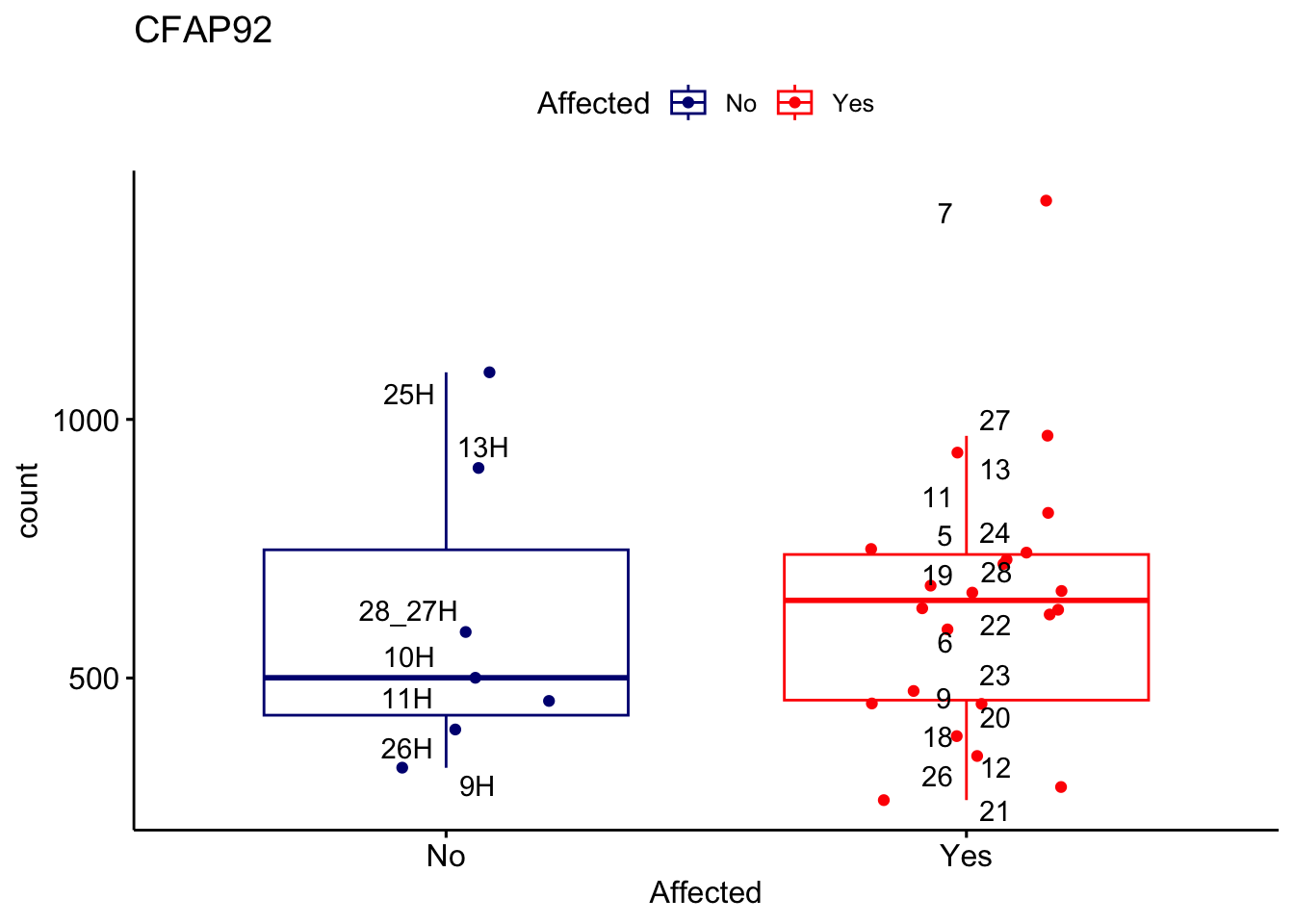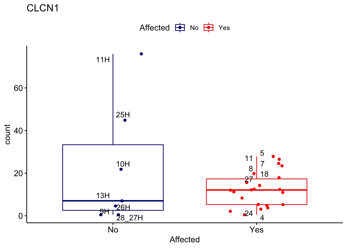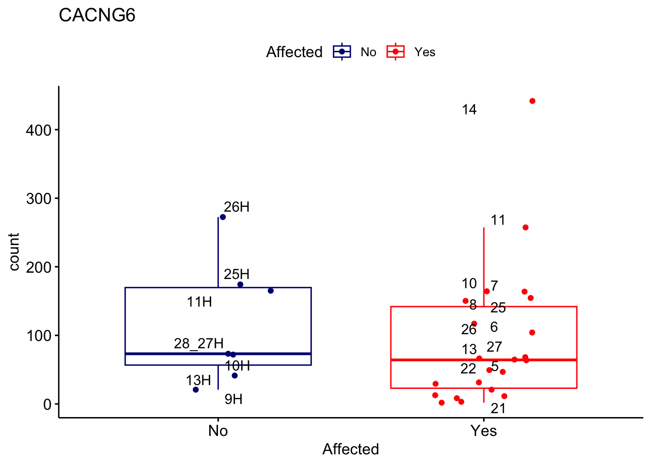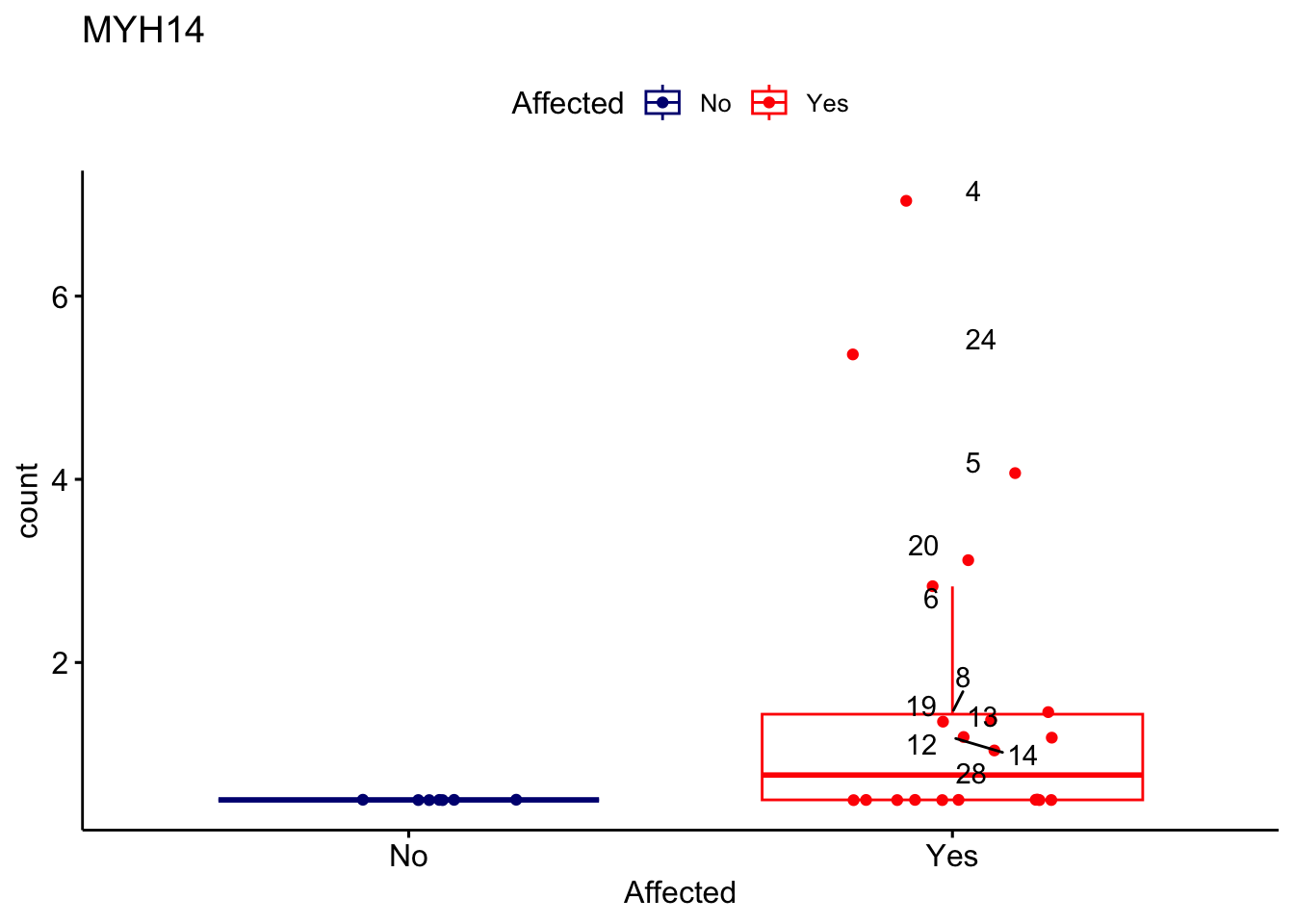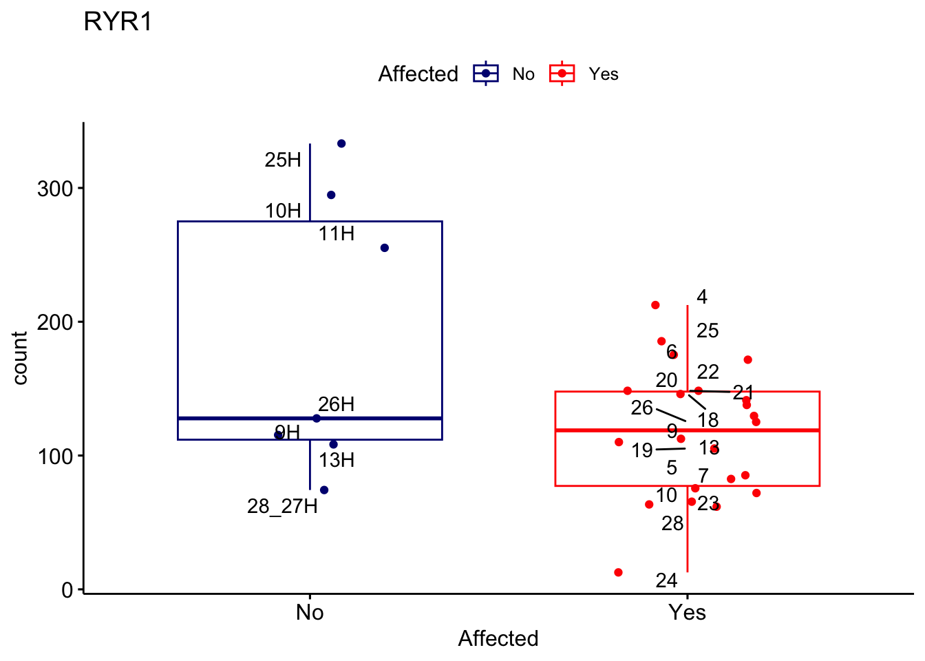 ggplot_box <- ggboxplot(d, x="Affected", y="count", add = "jitter", color = "Affected", palette = c("navy", "red"), title = gene_name) + geom_text_repel(aes(label = rownames(d)))