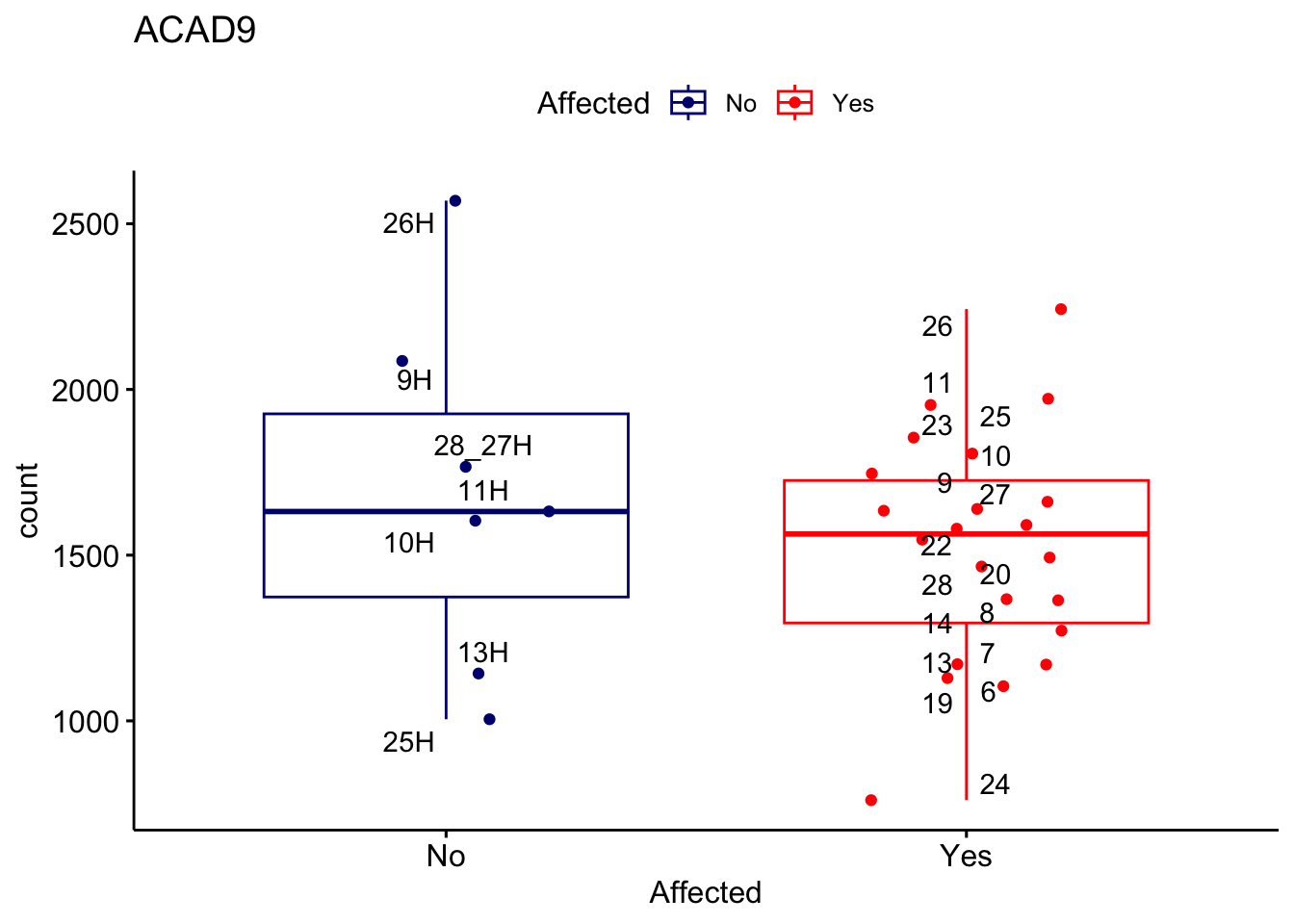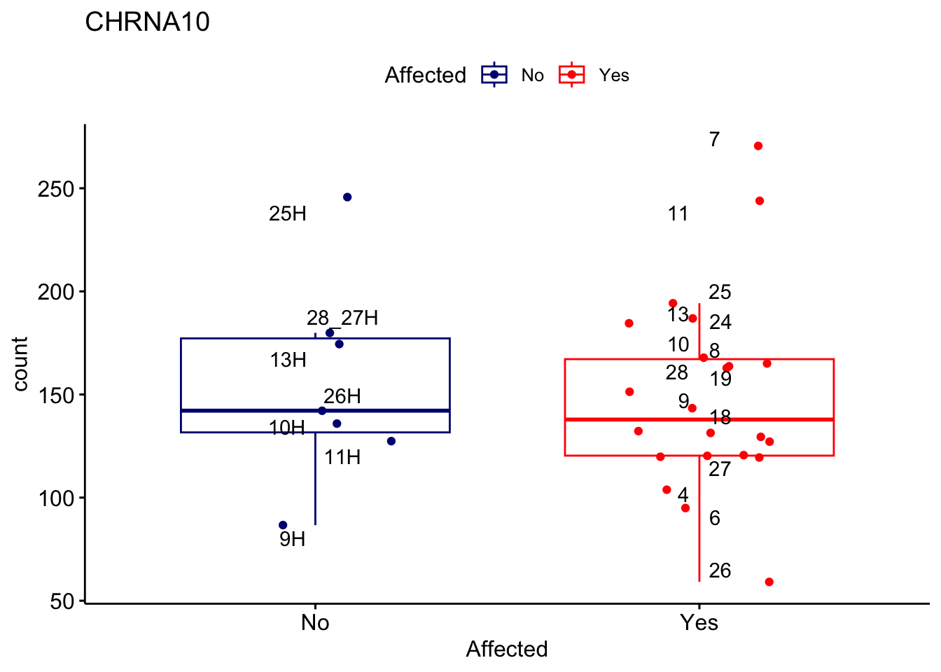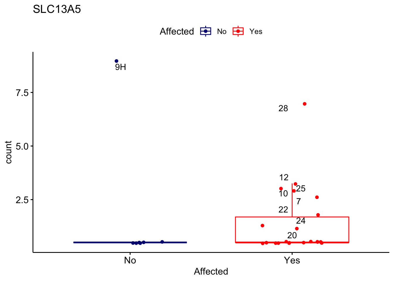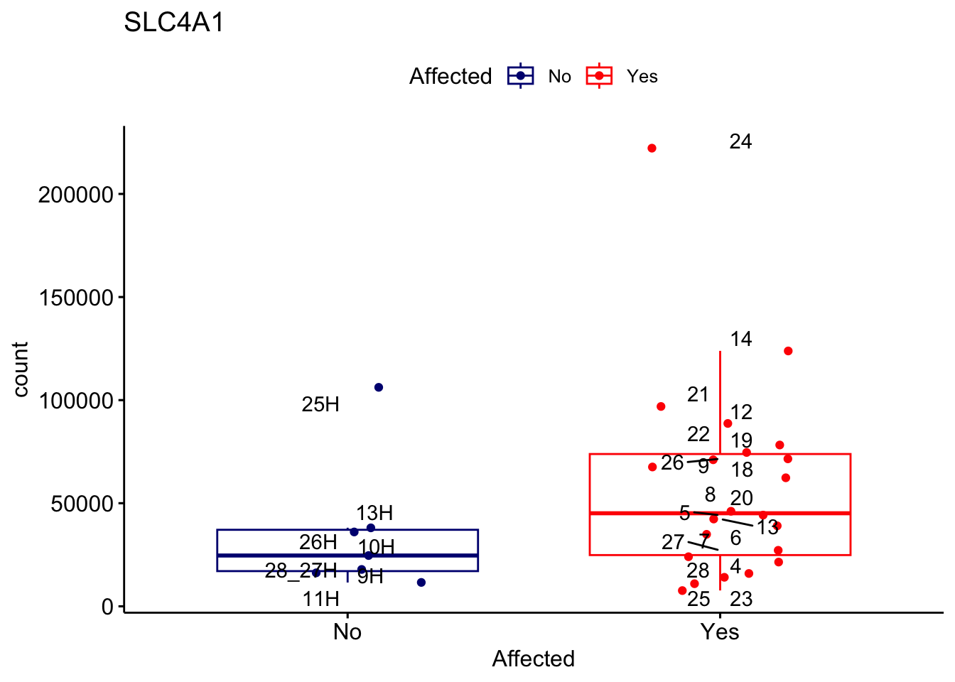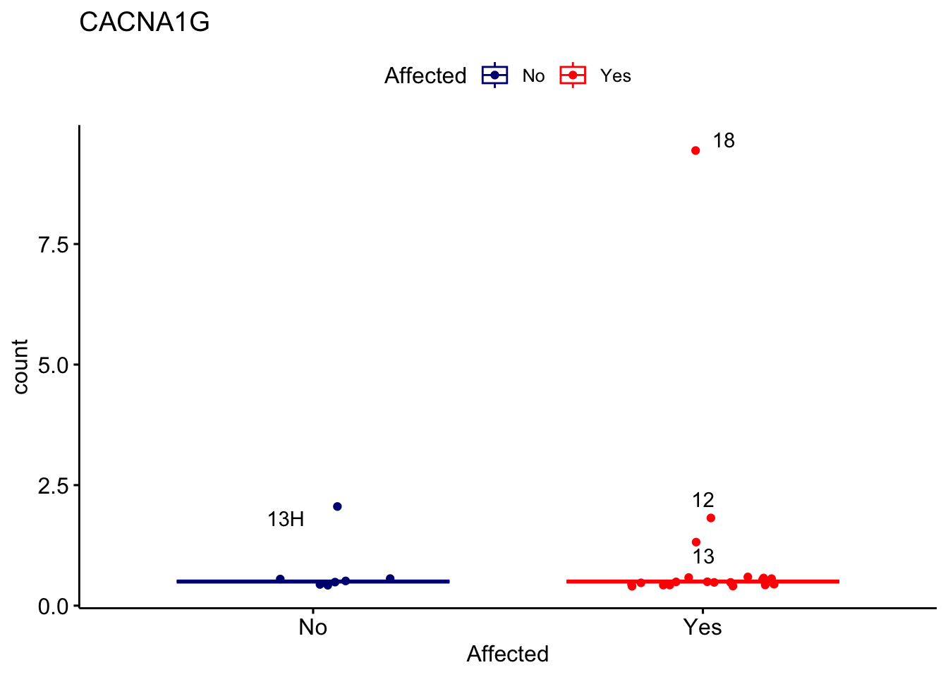 ggplot_box <- ggboxplot(d, x="Affected", y="count", add = "jitter", color = "Affected", palette = c("navy", "red"), title = gene_name) + geom_text_repel(aes(label = rownames(d)))