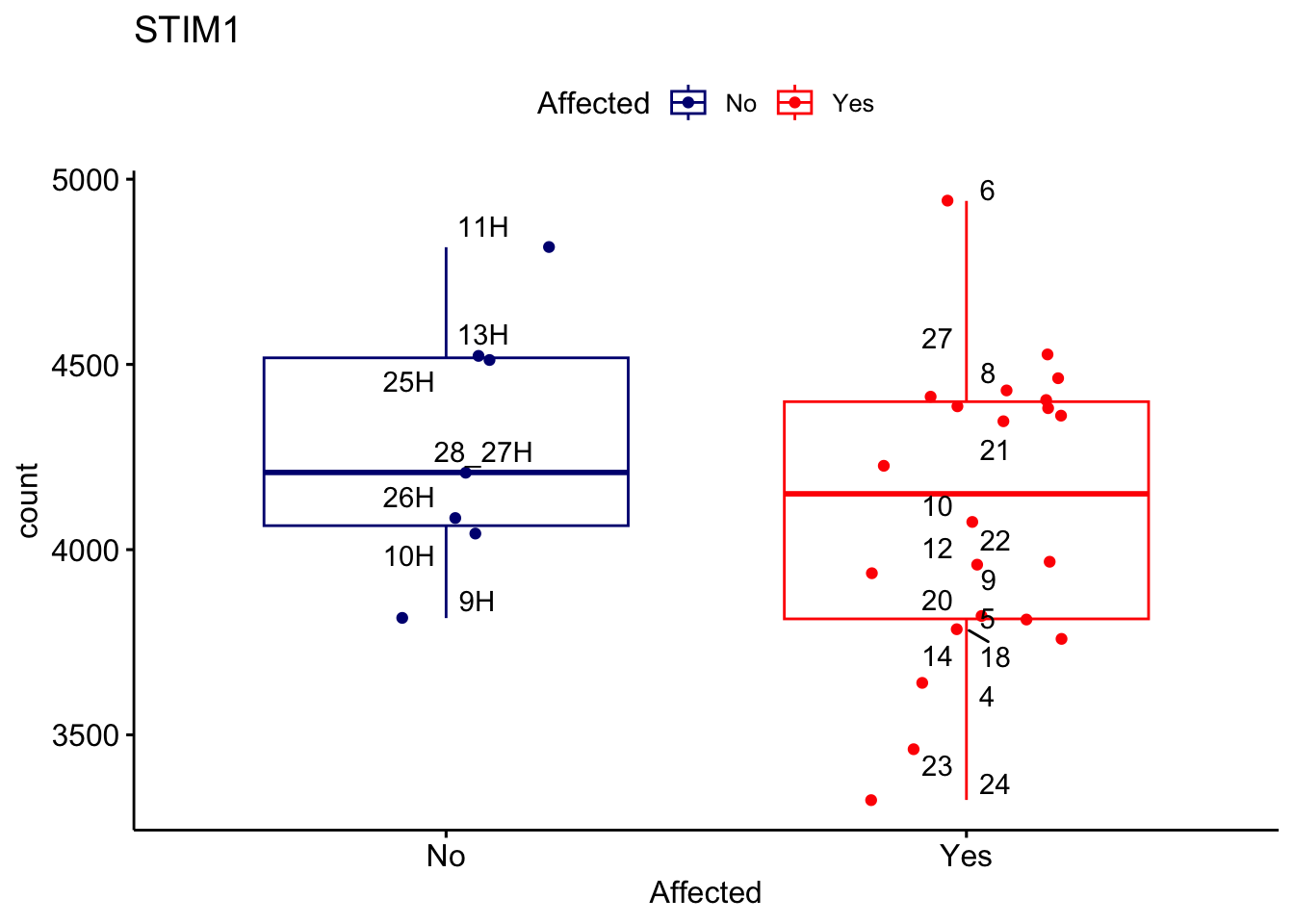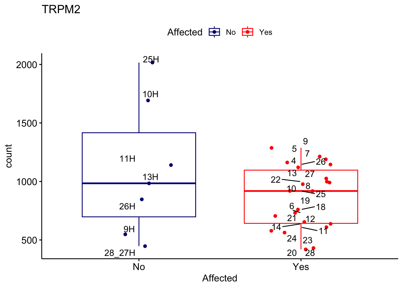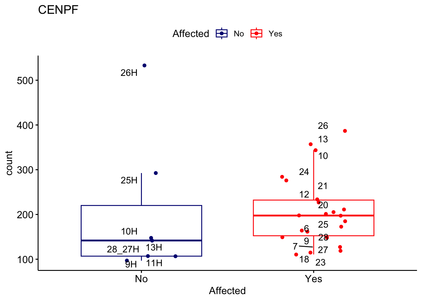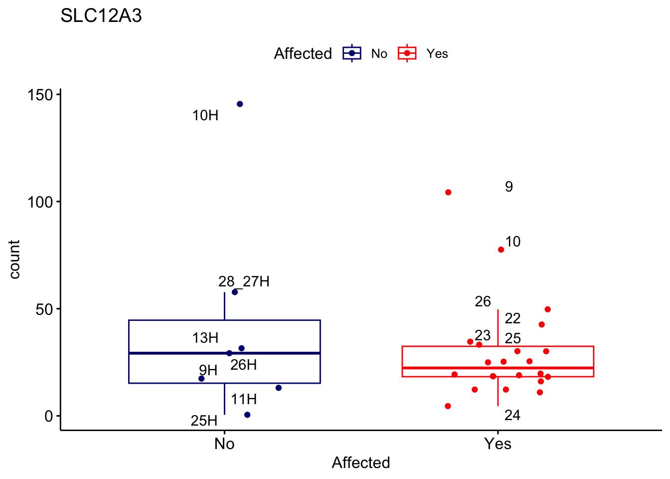 ggplot_box <- ggboxplot(d, x="Affected", y="count", add = "jitter", color = "Affected", palette = c("navy", "red"), title = gene_name) + geom_text_repel(aes(label = rownames(d)))