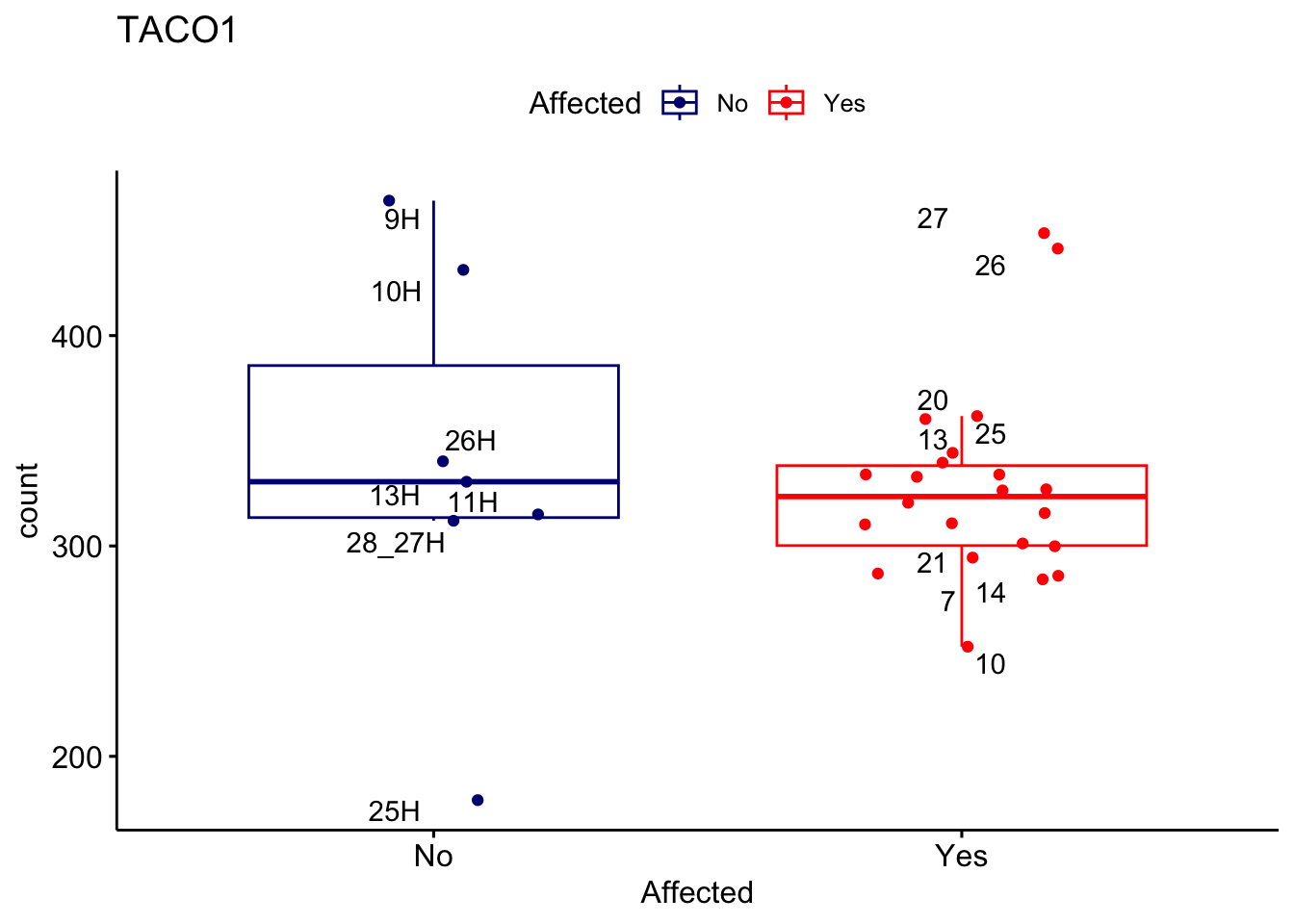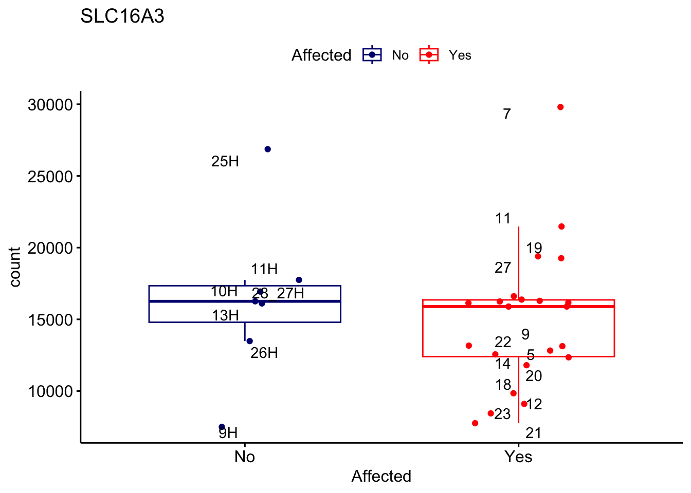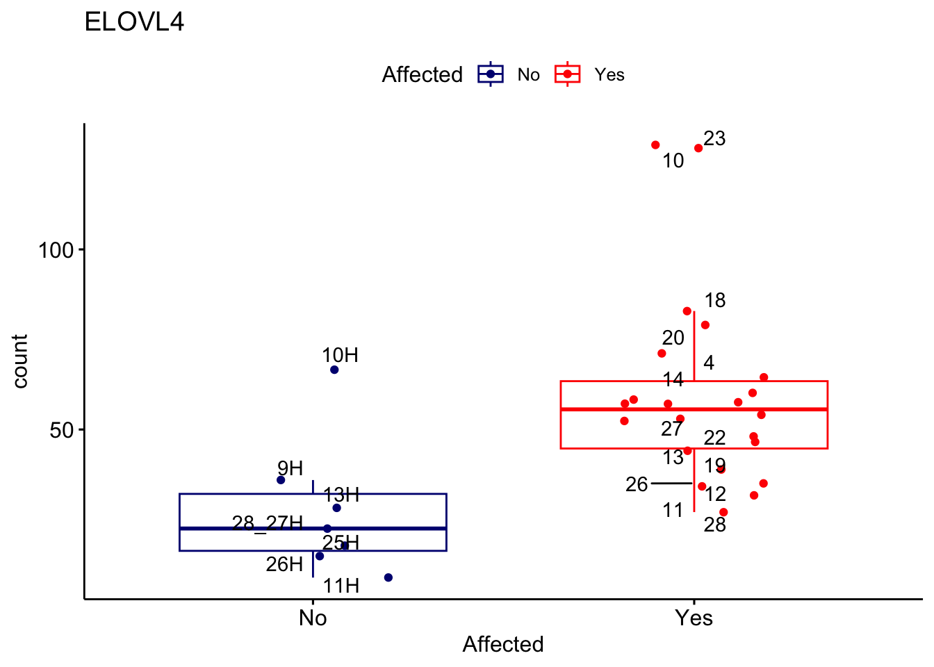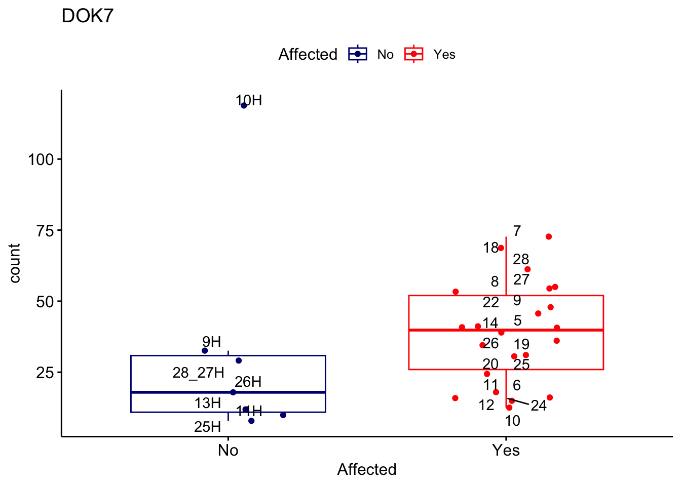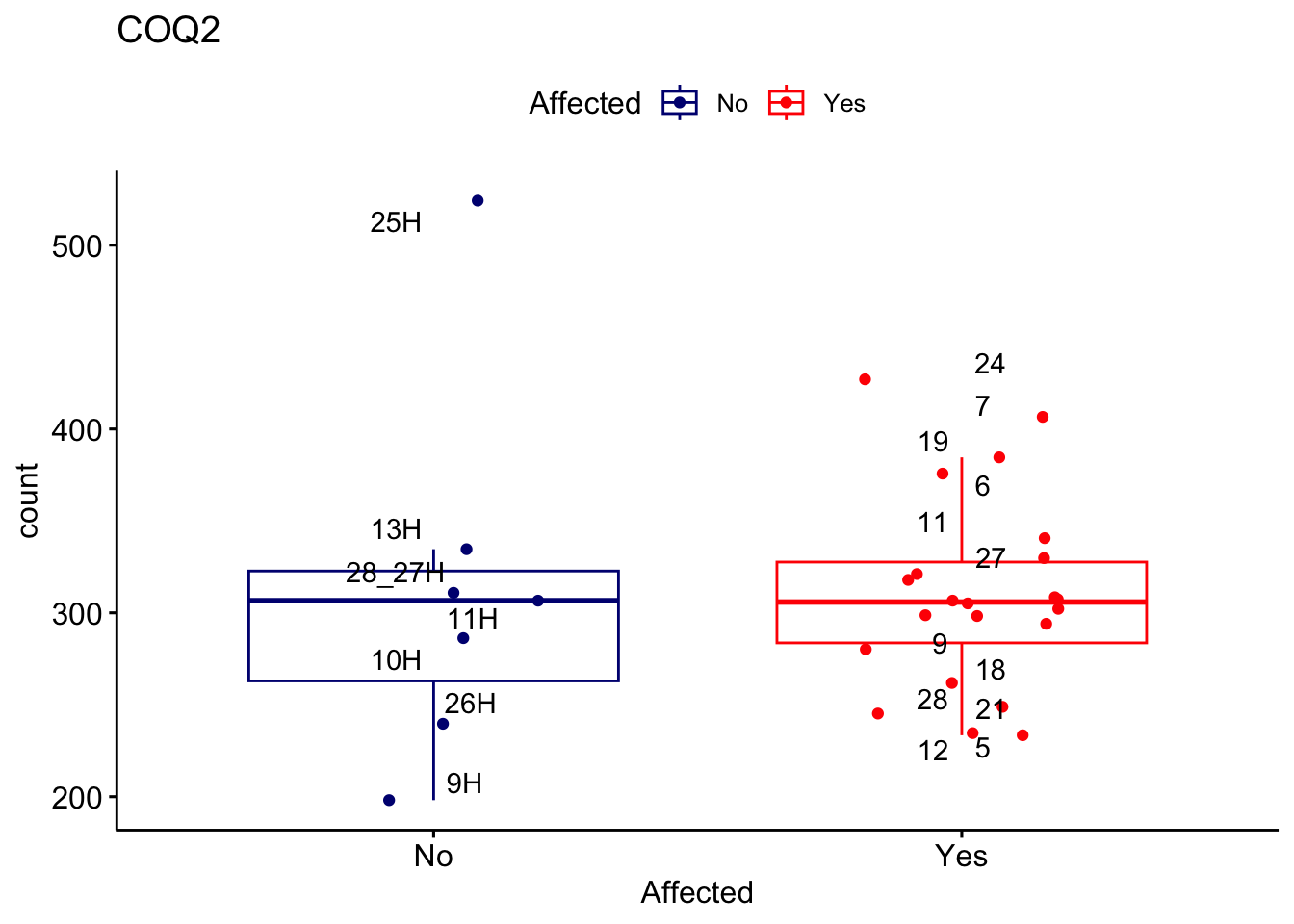 ggplot_box <- ggboxplot(d, x="Affected", y="count", add = "jitter", color = "Affected", palette = c("navy", "red"), title = gene_name) + geom_text_repel(aes(label = rownames(d)))