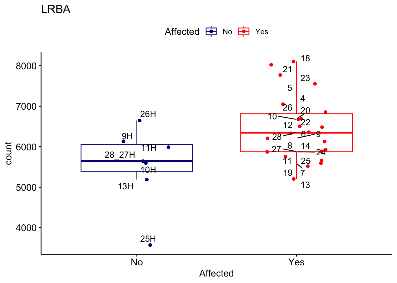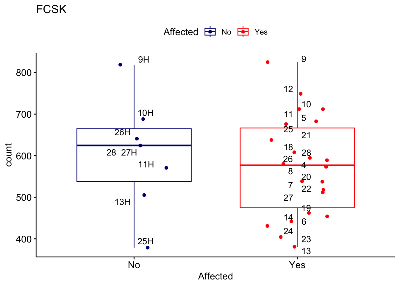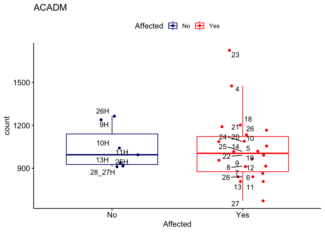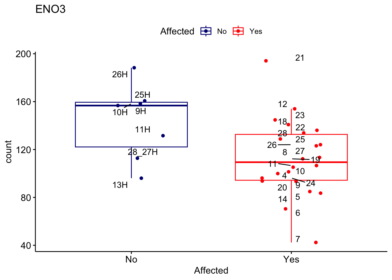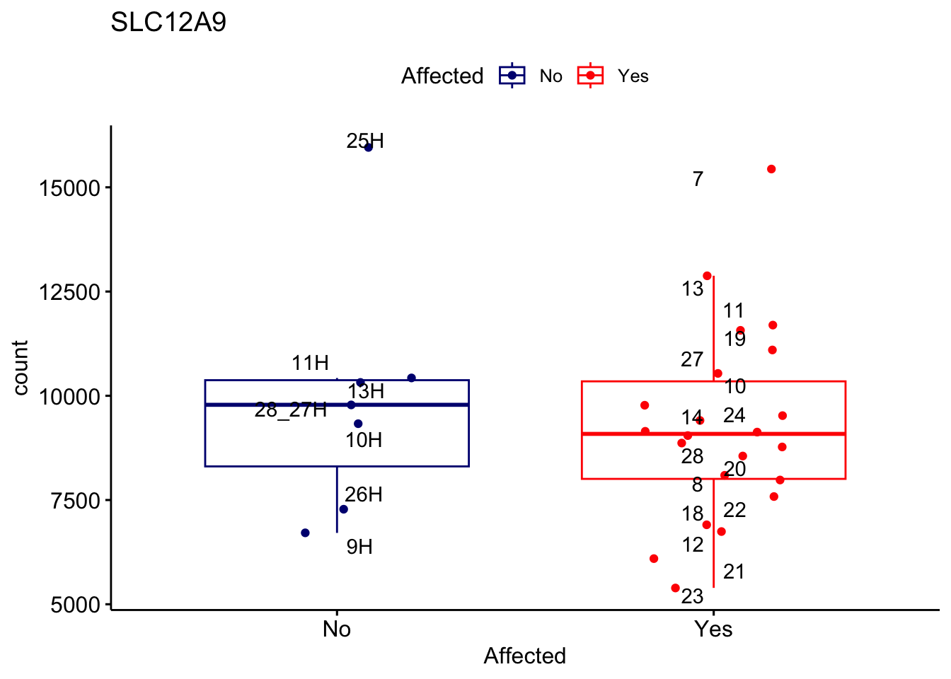 ggplot_box <- ggboxplot(d, x="Affected", y="count", add = "jitter", color = "Affected", palette = c("navy", "red"), title = gene_name) + geom_text_repel(aes(label = rownames(d)))