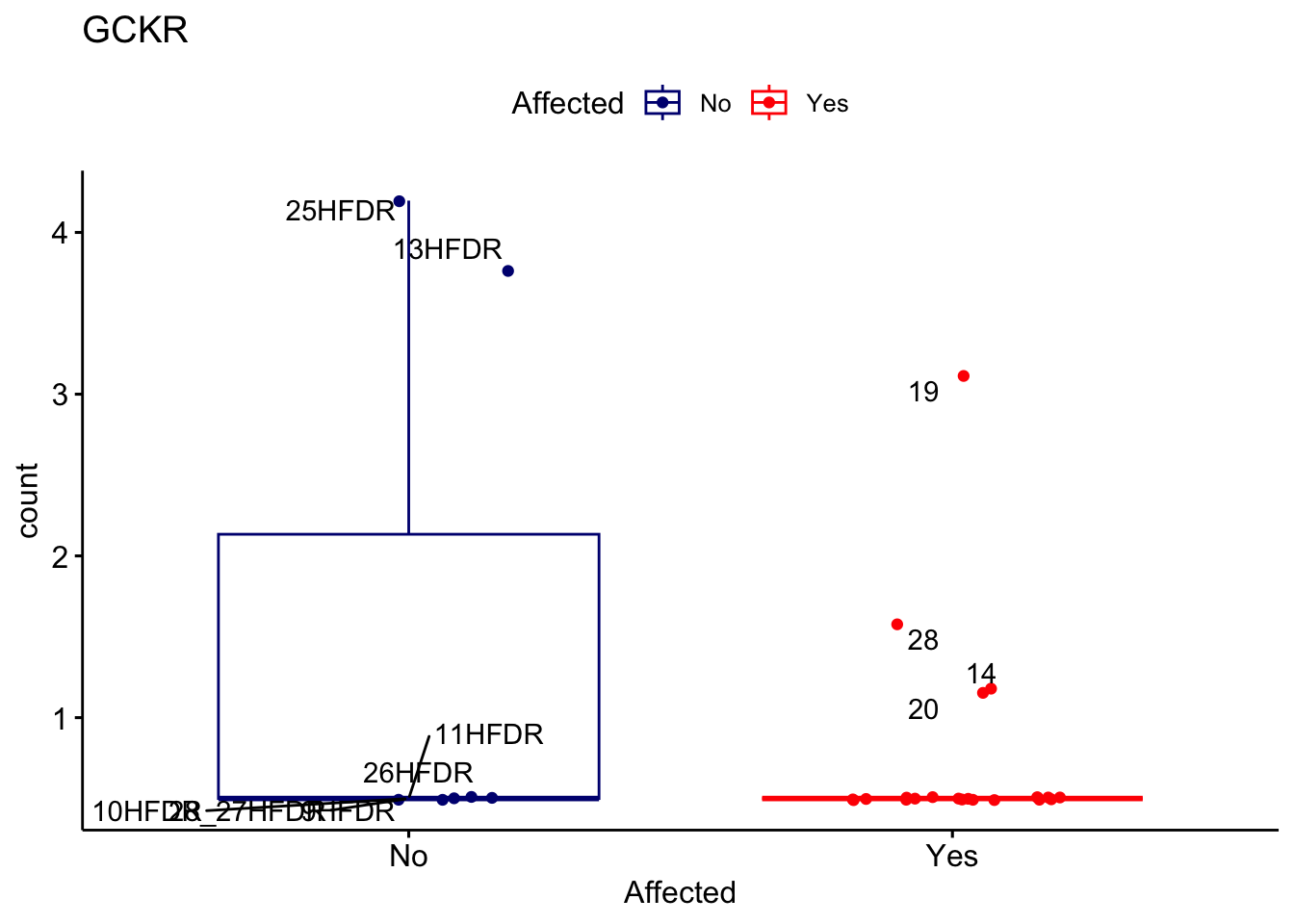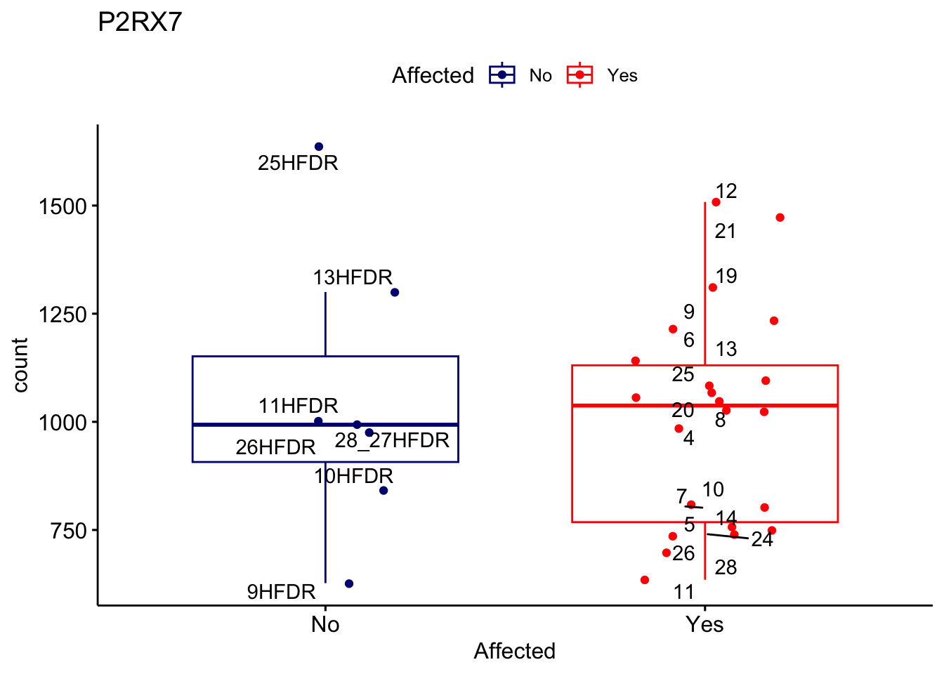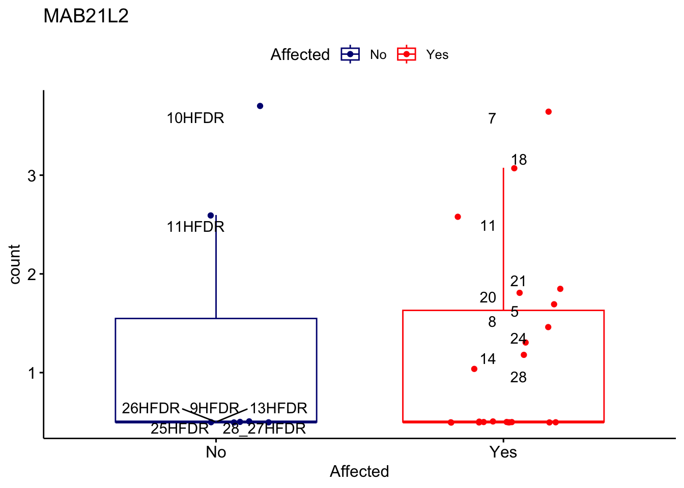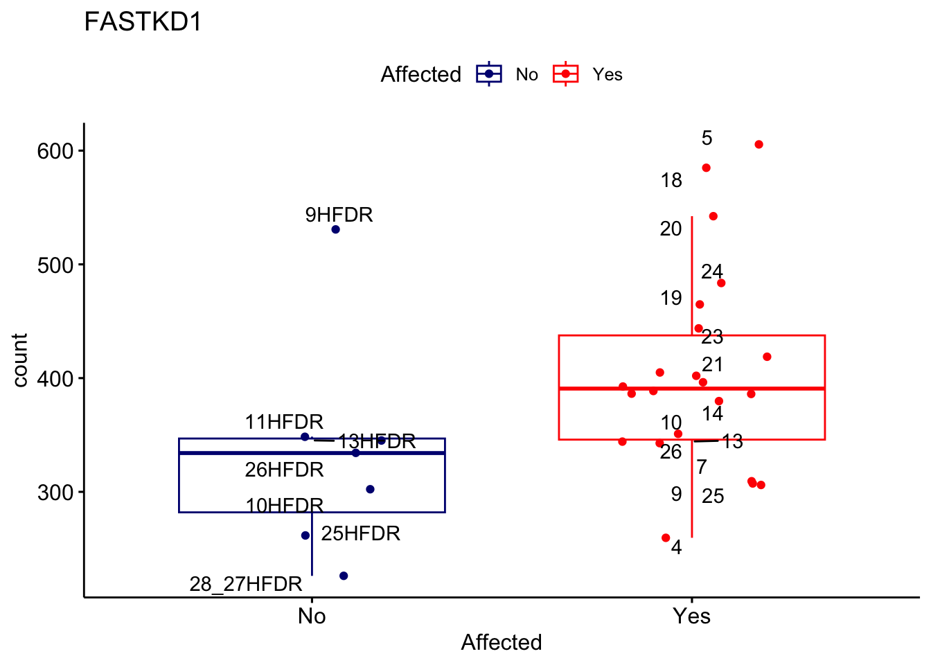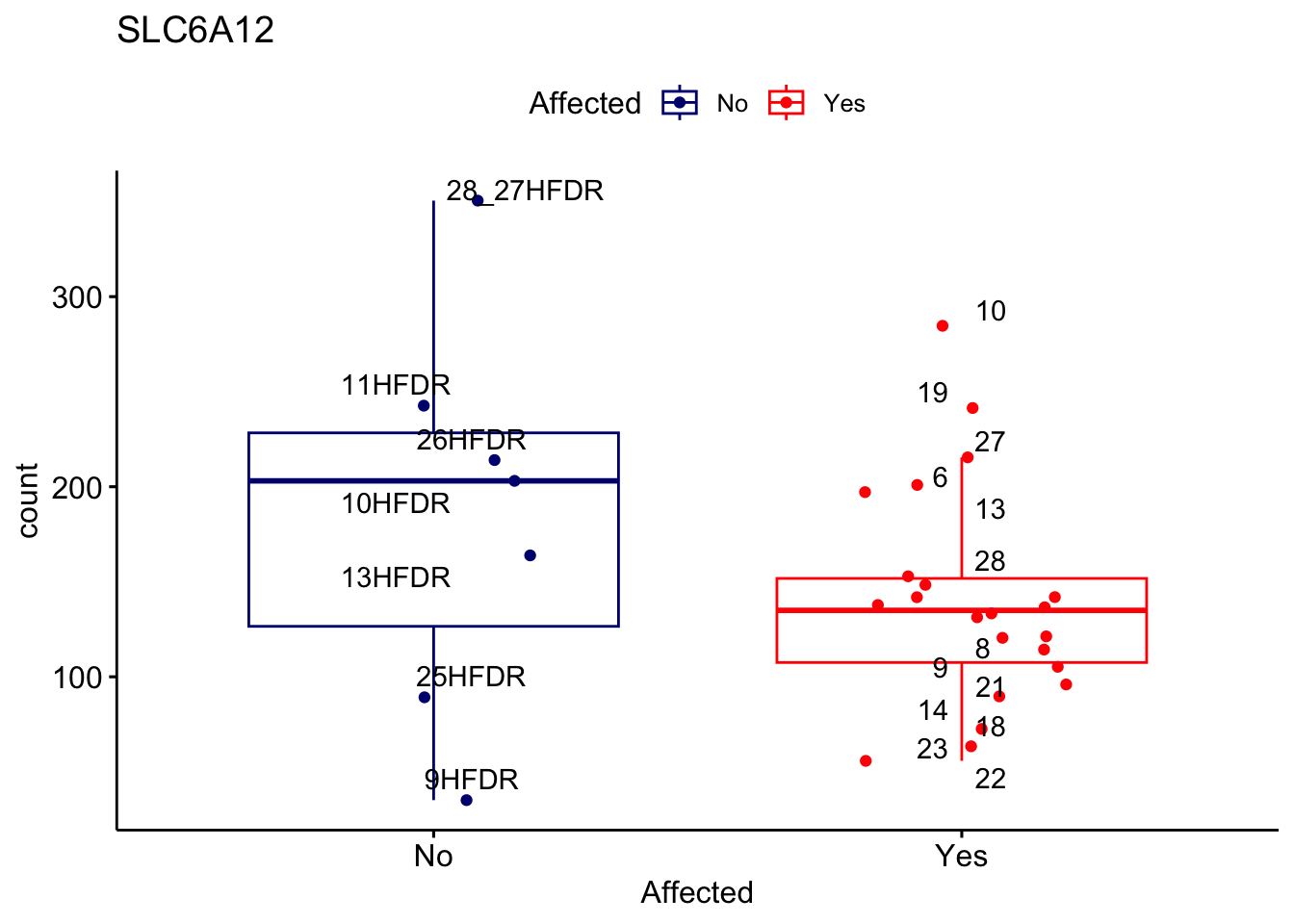 ggplot_box <- ggboxplot(d, x="Affected", y="count", add = "jitter", color = "Affected", palette = c("navy", "red"), title = gene_name) + geom_text_repel(aes(label = rownames(d)))