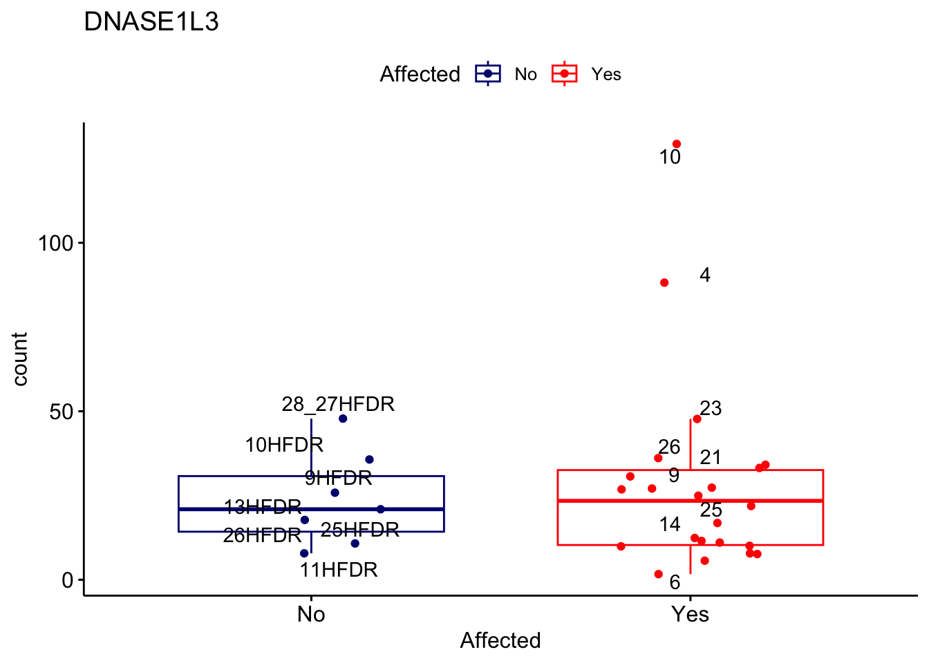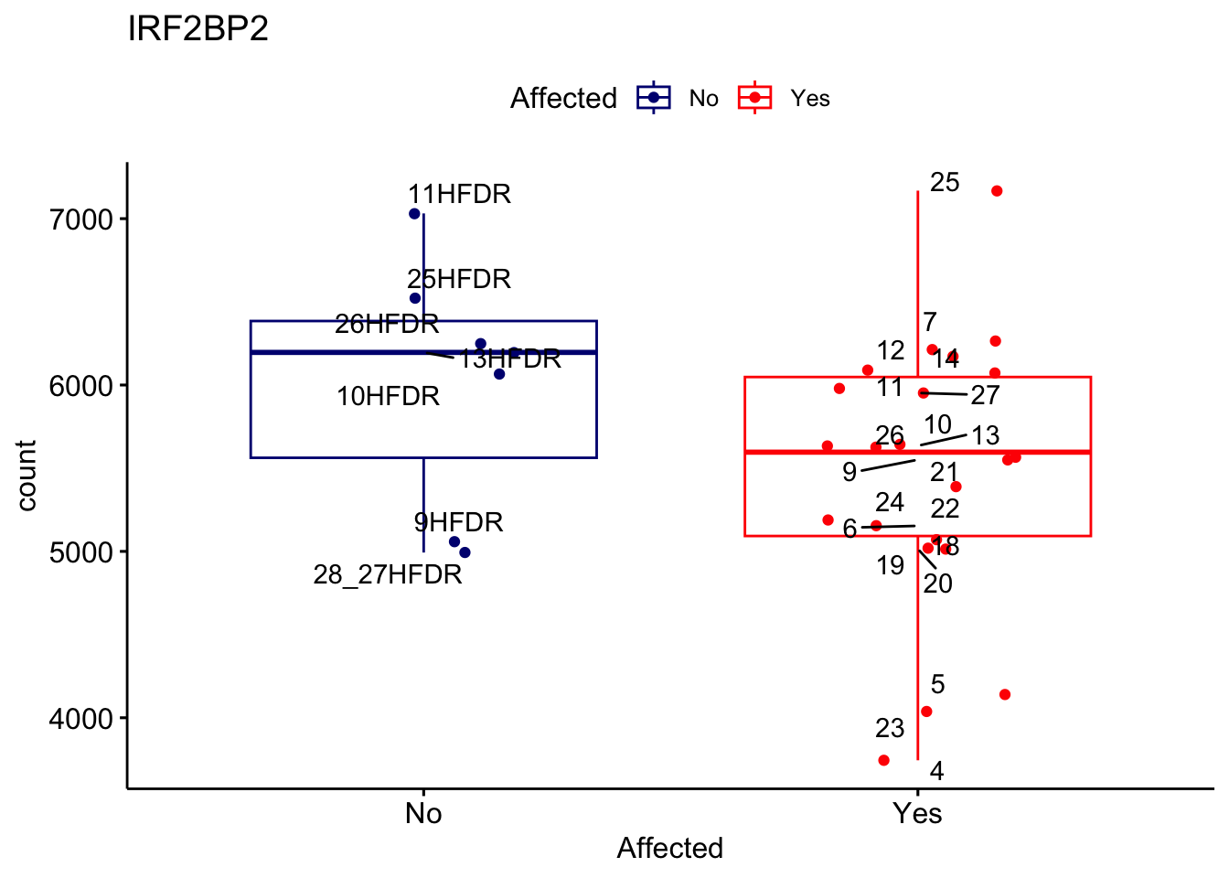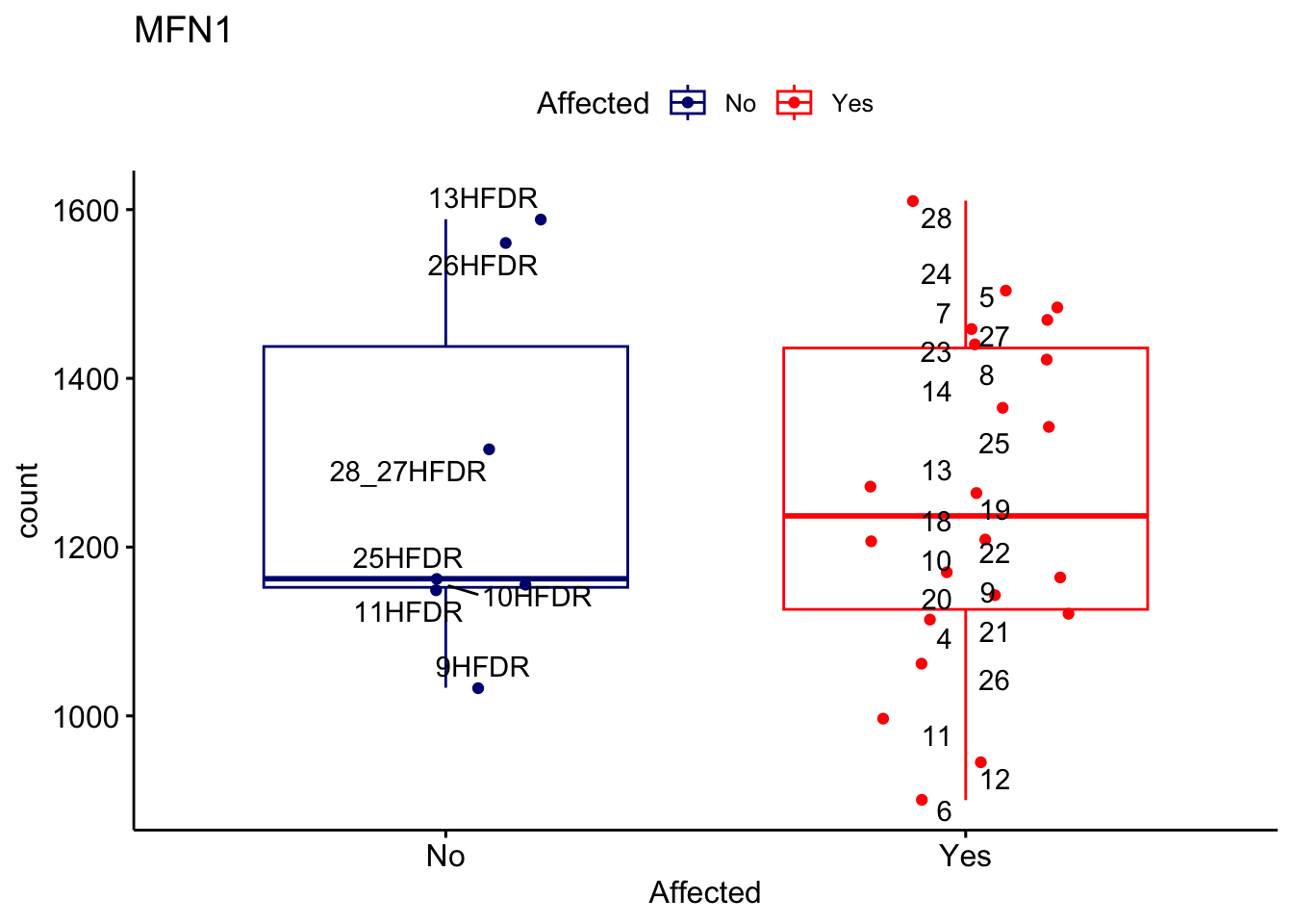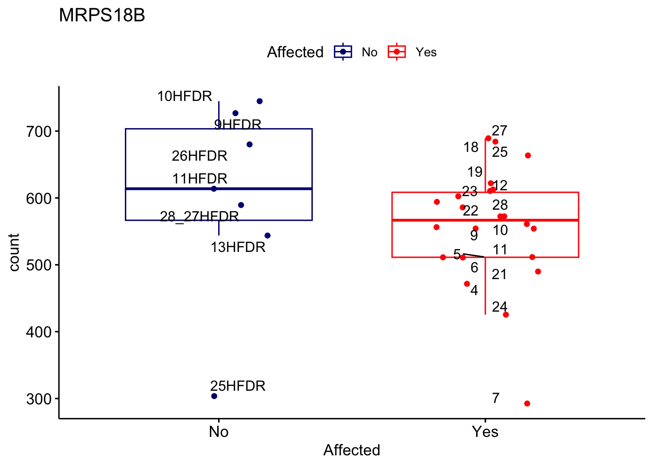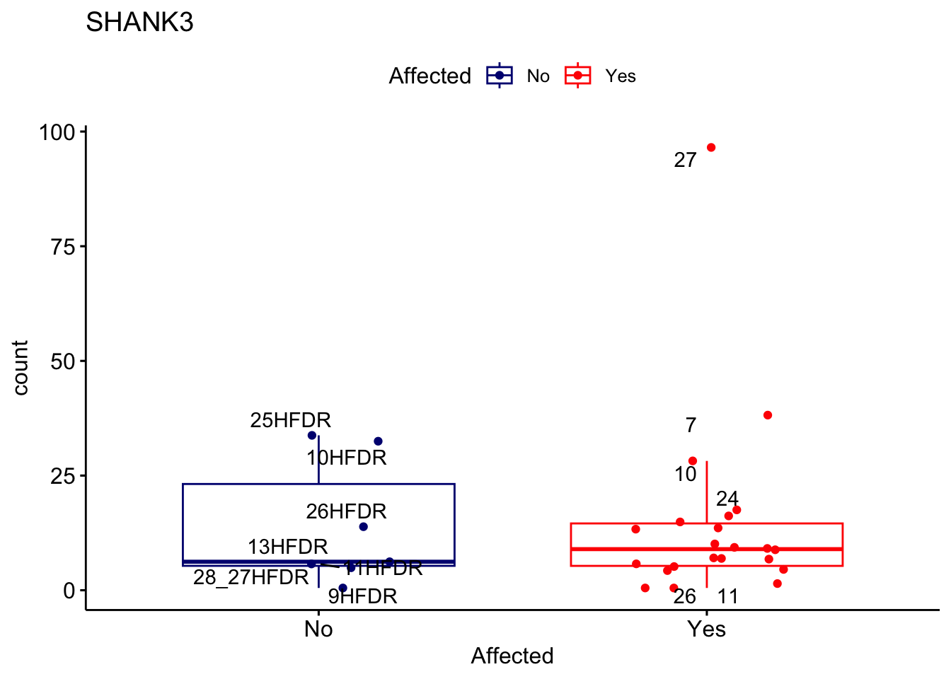 ggplot_box <- ggboxplot(d, x="Affected", y="count", add = "jitter", color = "Affected", palette = c("navy", "red"), title = gene_name) + geom_text_repel(aes(label = rownames(d)))
