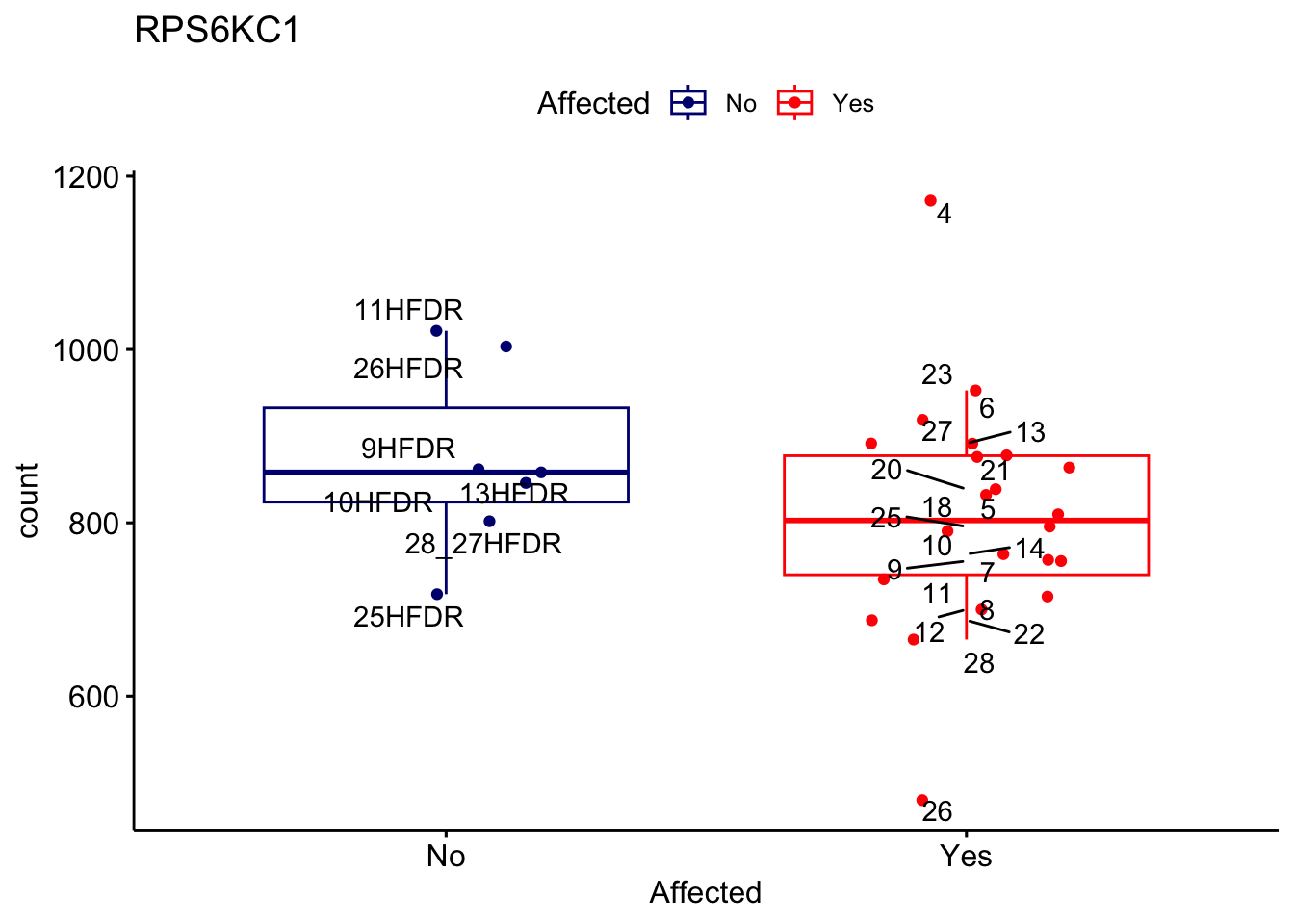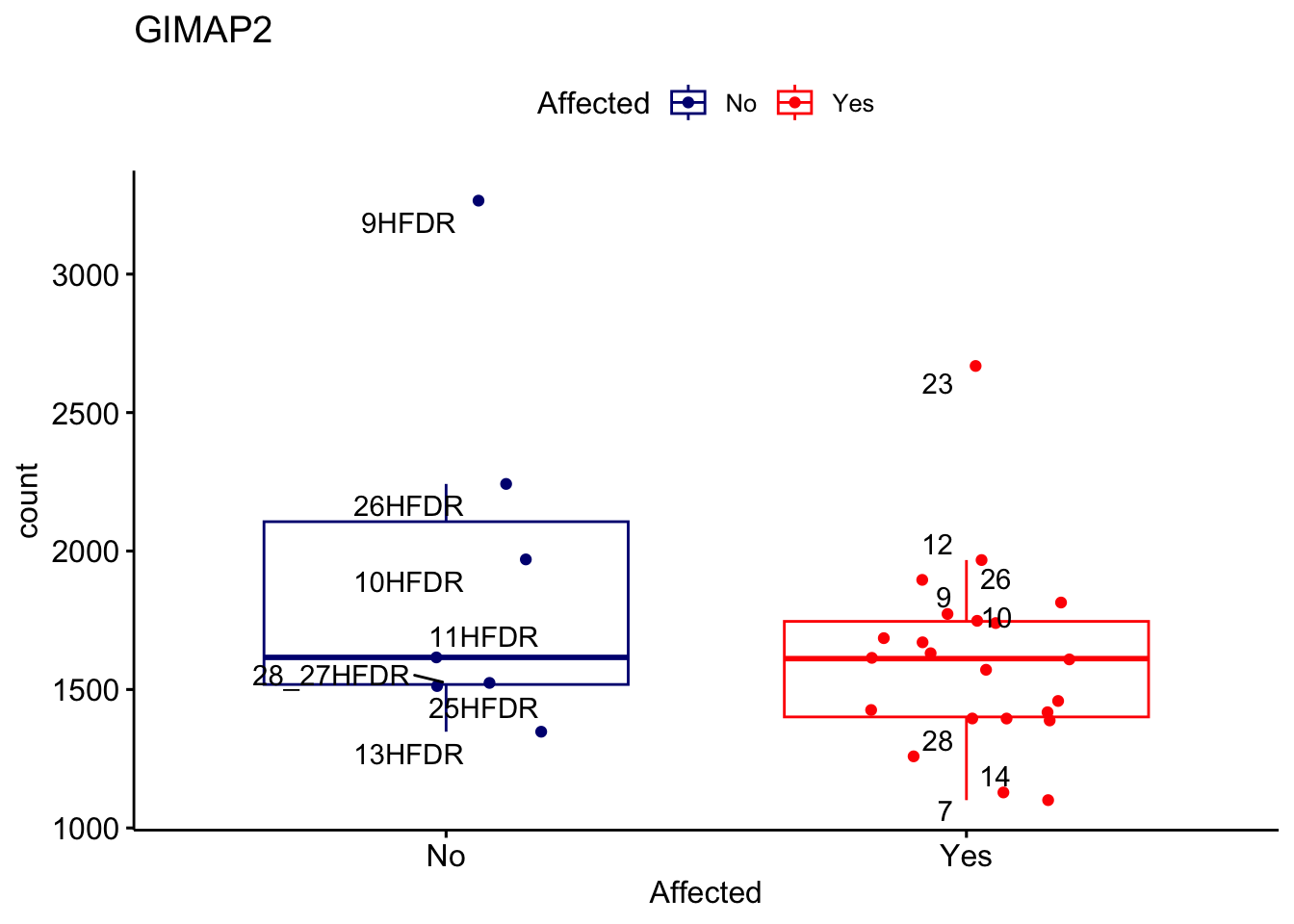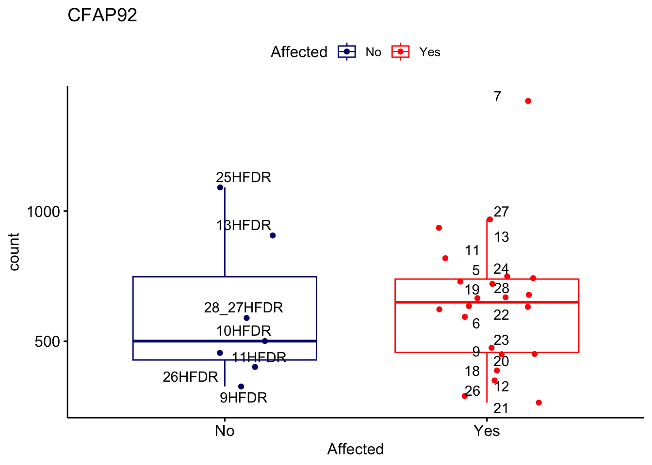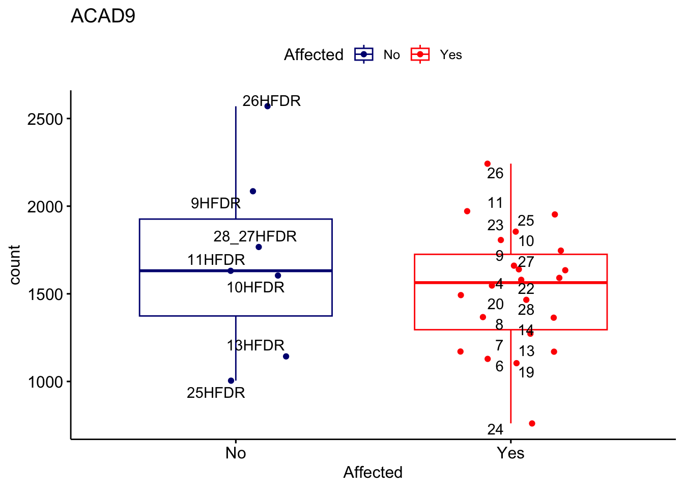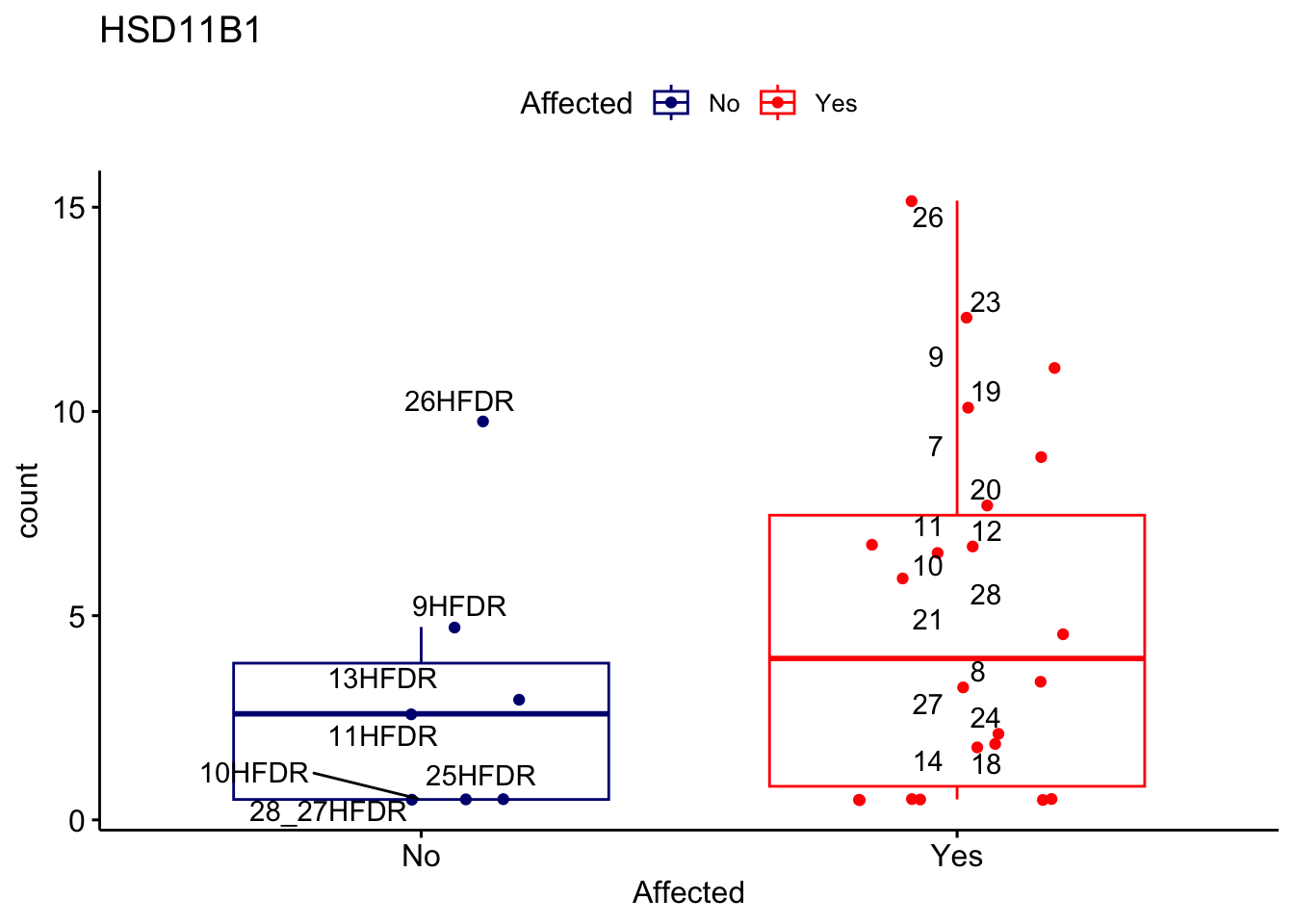 ggplot_box <- ggboxplot(d, x="Affected", y="count", add = "jitter", color = "Affected", palette = c("navy", "red"), title = gene_name) + geom_text_repel(aes(label = rownames(d)))