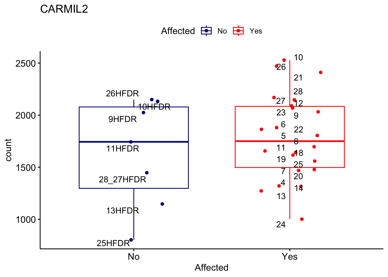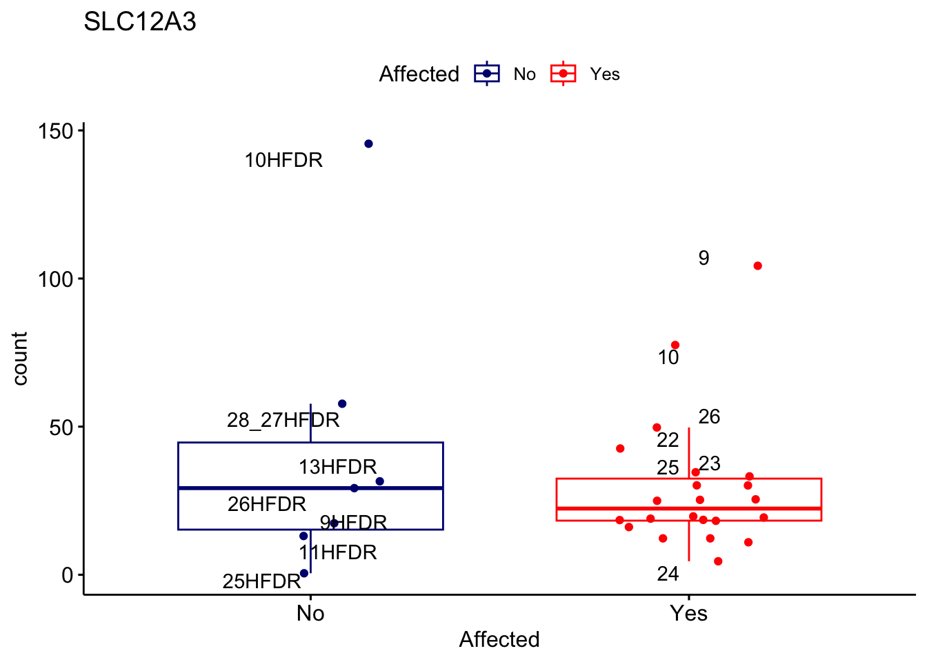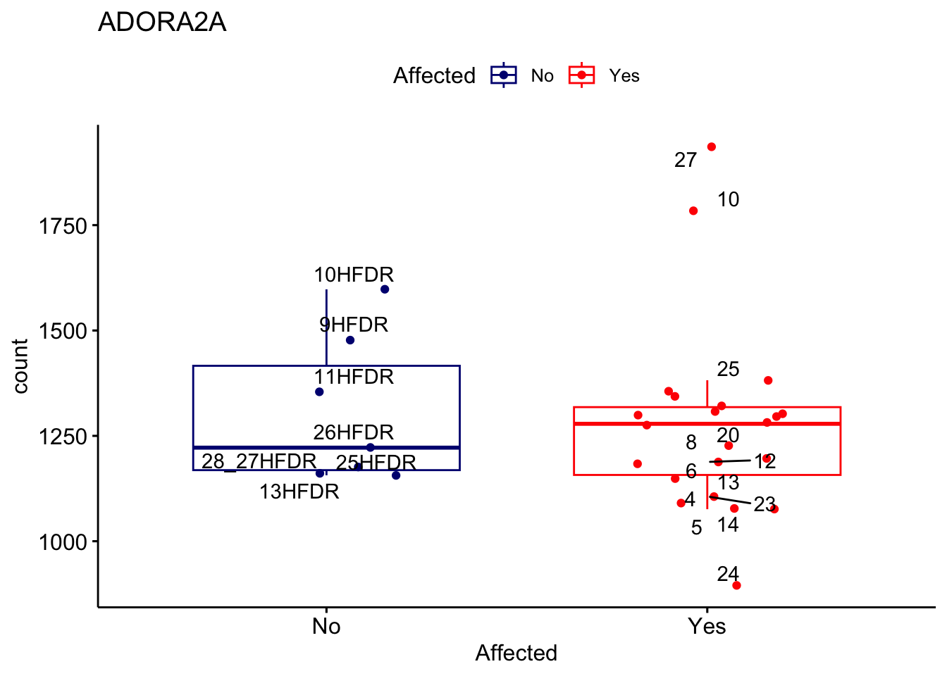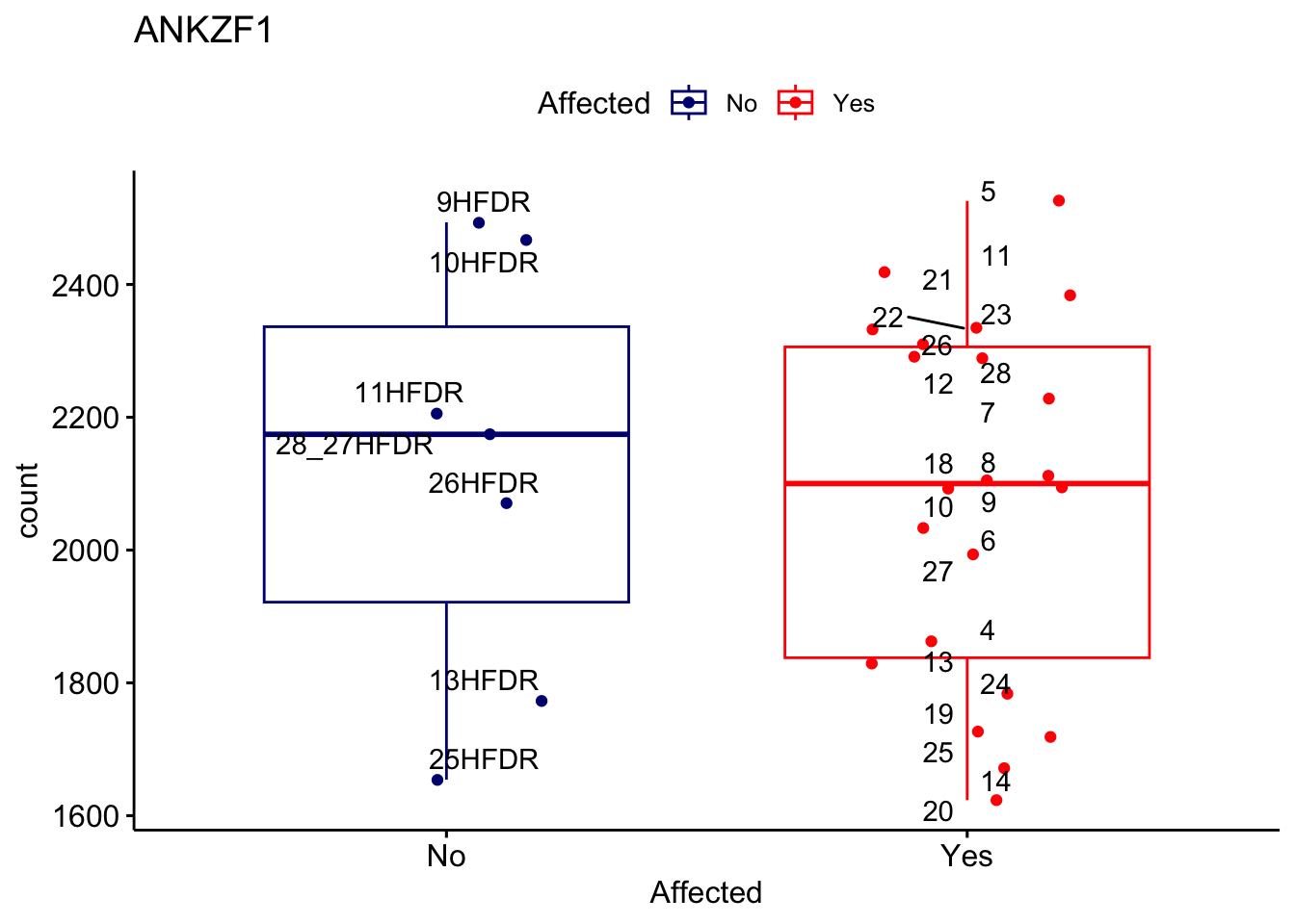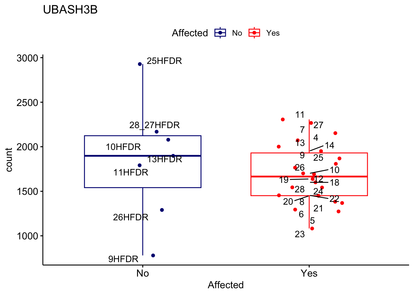 ggplot_box <- ggboxplot(d, x="Affected", y="count", add = "jitter", color = "Affected", palette = c("navy", "red"), title = gene_name) + geom_text_repel(aes(label = rownames(d)))