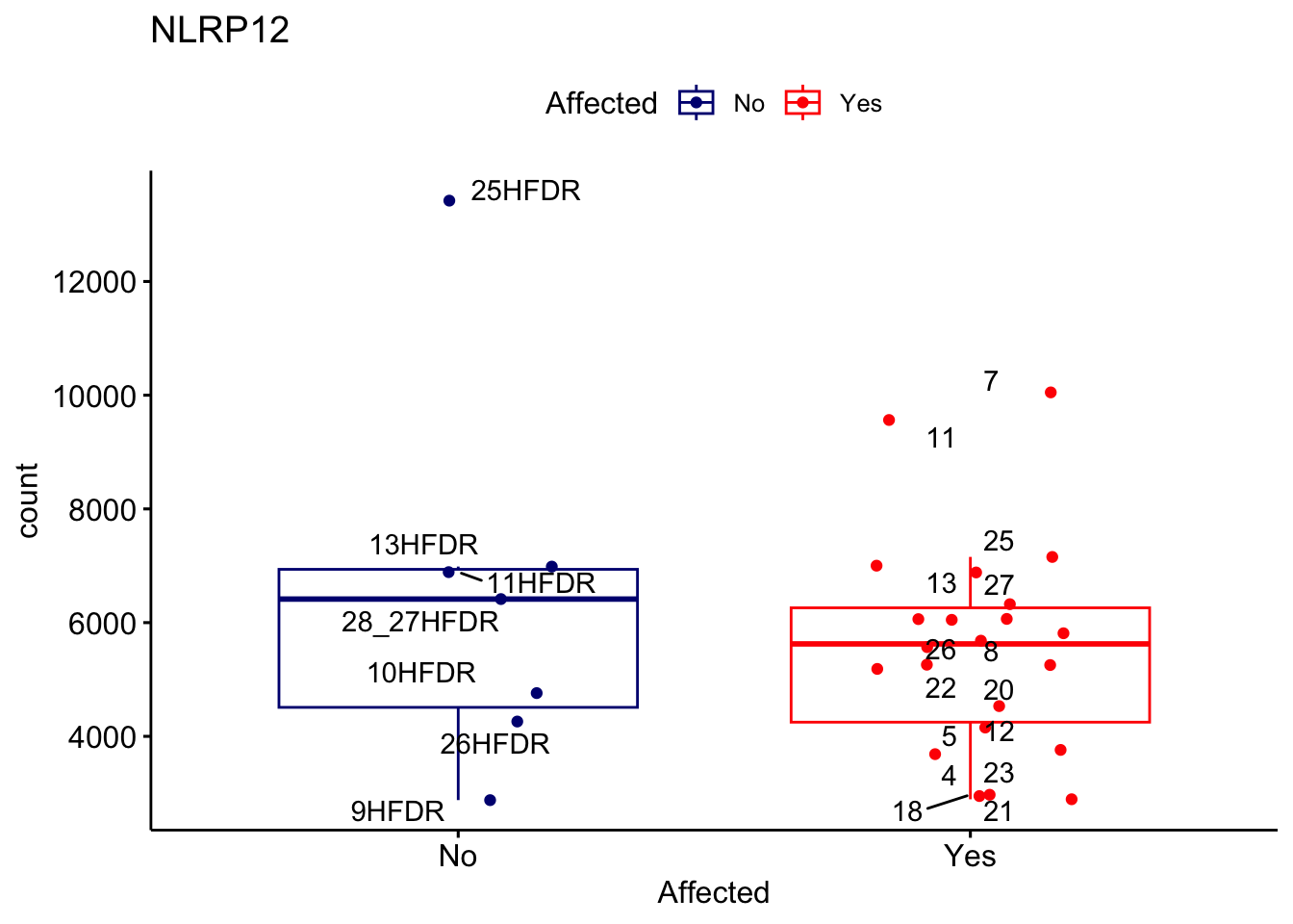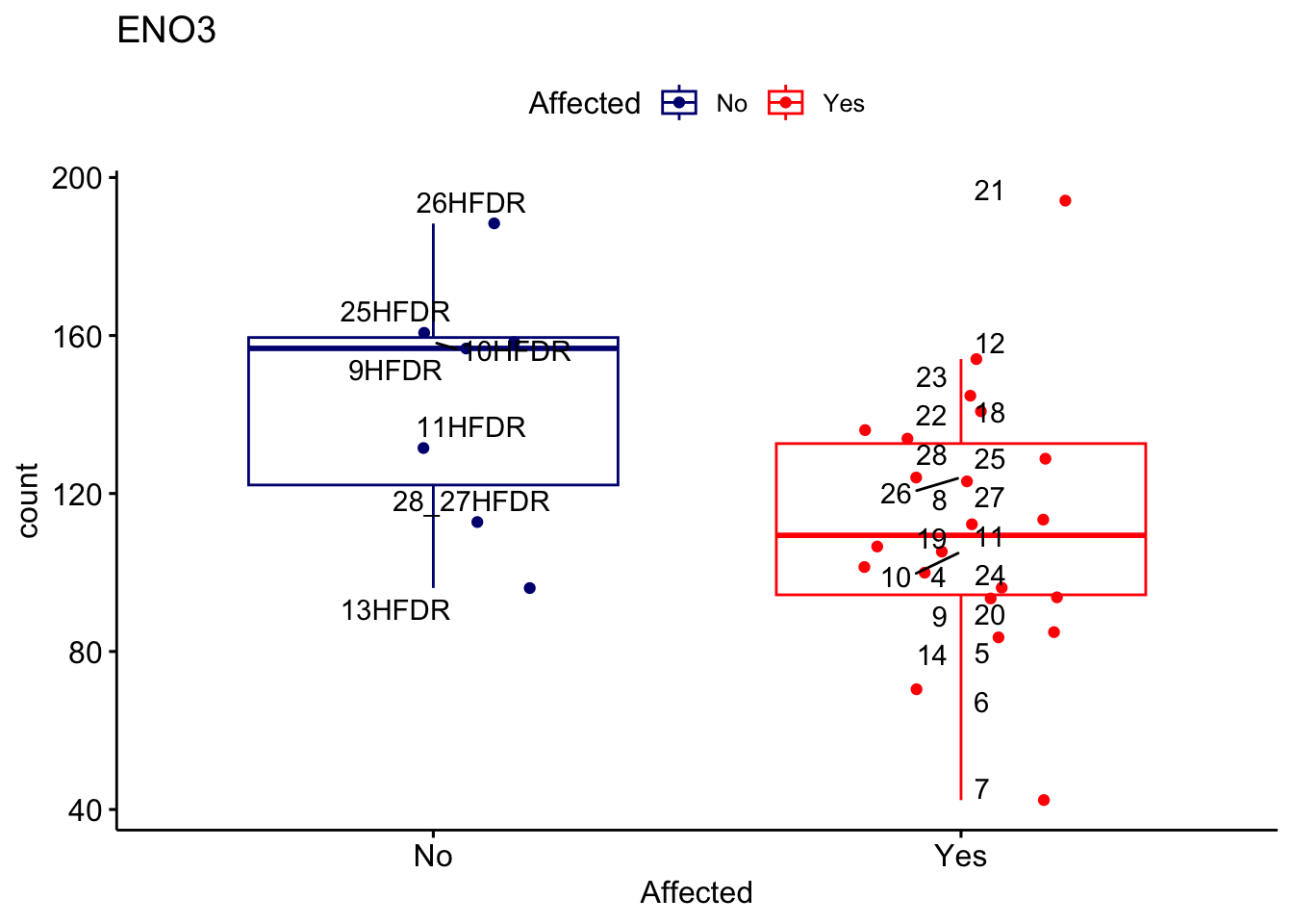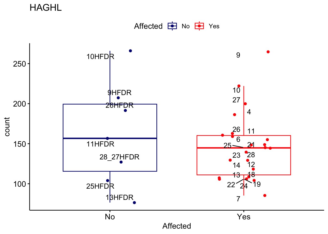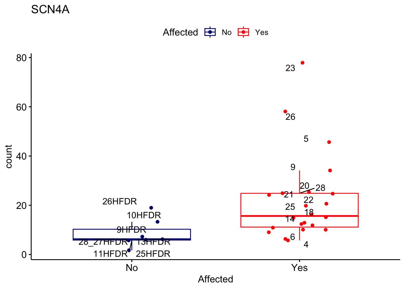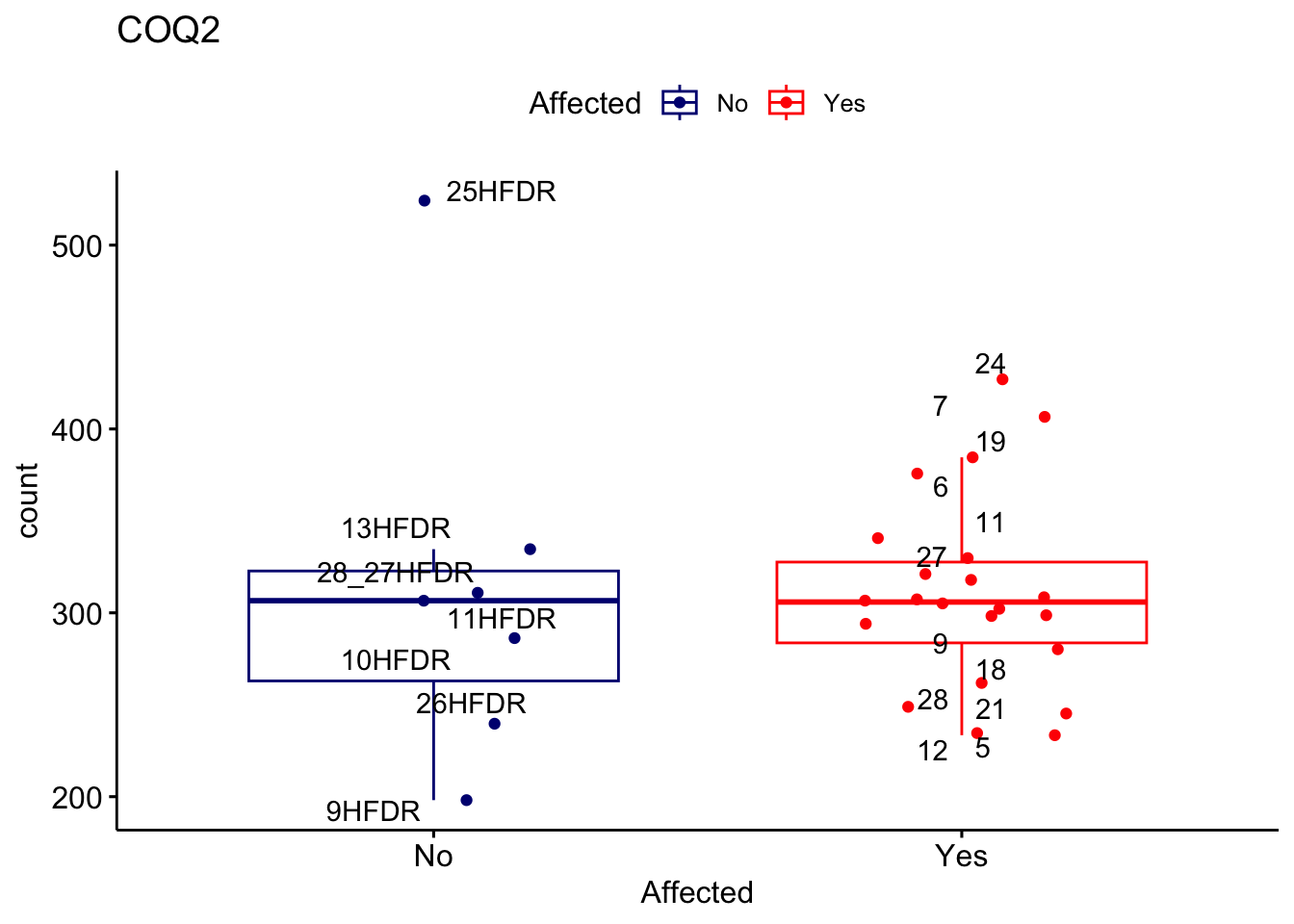 ggplot_box <- ggboxplot(d, x="Affected", y="count", add = "jitter", color = "Affected", palette = c("navy", "red"), title = gene_name) + geom_text_repel(aes(label = rownames(d)))