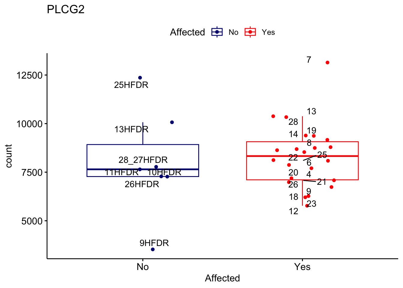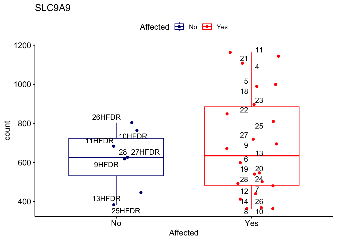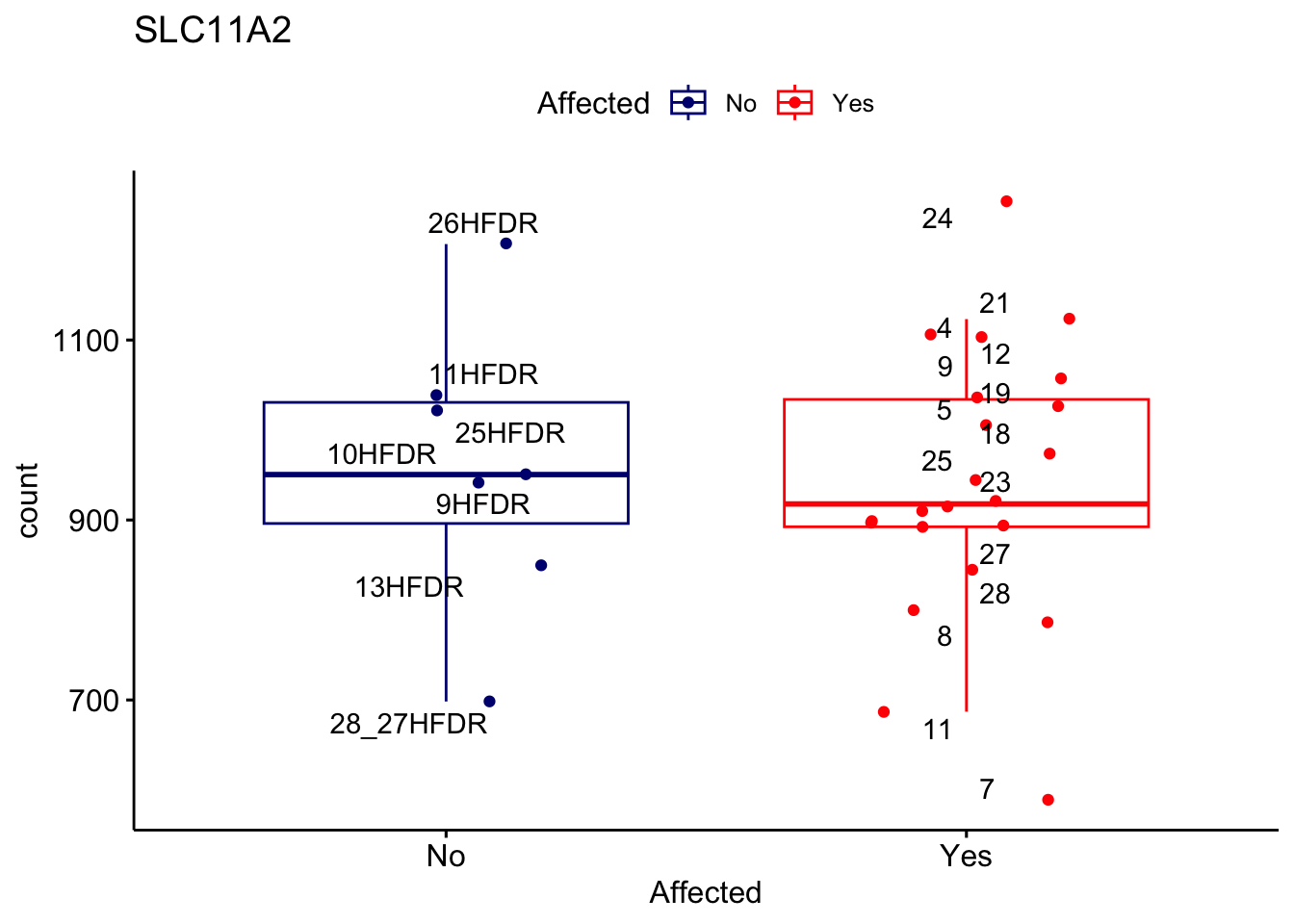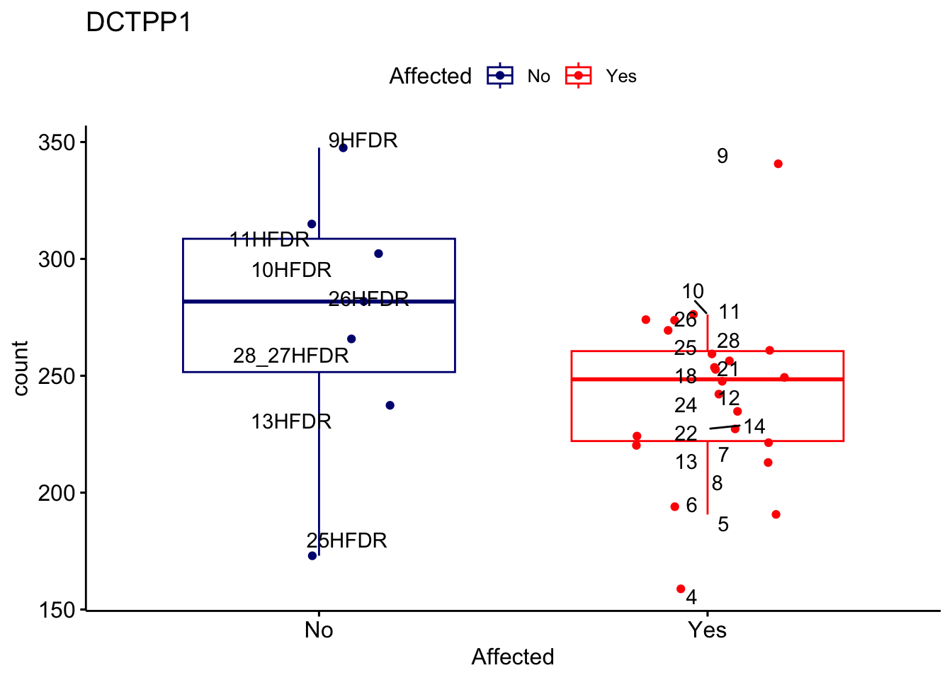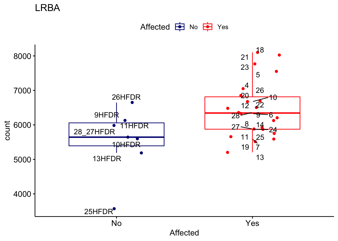 ggplot_box <- ggboxplot(d, x="Affected", y="count", add = "jitter", color = "Affected", palette = c("navy", "red"), title = gene_name) + geom_text_repel(aes(label = rownames(d)))