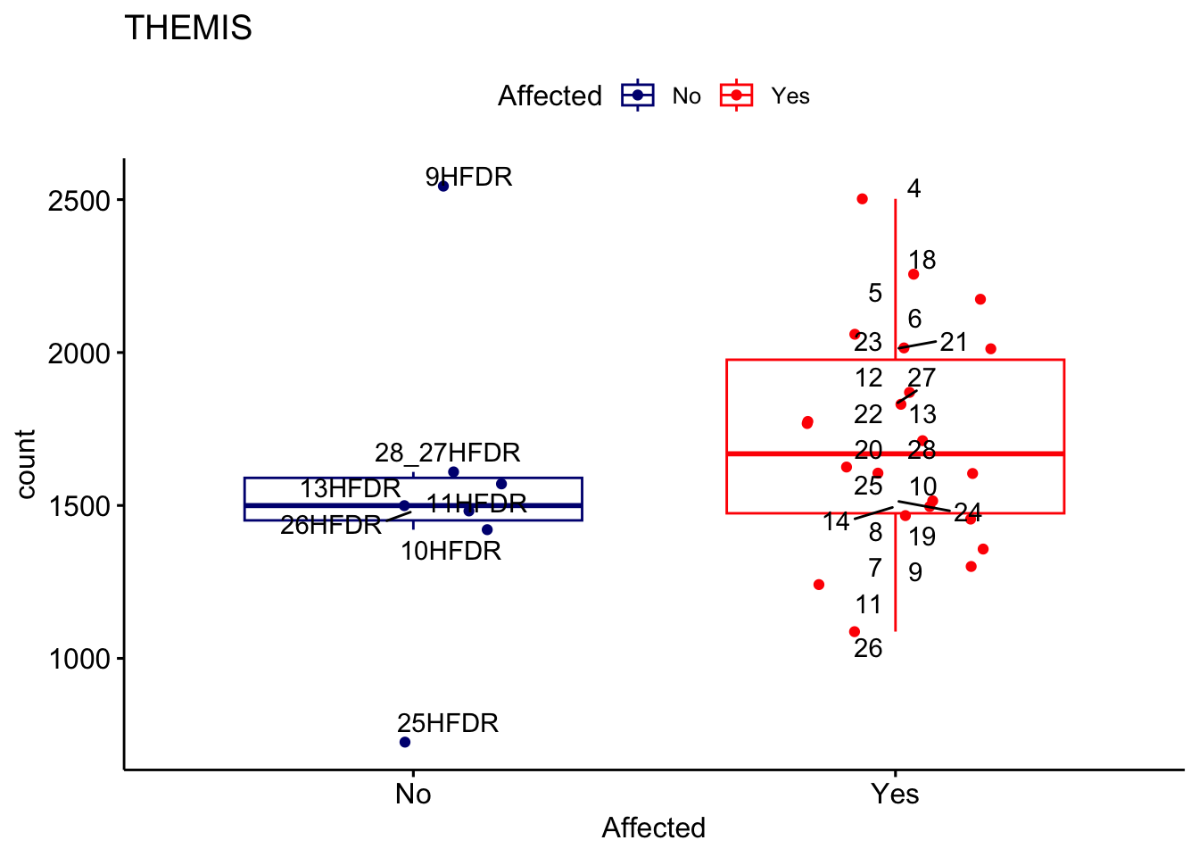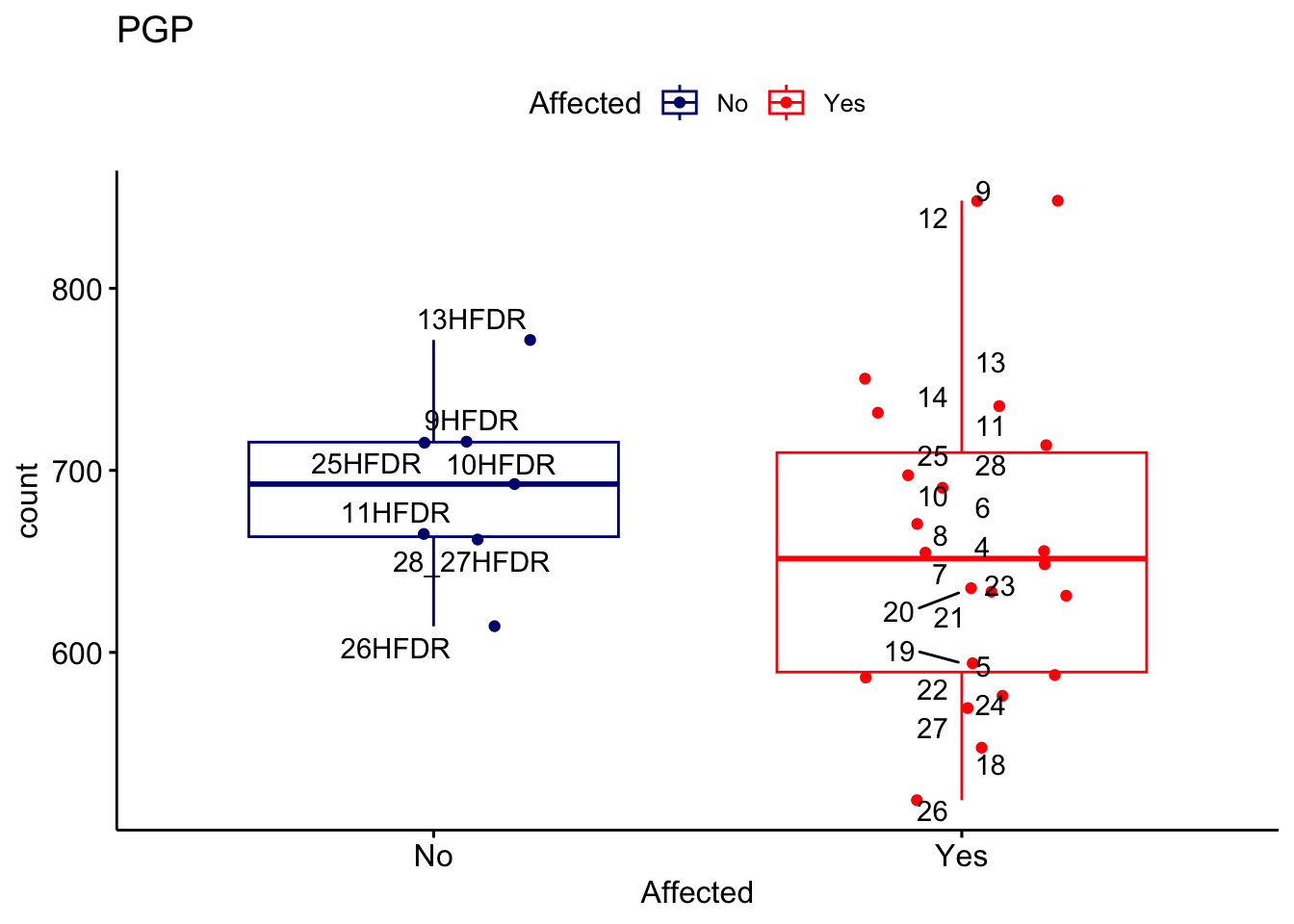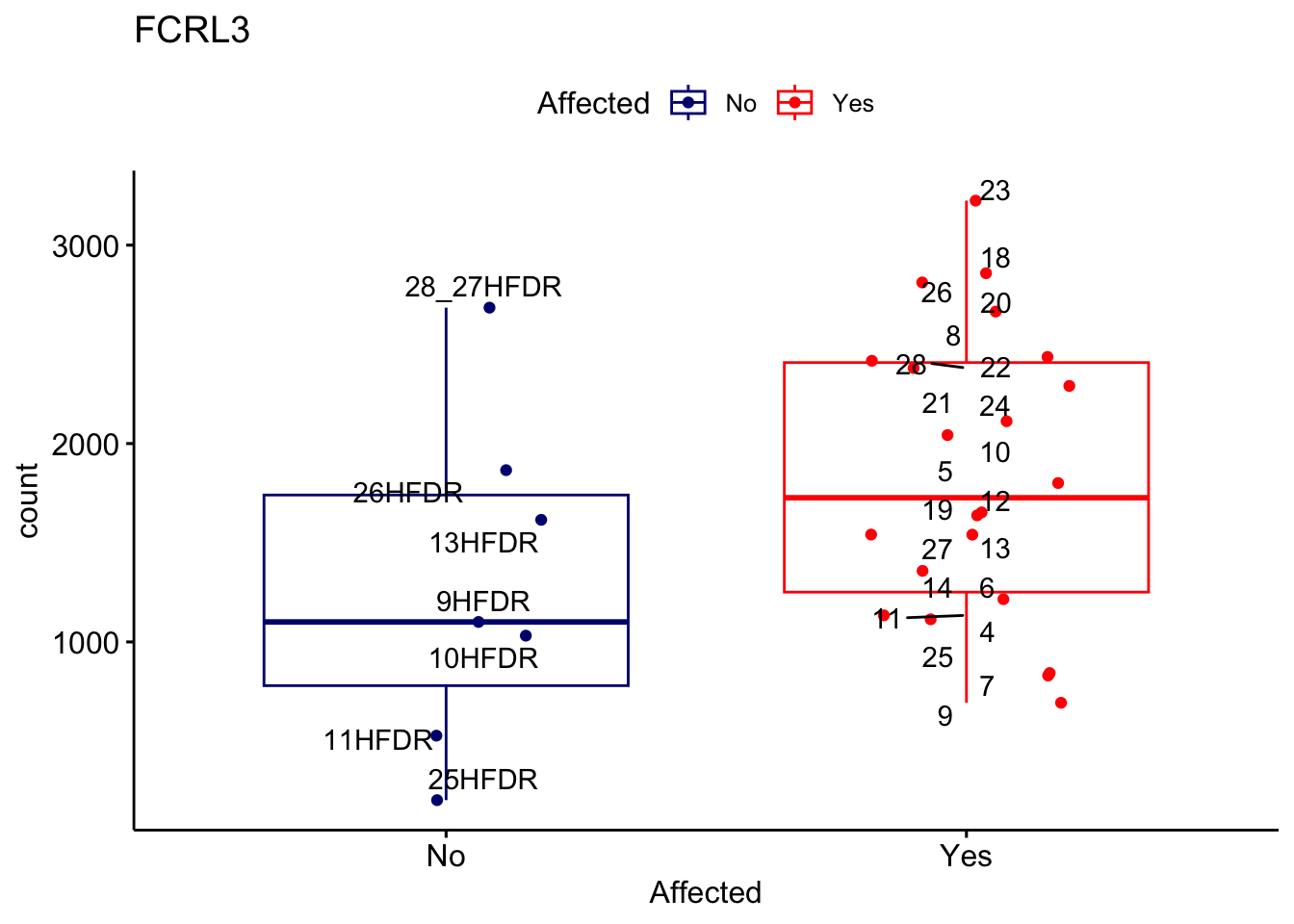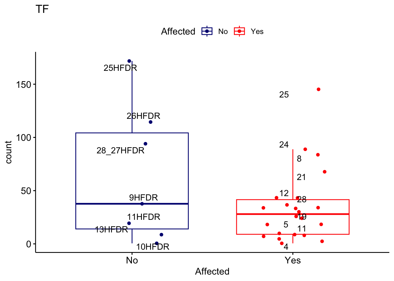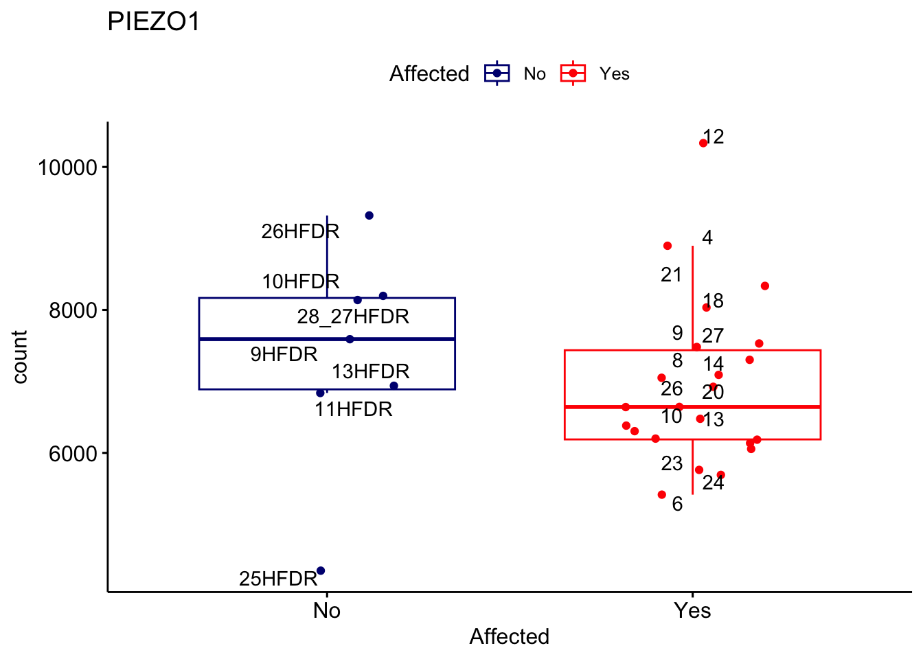 ggplot_box <- ggboxplot(d, x="Affected", y="count", add = "jitter", color = "Affected", palette = c("navy", "red"), title = gene_name) + geom_text_repel(aes(label = rownames(d)))