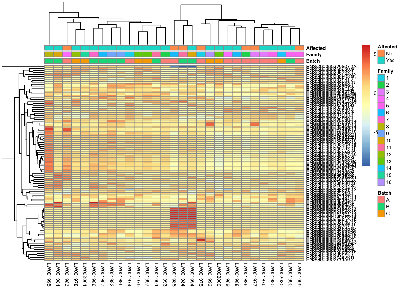 Below is a heatmap highlighting the expression of our genes of interest across batch, disease group, and affected status.