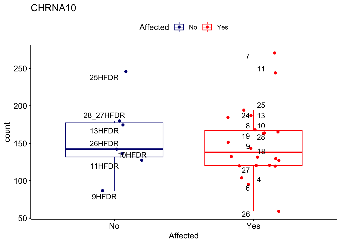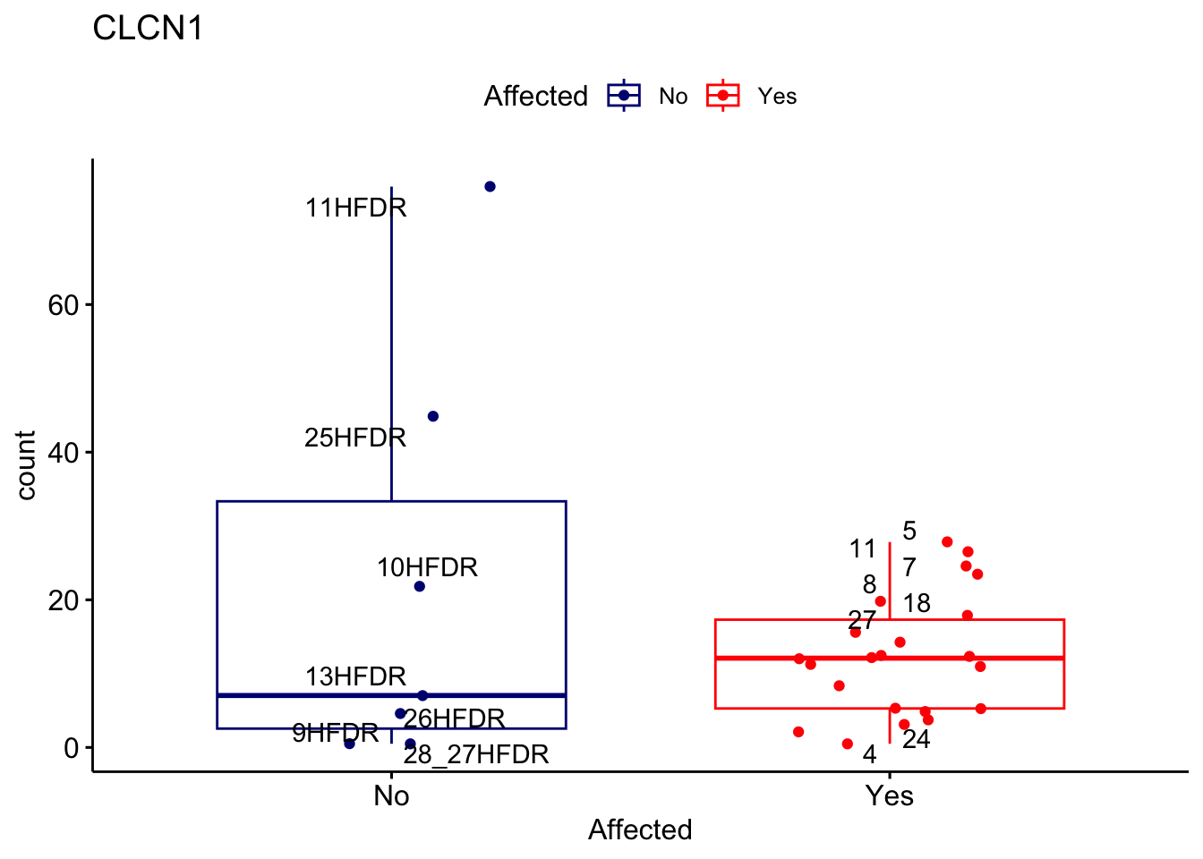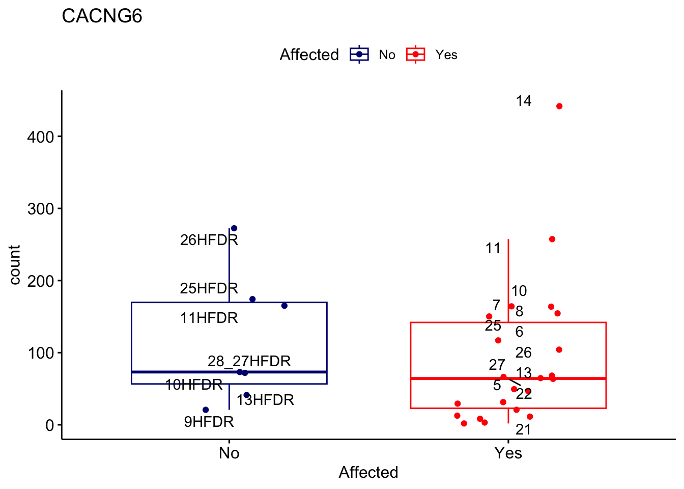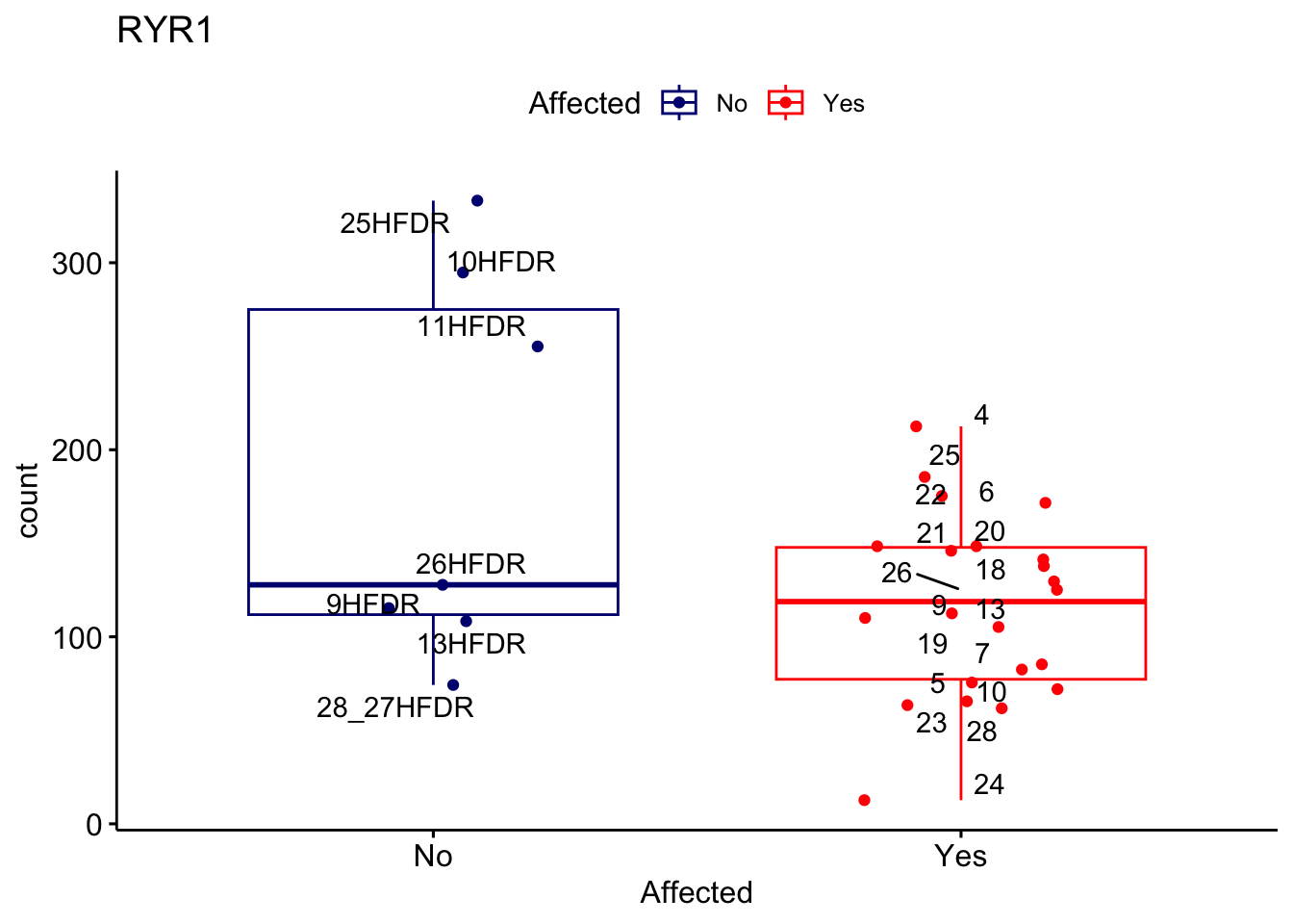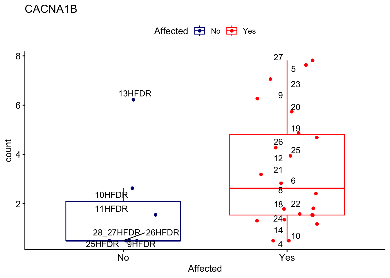 ggplot_box <- ggboxplot(d, x="Affected", y="count", add = "jitter", color = "Affected", palette = c("navy", "red"), title = gene_name) + geom_text_repel(aes(label = rownames(d)))