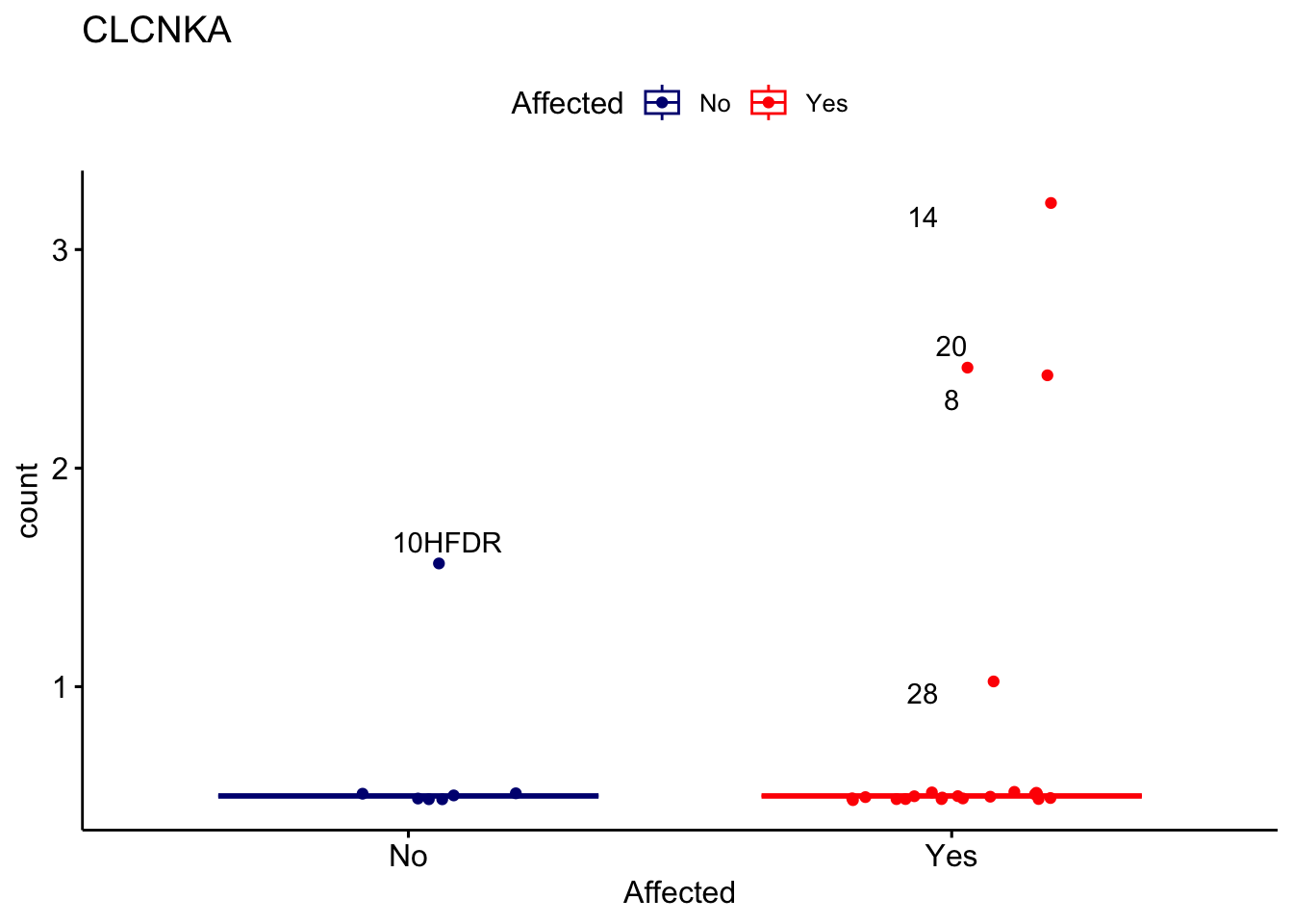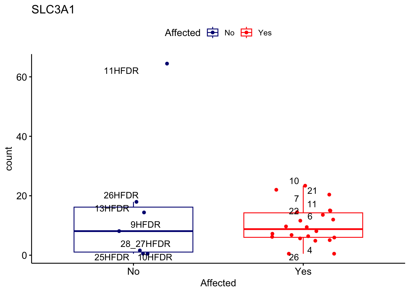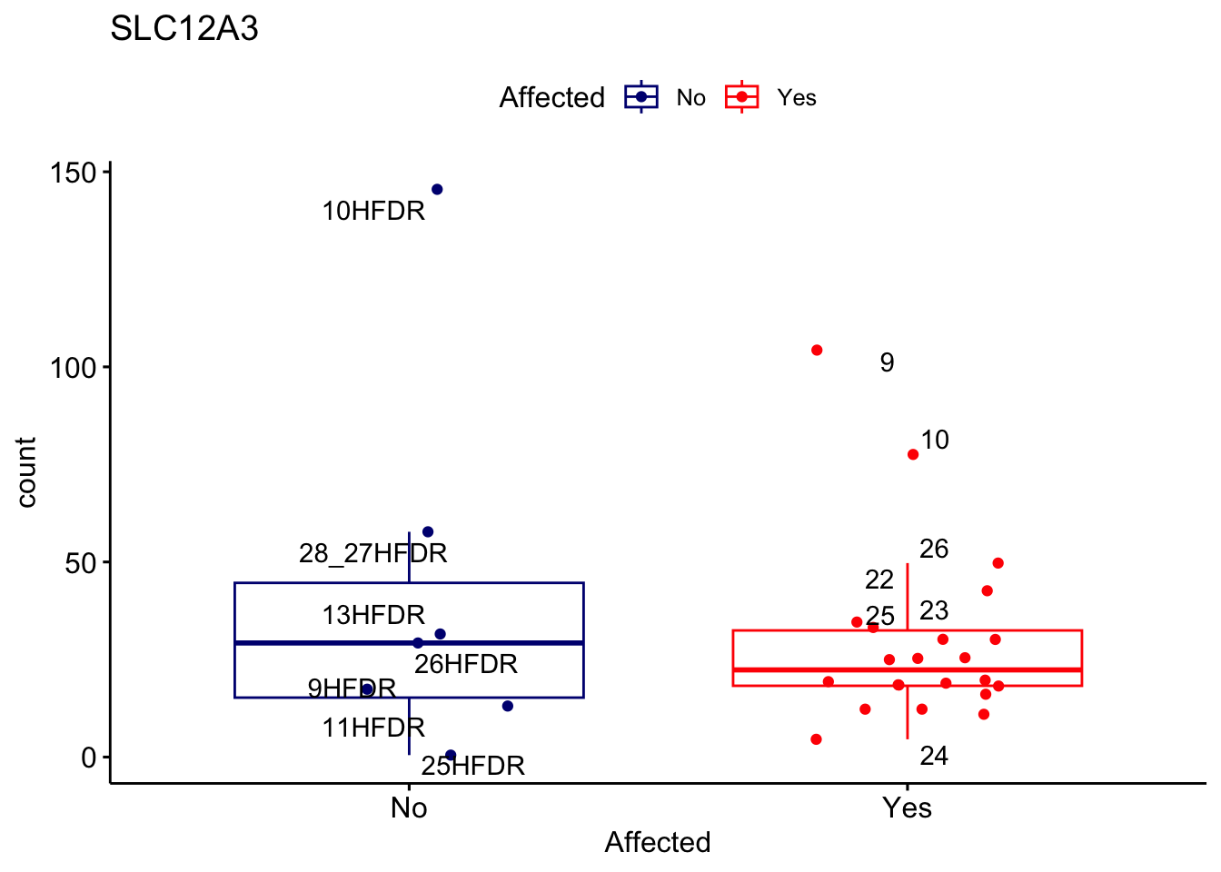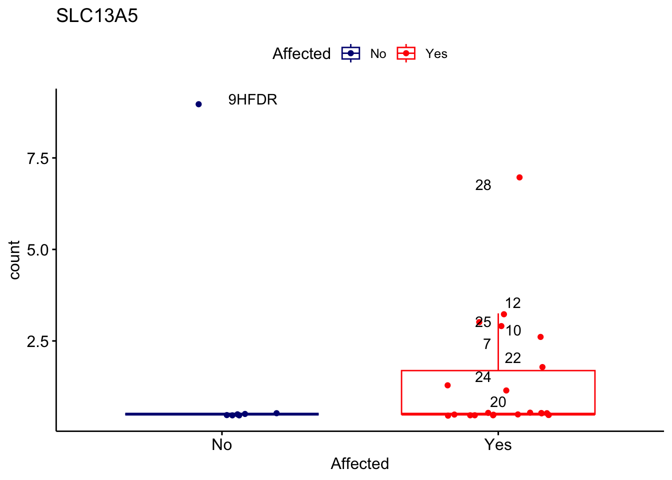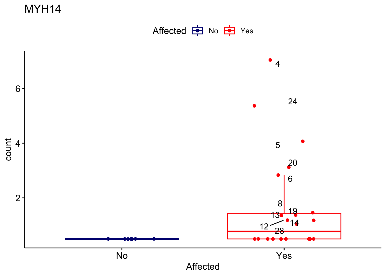 ggplot_box <- ggboxplot(d, x="Affected", y="count", add = "jitter", color = "Affected", palette = c("navy", "red"), title = gene_name) + geom_text_repel(aes(label = rownames(d)))