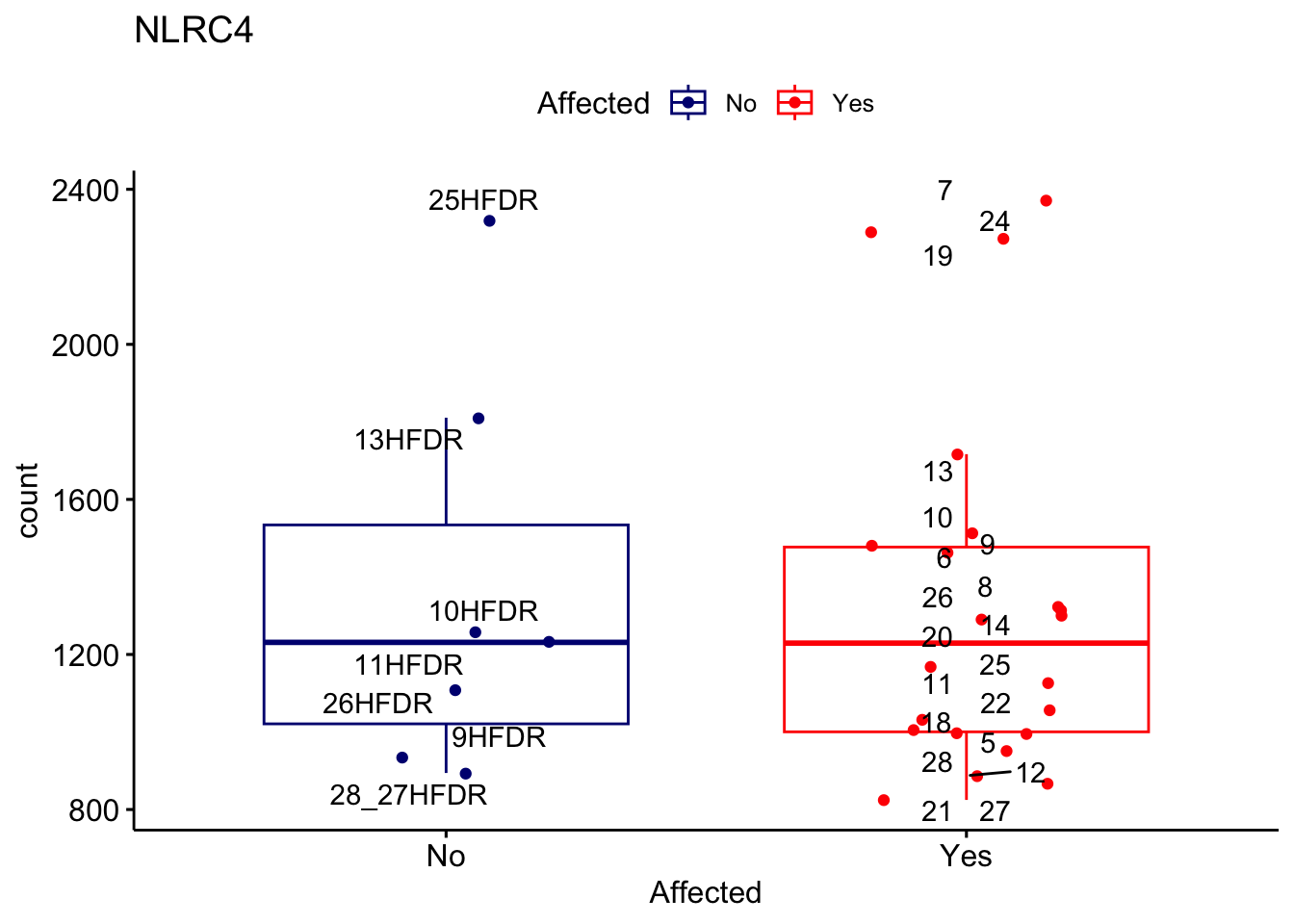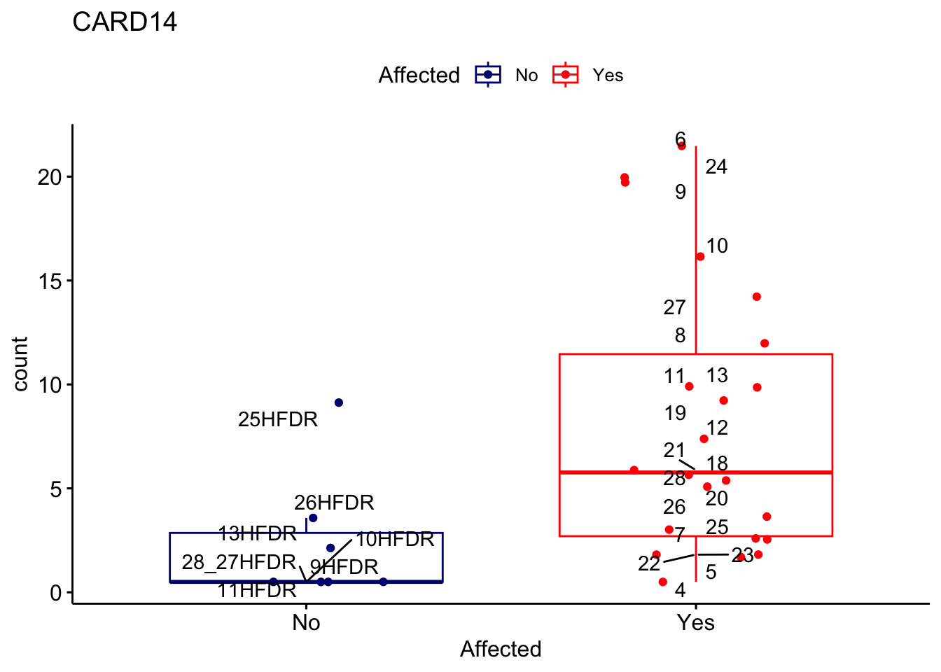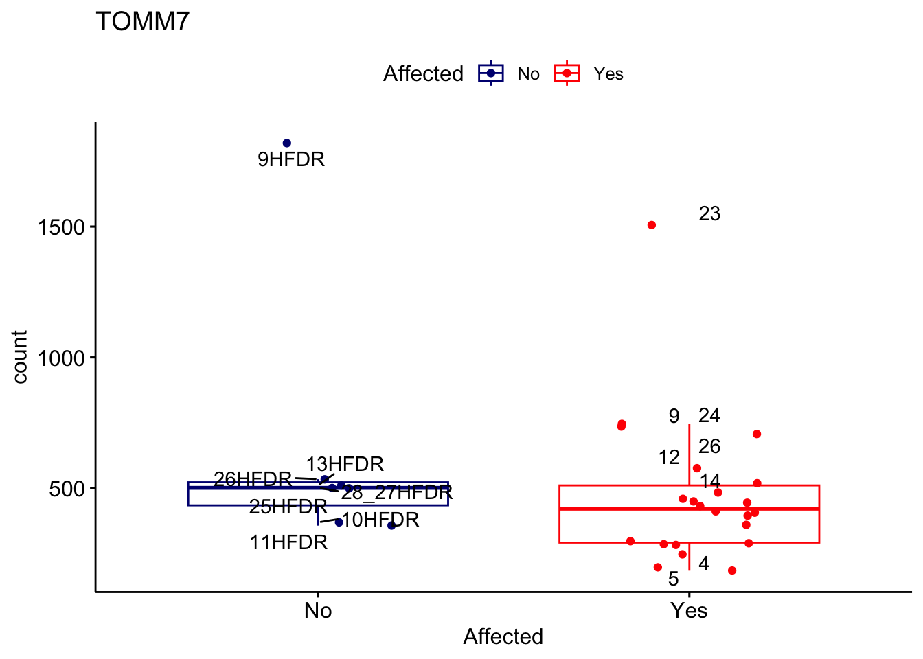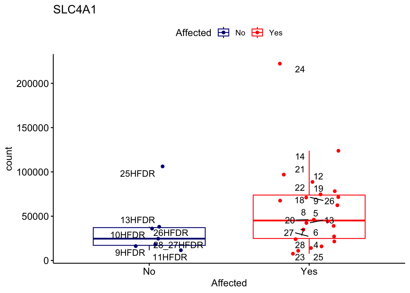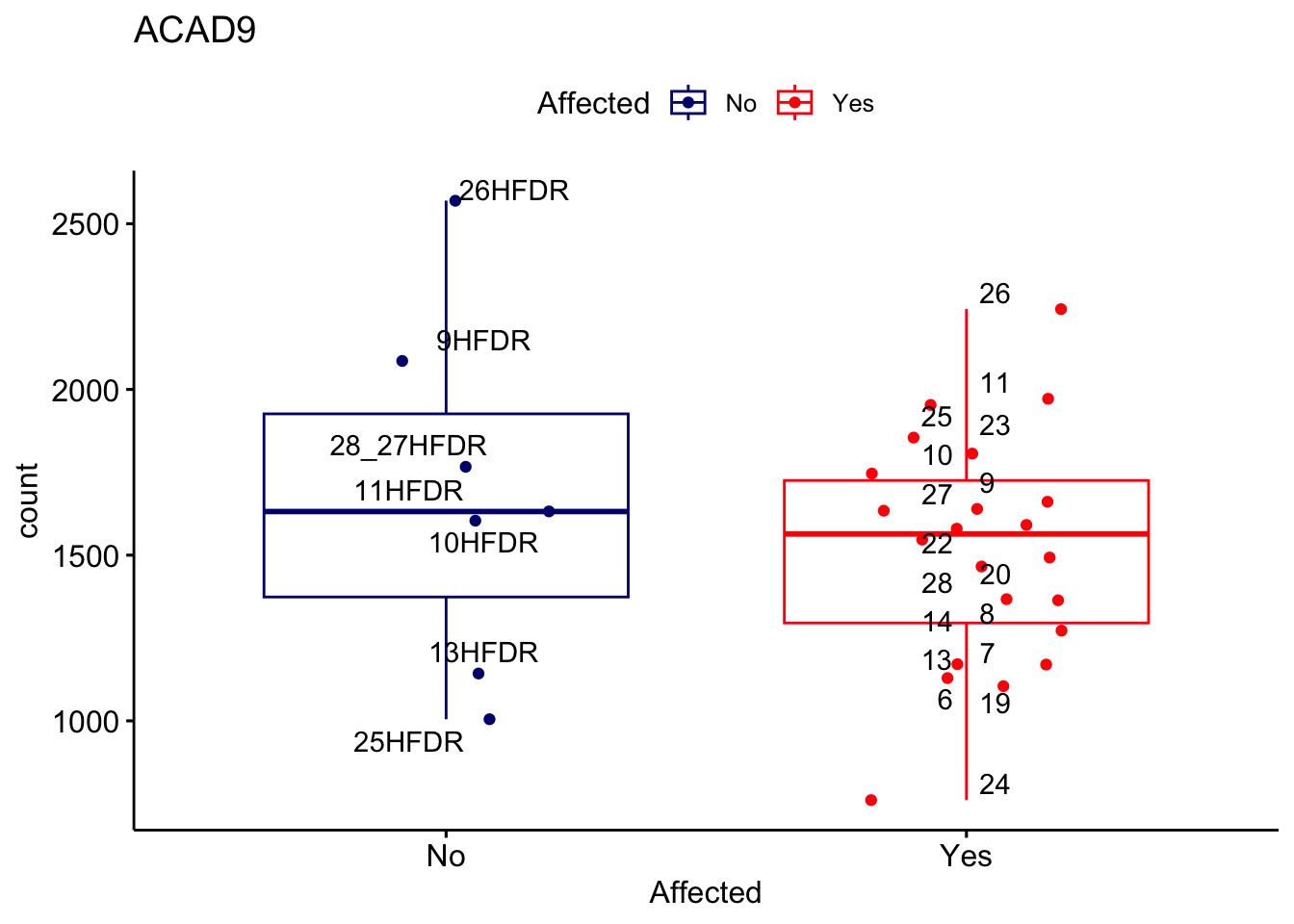 ggplot_box <- ggboxplot(d, x="Affected", y="count", add = "jitter", color = "Affected", palette = c("navy", "red"), title = gene_name) + geom_text_repel(aes(label = rownames(d)))
