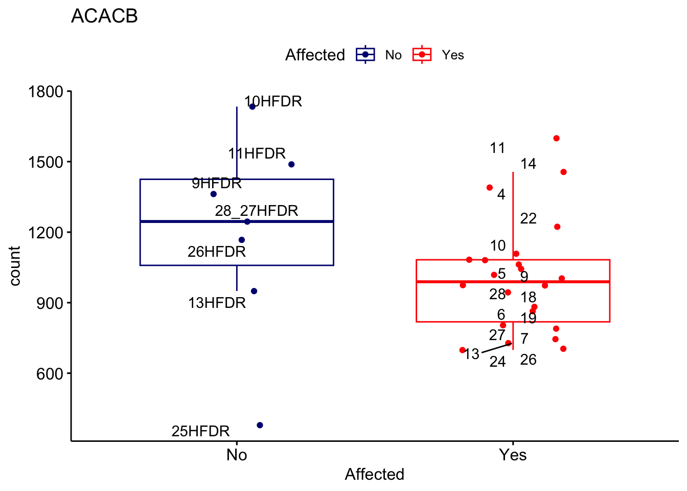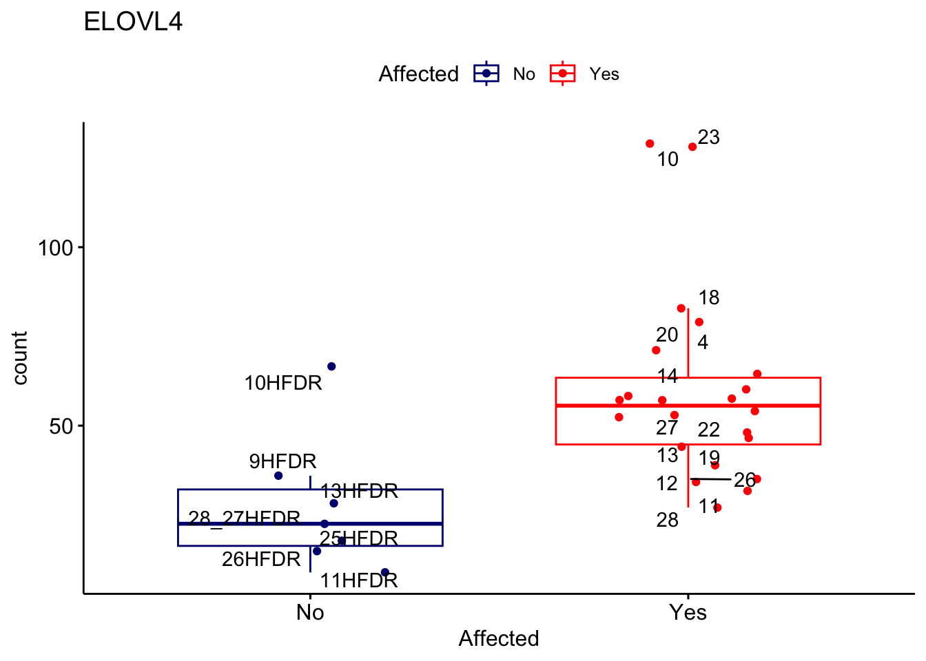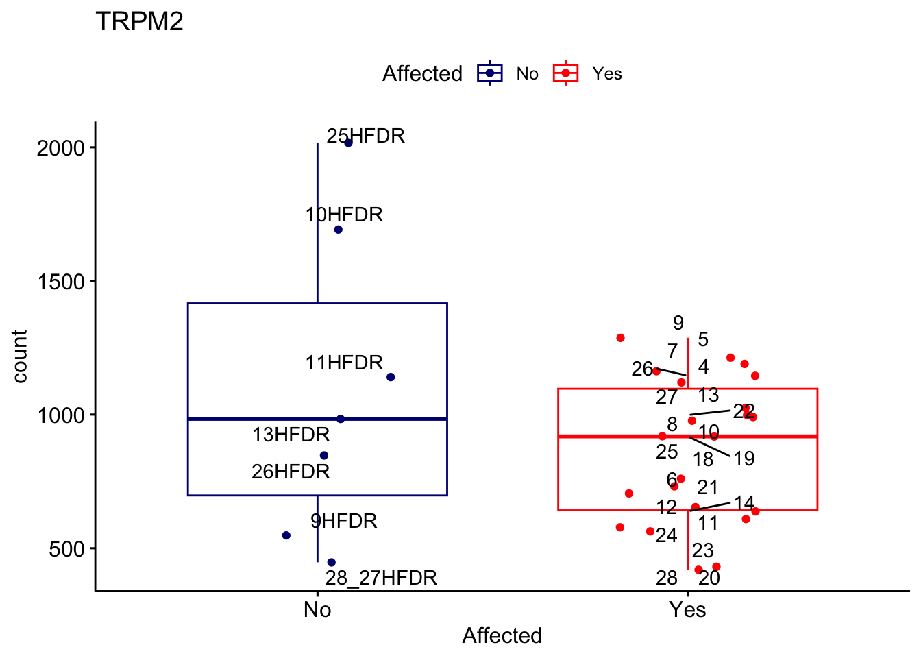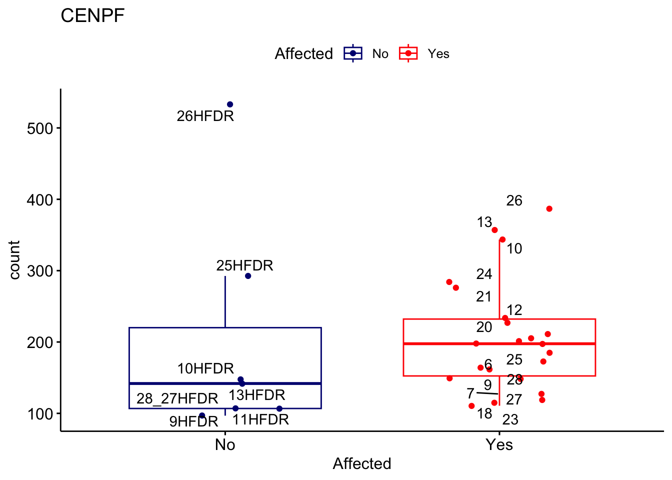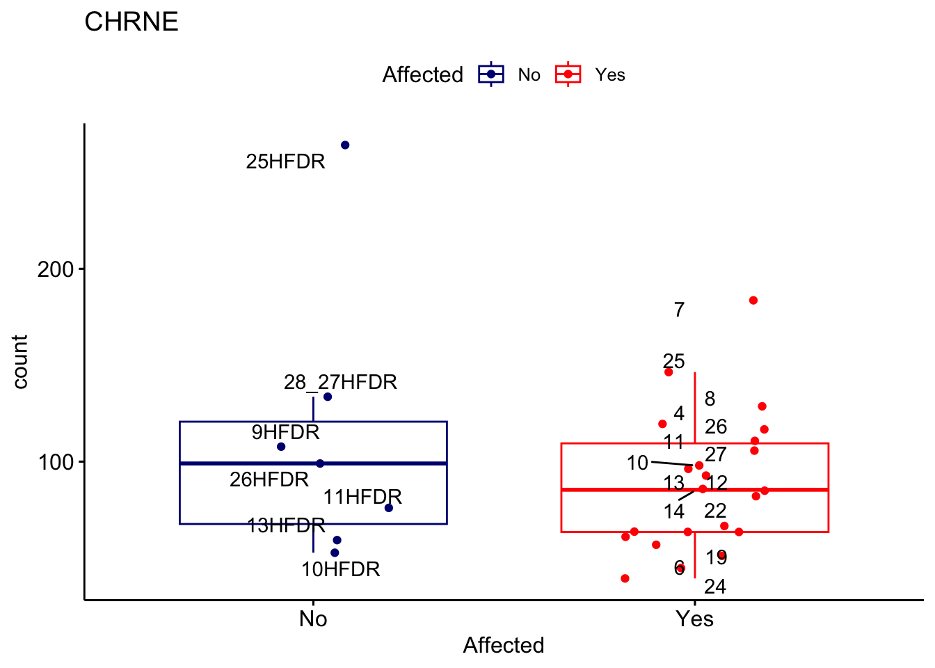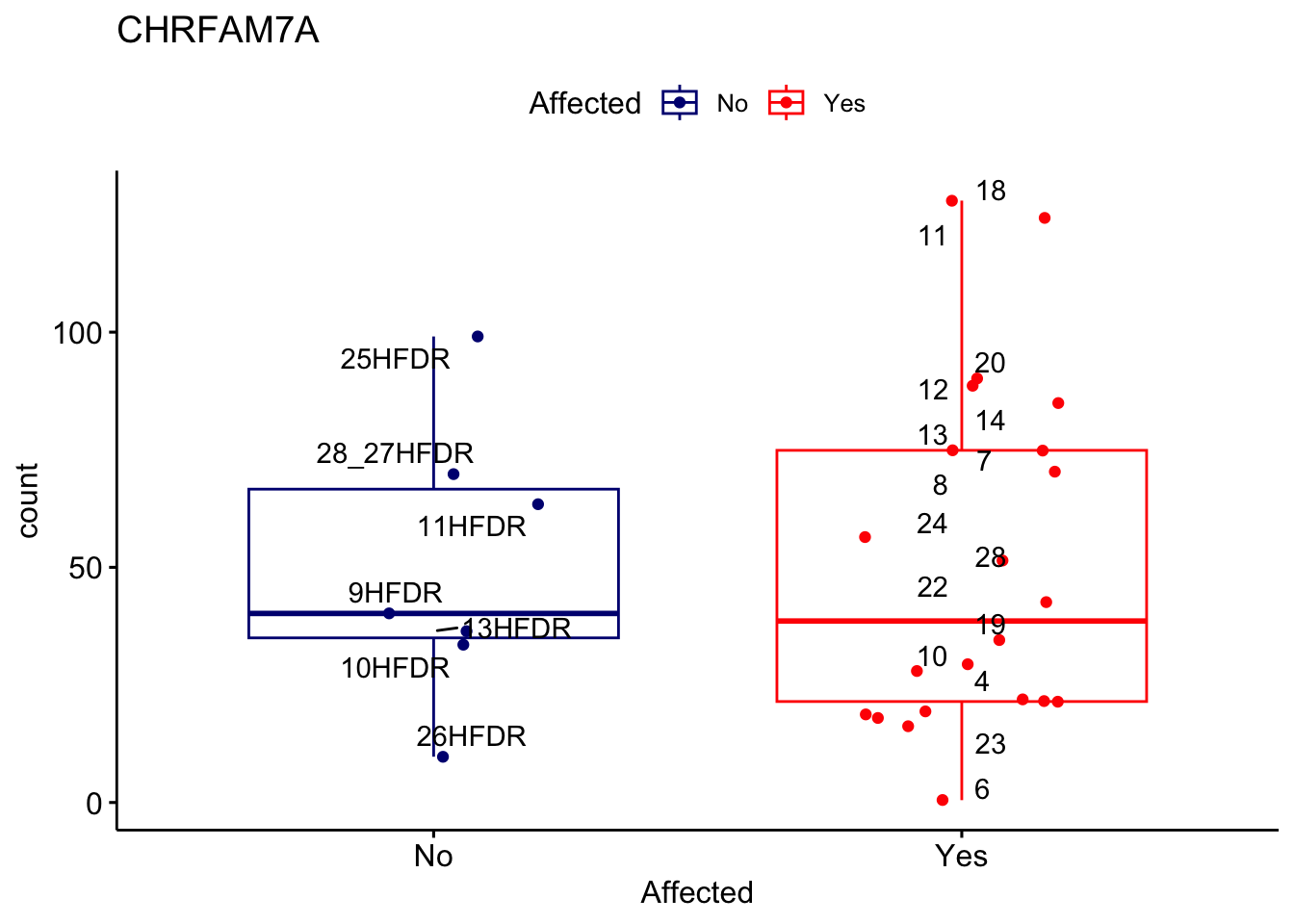 ggplot_box <- ggboxplot(d, x="Affected", y="count", add = "jitter", color = "Affected", palette = c("navy", "red"), title = gene_name) + geom_text_repel(aes(label = rownames(d)))