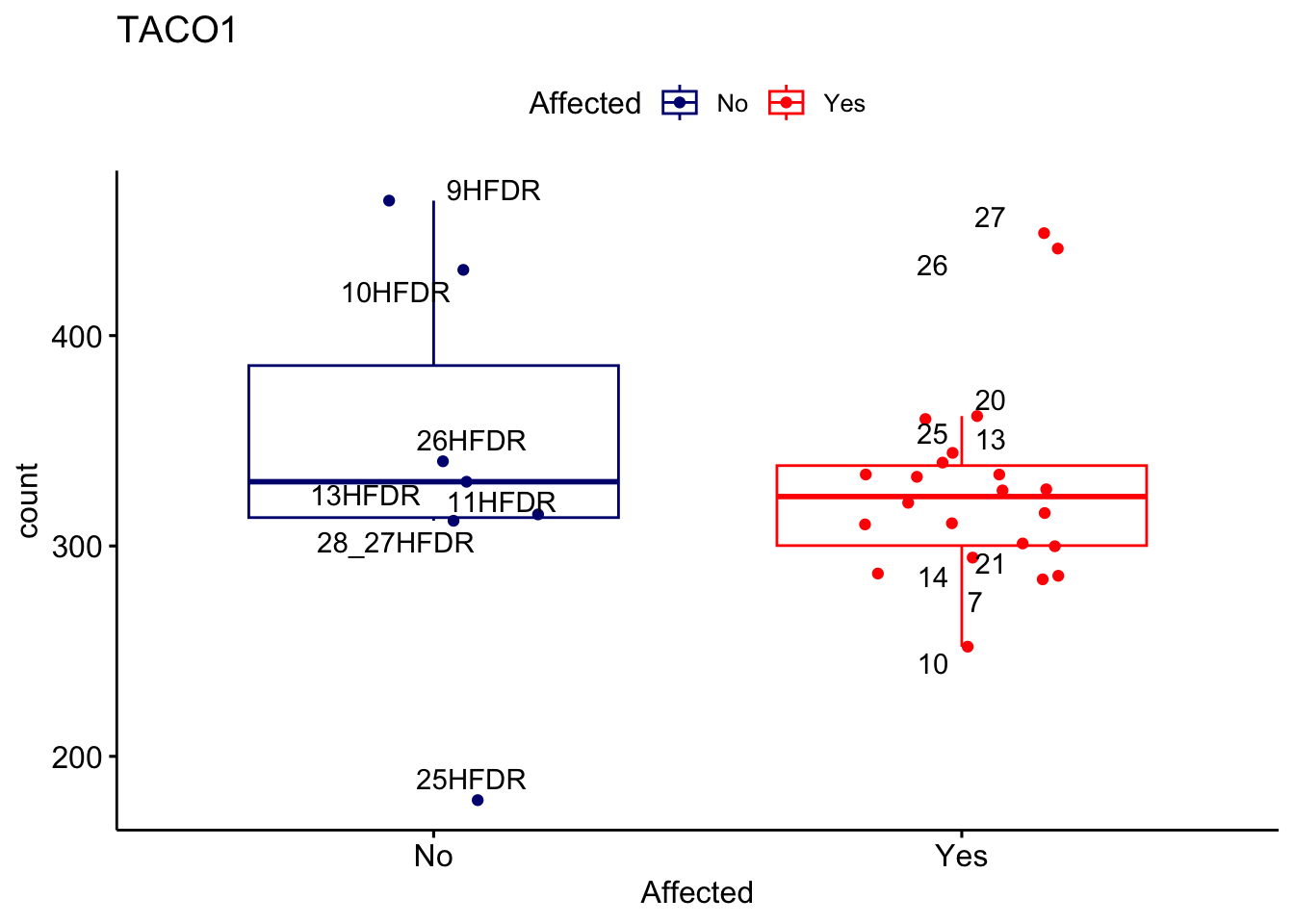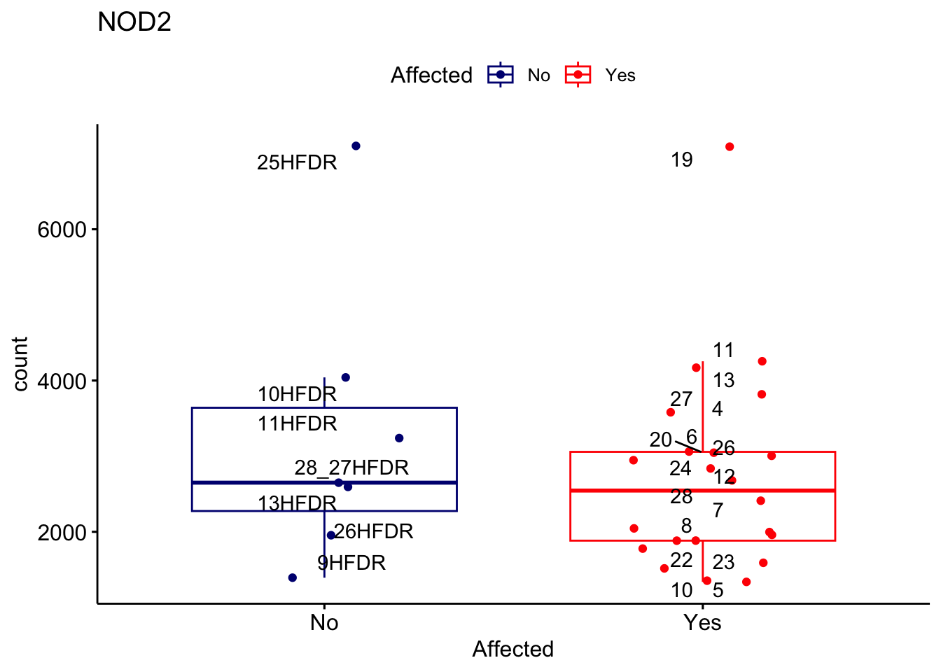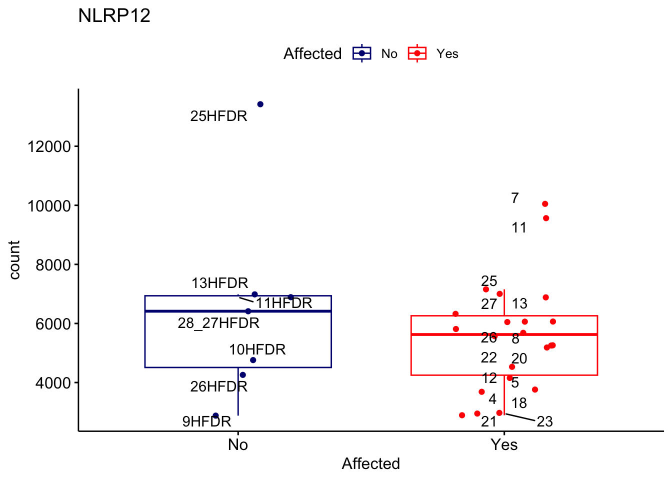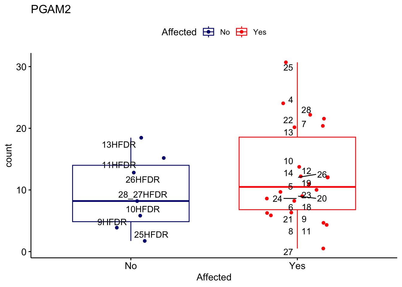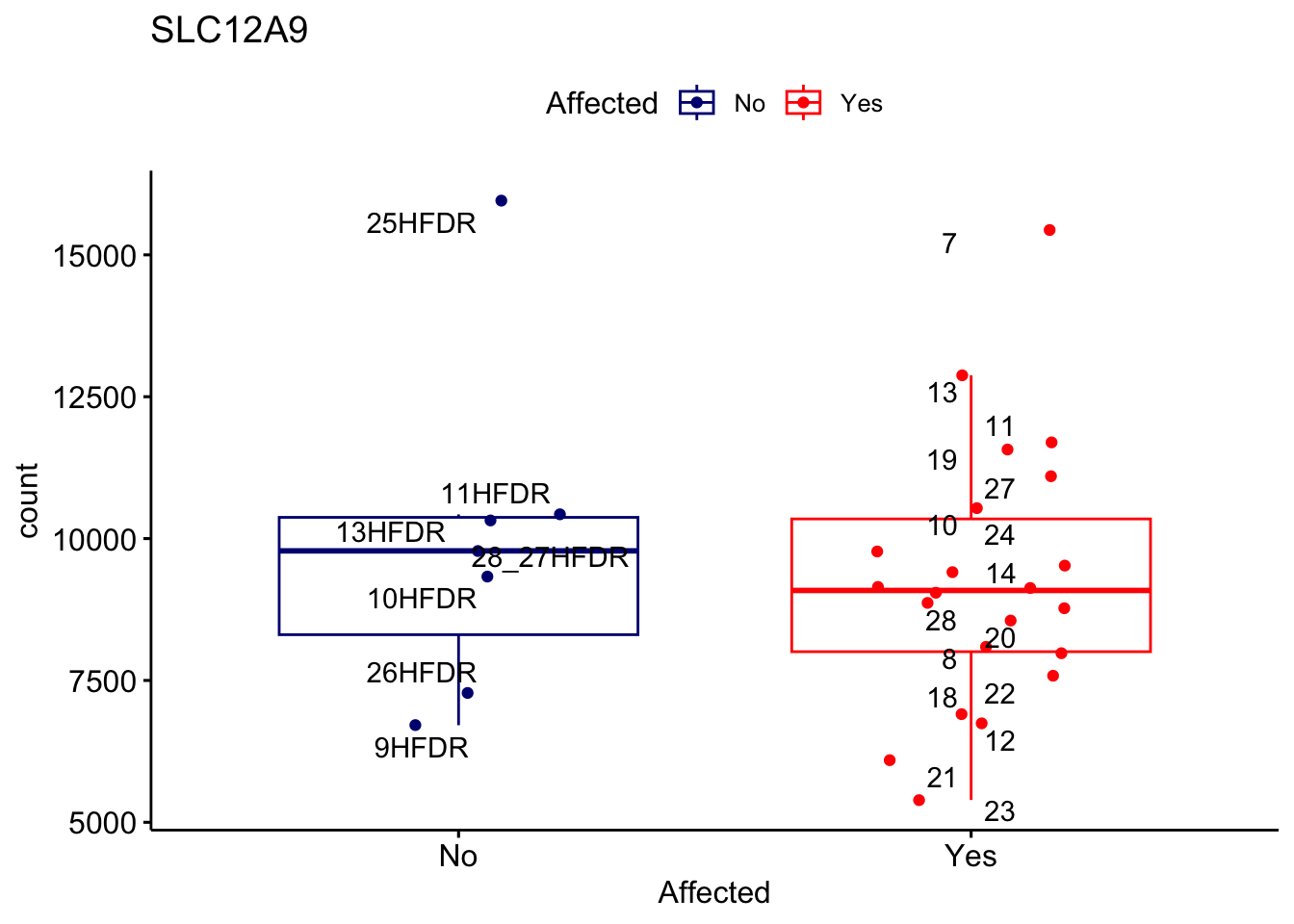 ggplot_box <- ggboxplot(d, x="Affected", y="count", add = "jitter", color = "Affected", palette = c("navy", "red"), title = gene_name) + geom_text_repel(aes(label = rownames(d)))