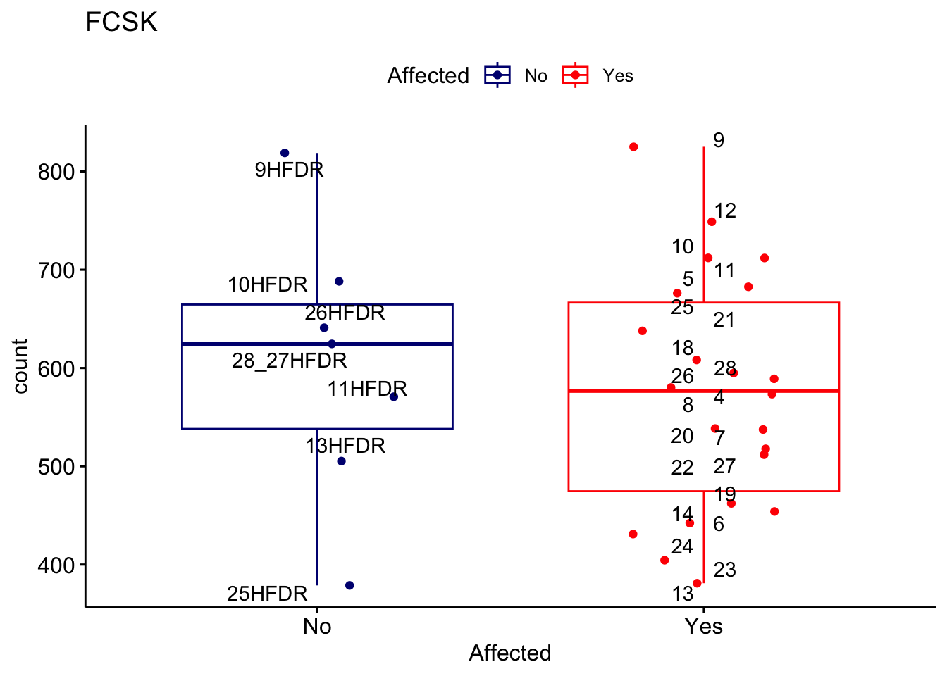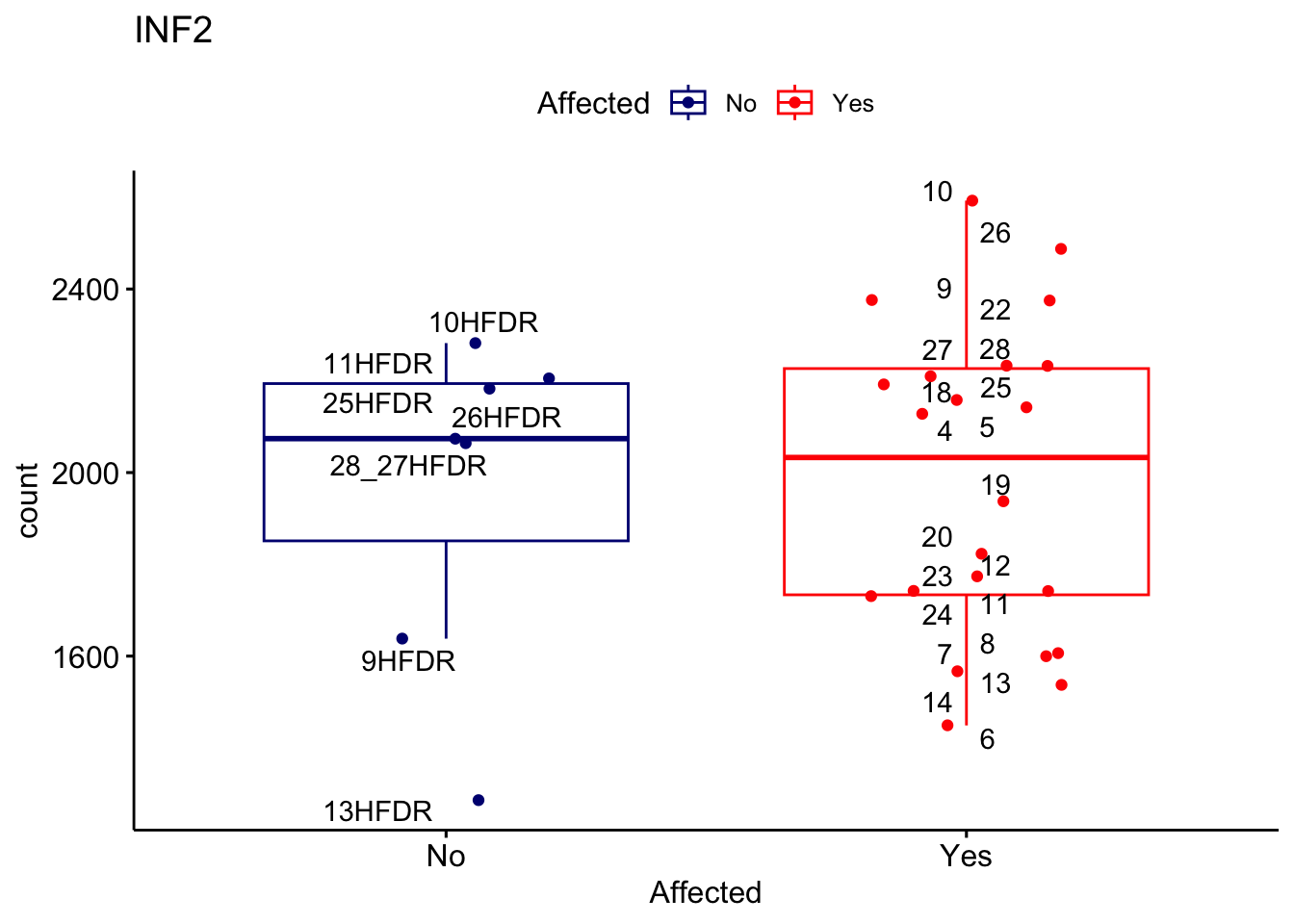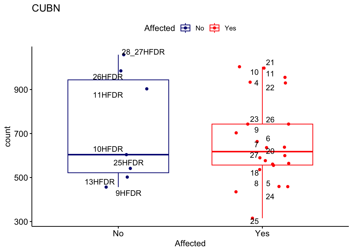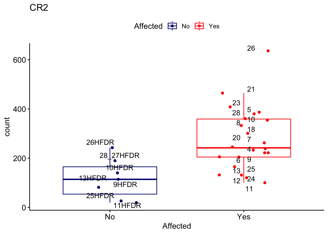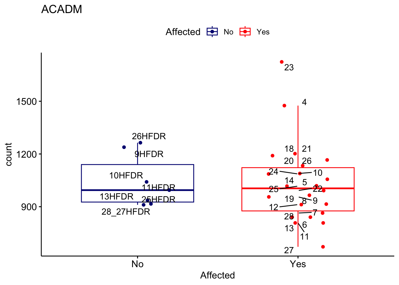 ggplot_box <- ggboxplot(d, x="Affected", y="count", add = "jitter", color = "Affected", palette = c("navy", "red"), title = gene_name) + geom_text_repel(aes(label = rownames(d)))