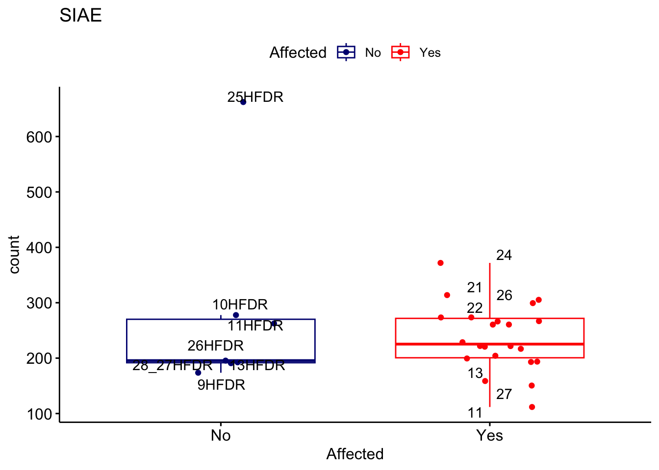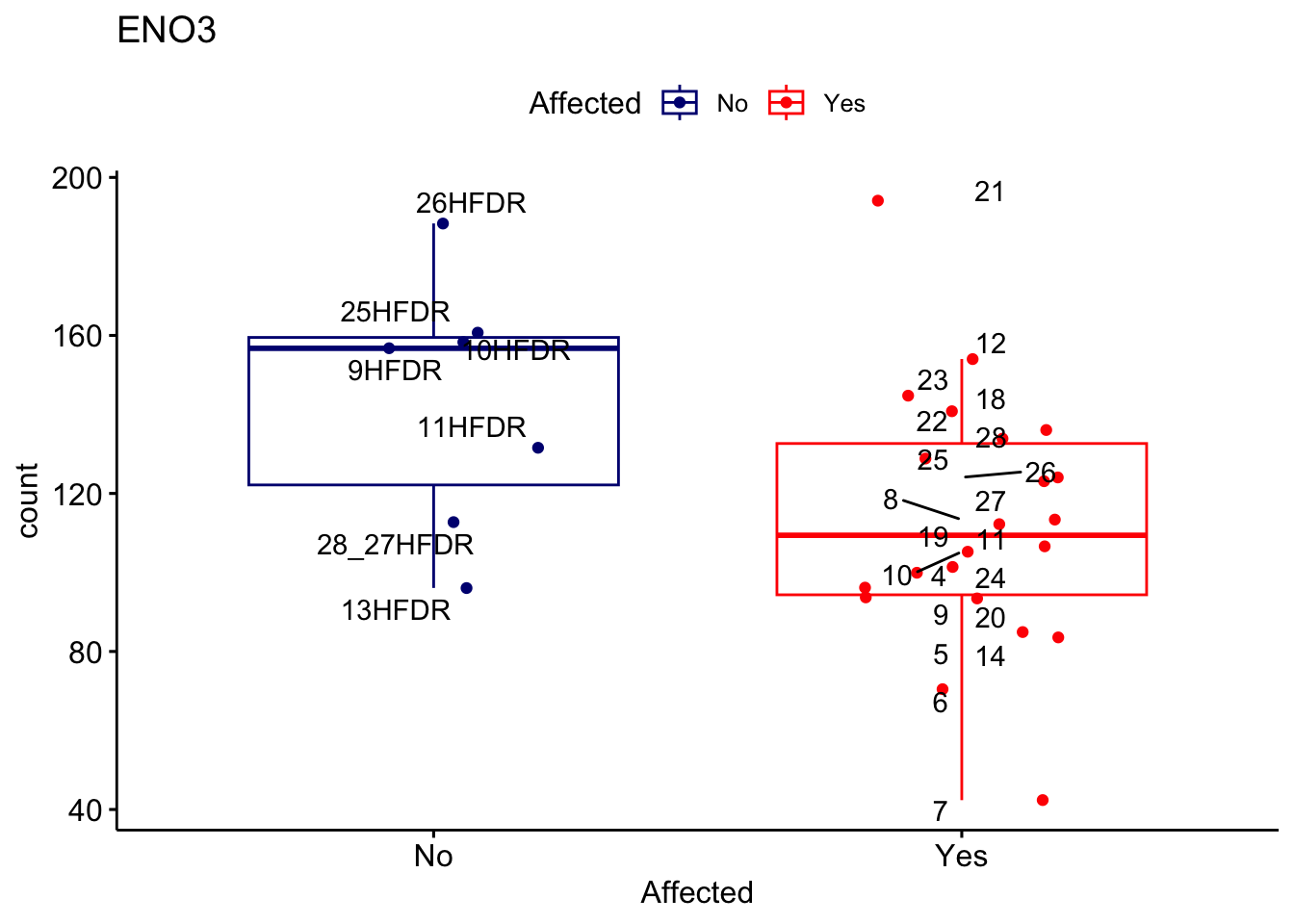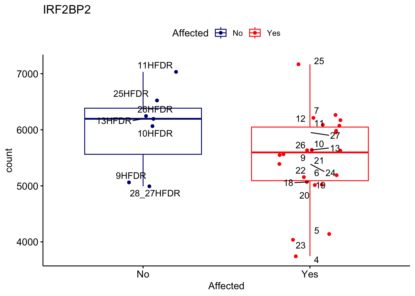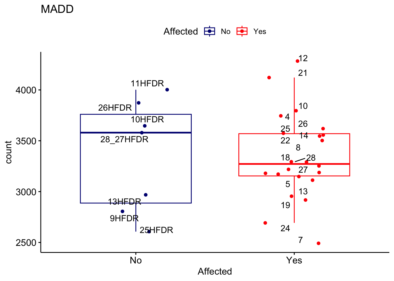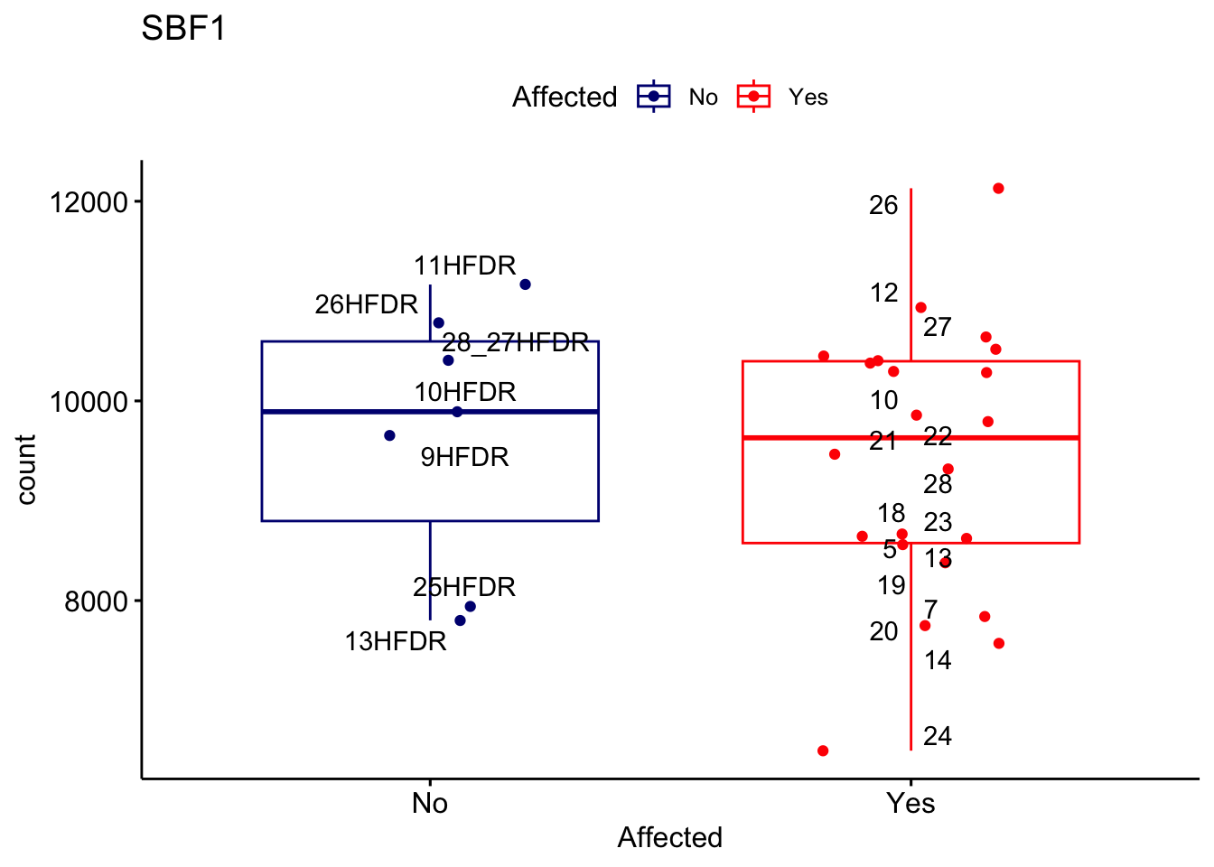 ggplot_box <- ggboxplot(d, x="Affected", y="count", add = "jitter", color = "Affected", palette = c("navy", "red"), title = gene_name) + geom_text_repel(aes(label = rownames(d)))