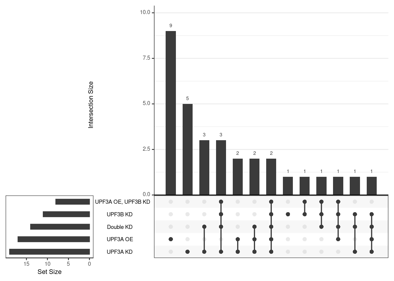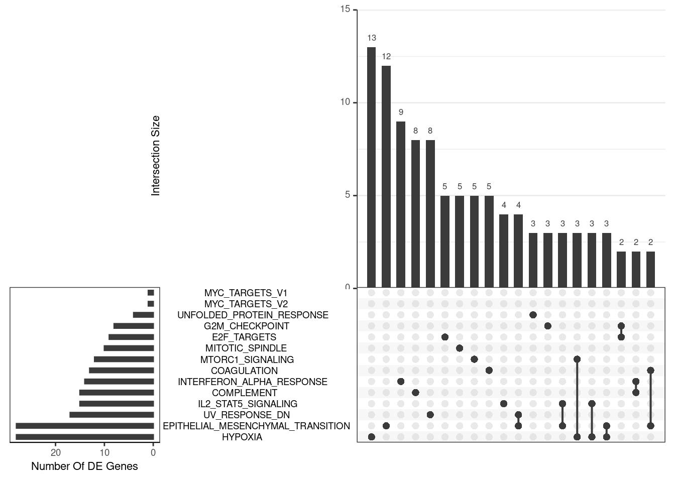 UpSet plot indicating distribution of DE genes within all significant gene sets. Gene sets were restricted to those with an FDR < 0.05 and at least 5 DE genes