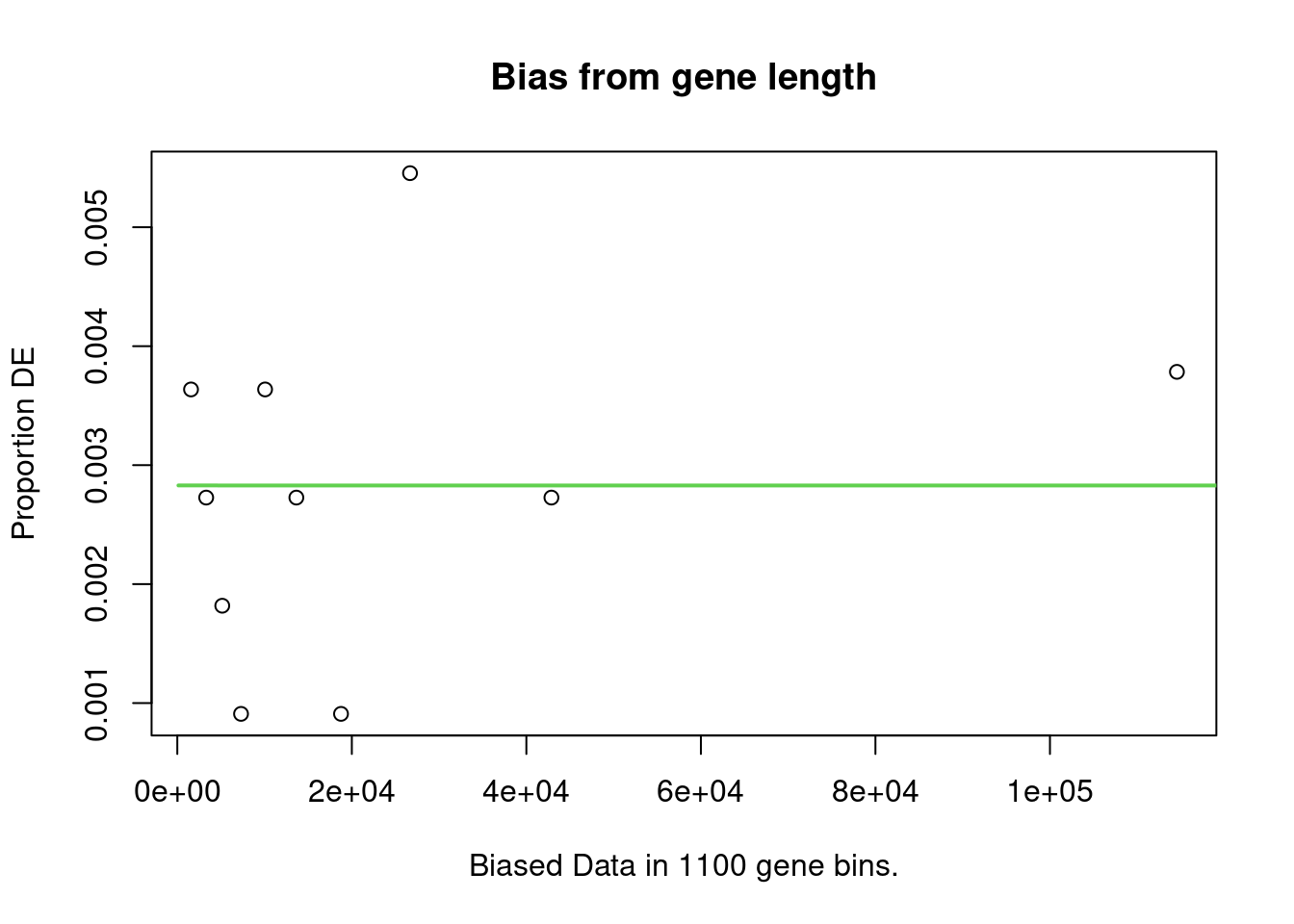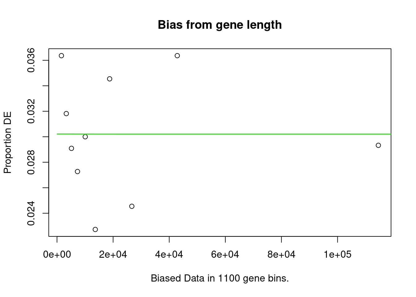 The PWD is calculated by fitting a monotonic spline to the binary data series of differential expression (1 = DE, 0= Not DE) as a function of gene length. The PWF is used to weight the chance of selecting each gene when forming a null distribution for GO category membership. The fact that the PWF is calculated directly from the dataset under consideration makes this approach robust, only correcting for the length bias present in the data.