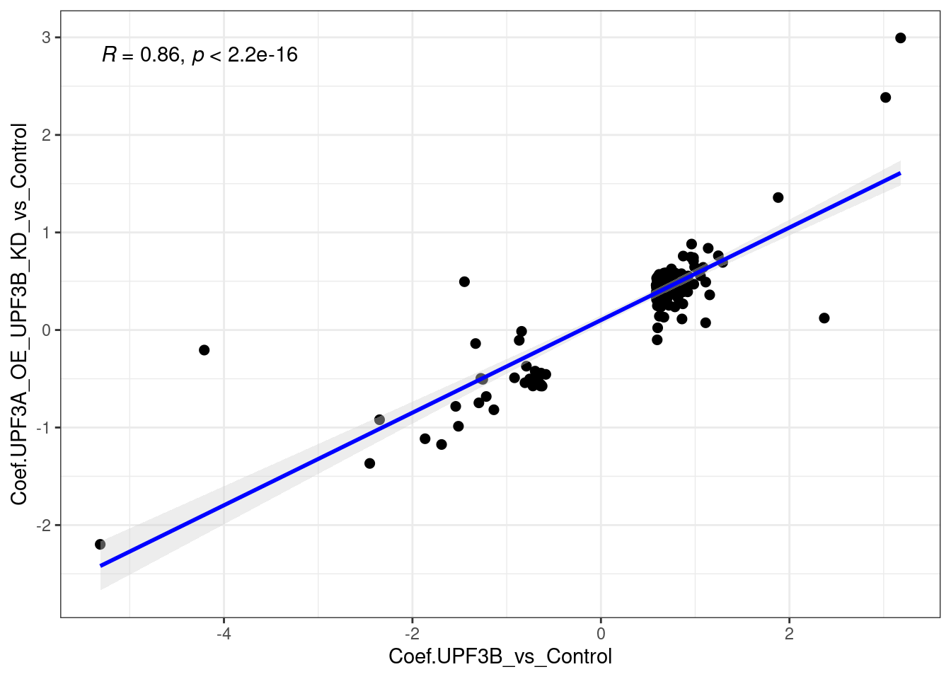 The principal component analysis was performed using the logCPM values from each sample. Each group appears to be clustering together. UPF3A over-expression is clustering with Controls, whereas the UPF3B KD samples are clustering closely with UPF3A overexpression in UPF3B KD files.