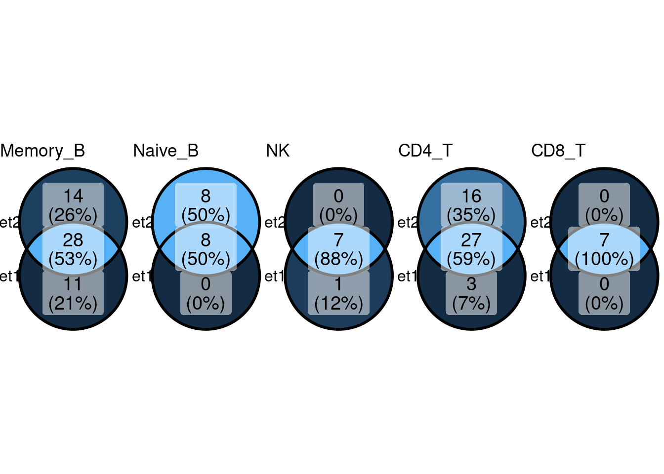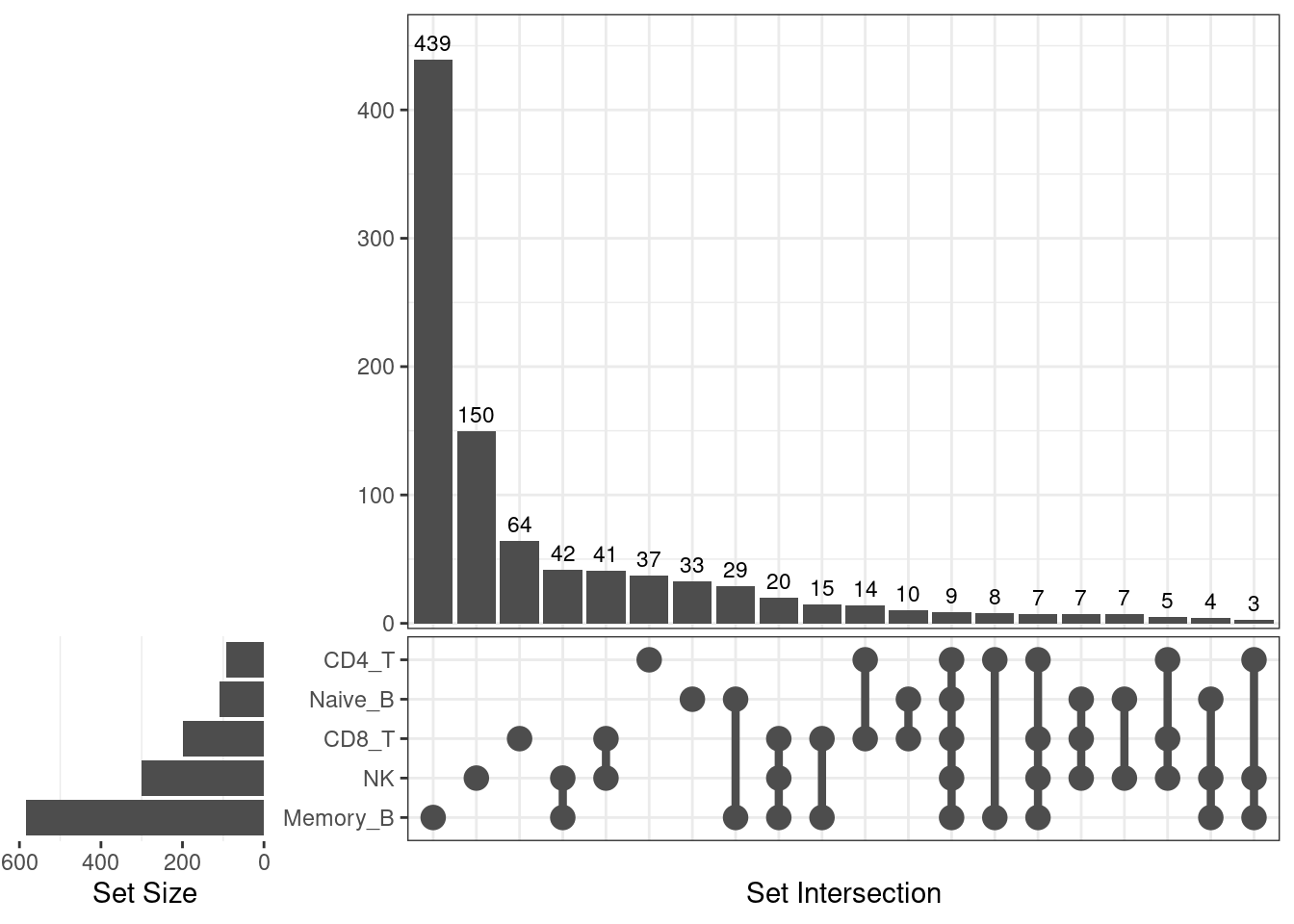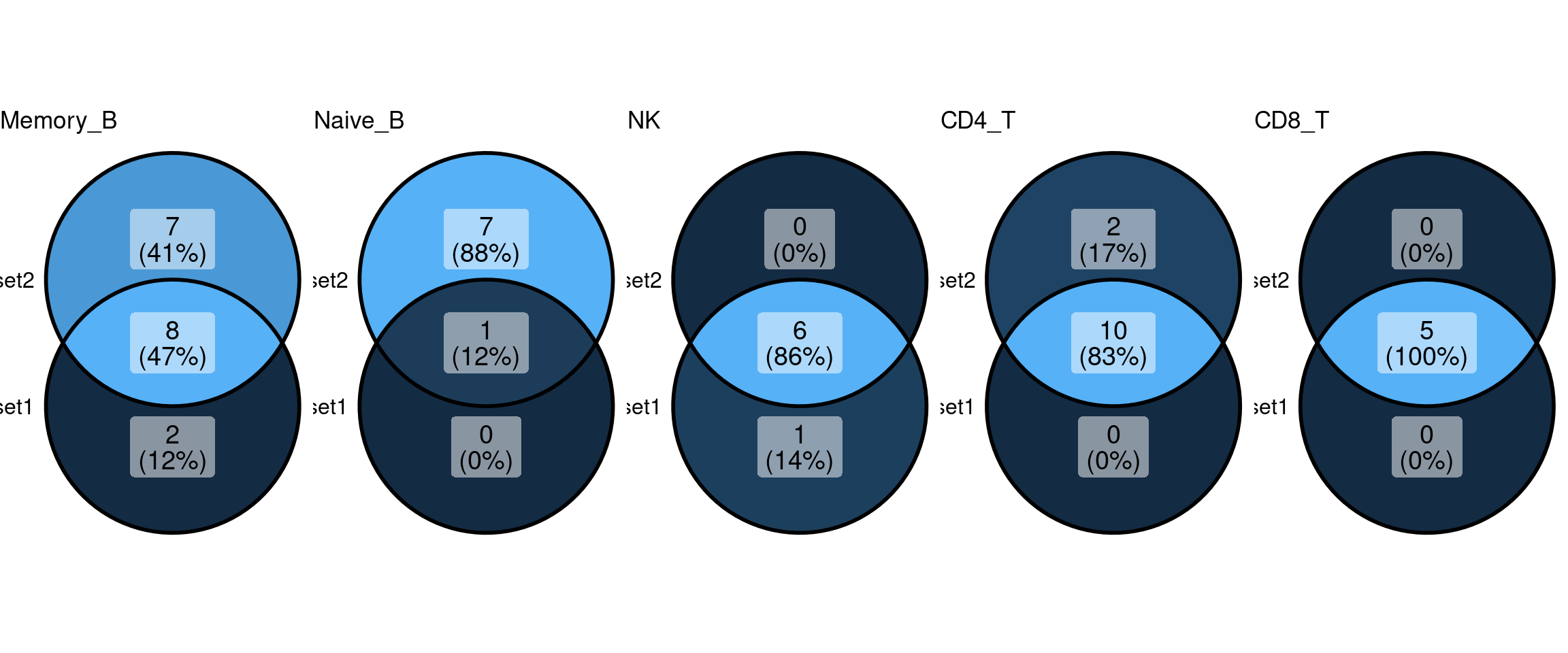 A Venn diagram for DE genes shared across cell types other than memory B cells implies DE genes are cell-type specific.