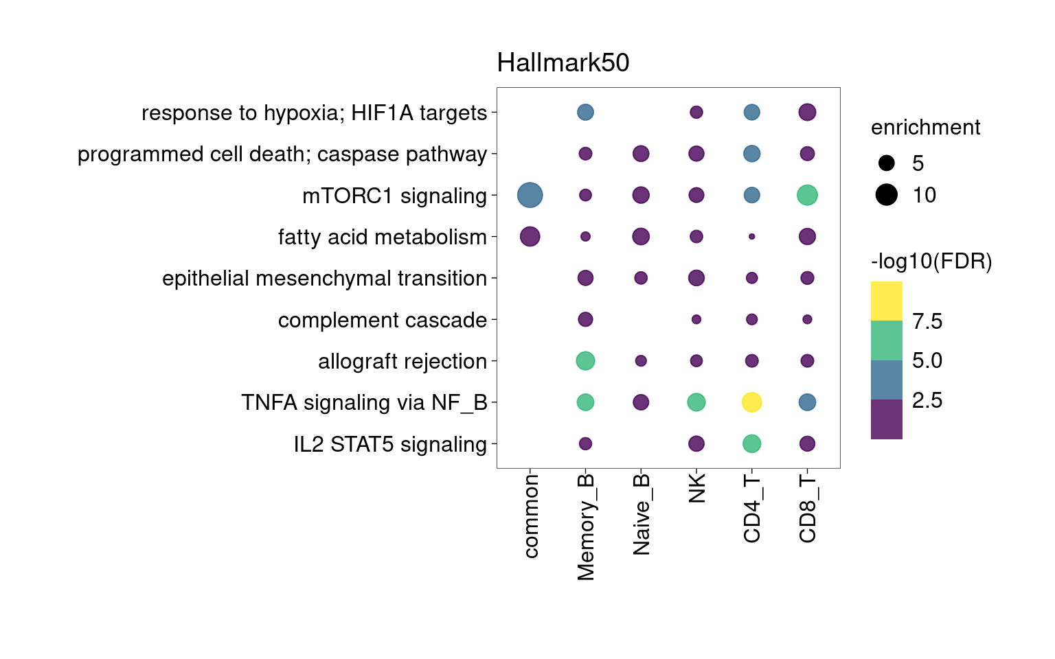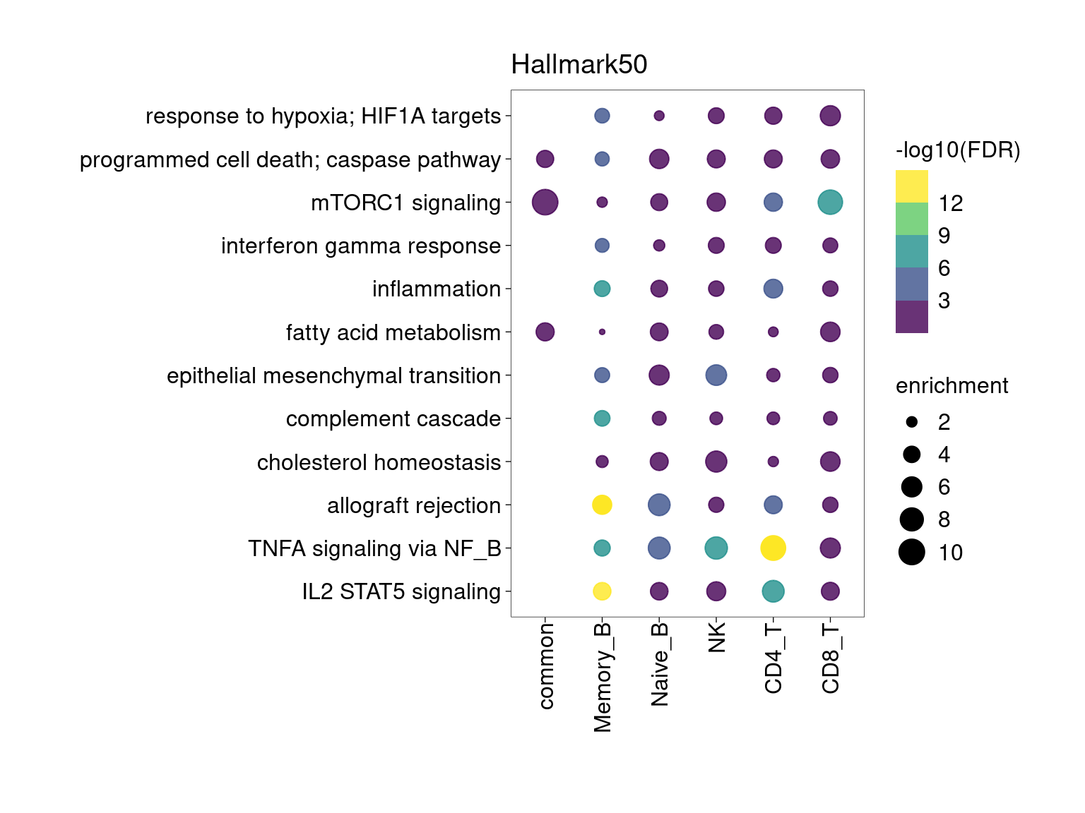 Overall, lung up-regulated genes are enriched for immune-related hallmark gene sets and GO terms for T cell activation, response to cytokines, and regulation of cell adhesion. Particularly, lung-specific genes in CD4+T and memory B cells are enriched for Th1/Th2 differentiation.
