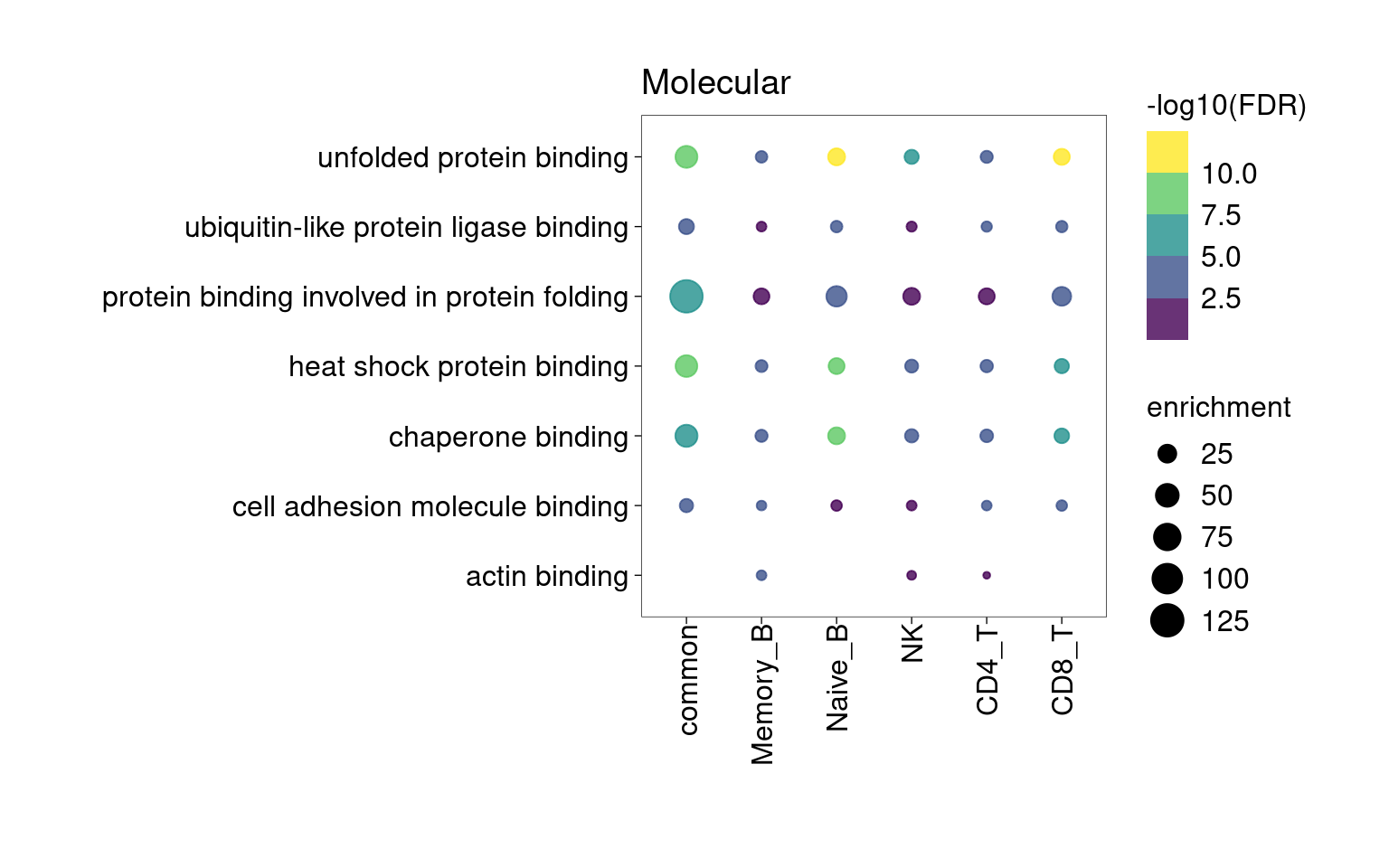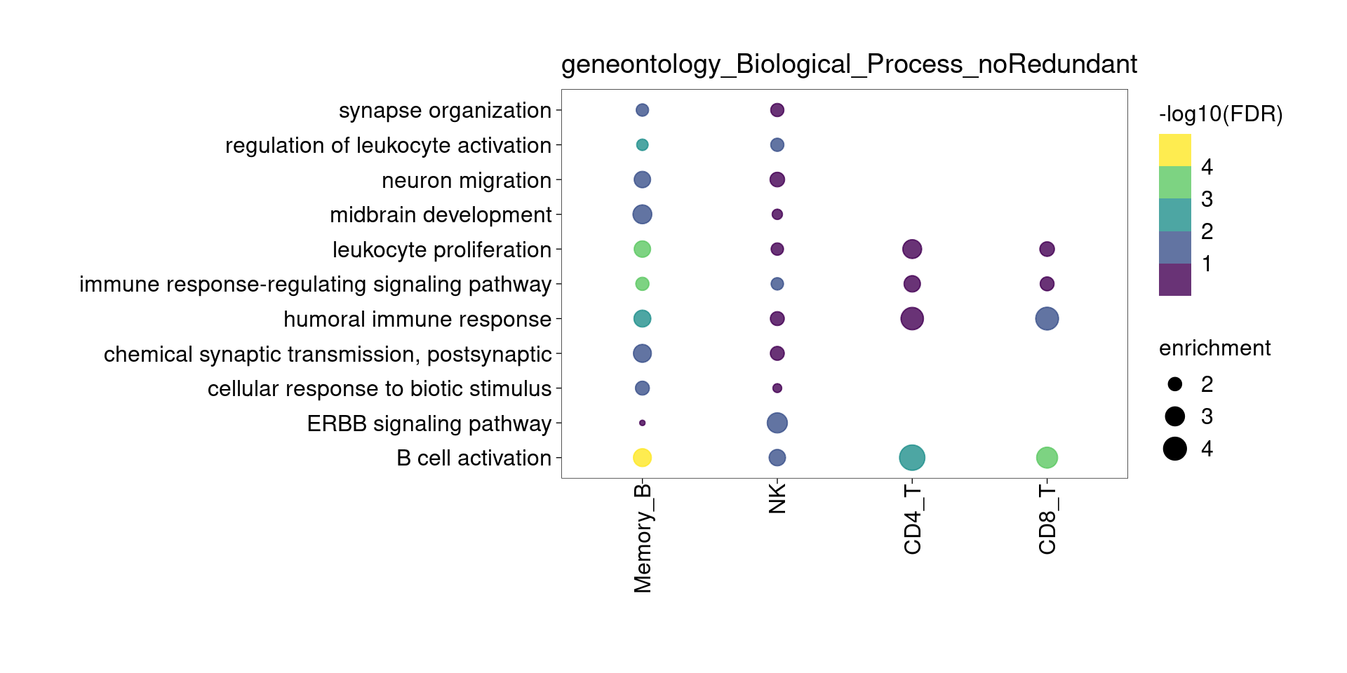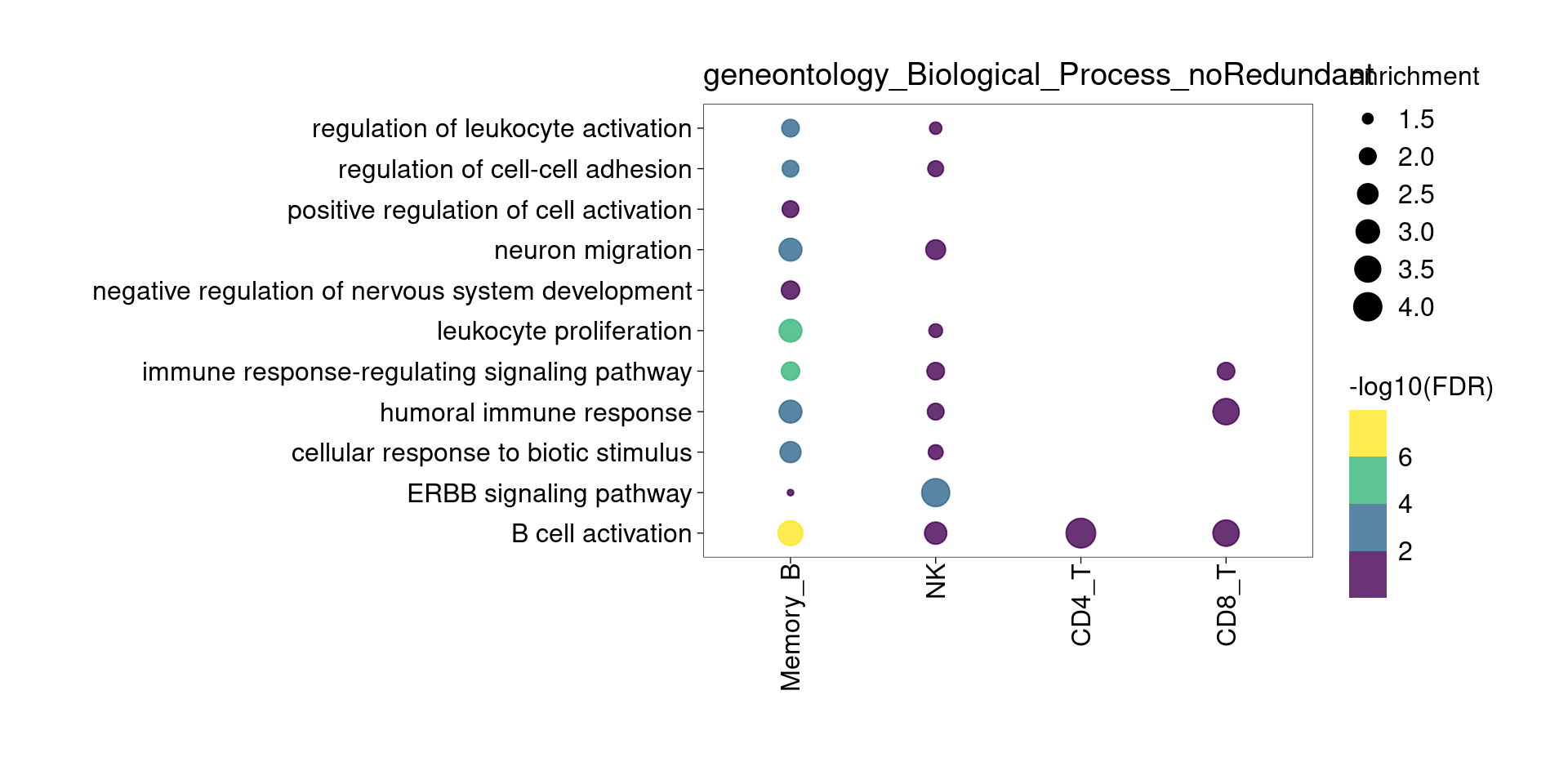 Setting lower min.pct mainly affects enrichment results from B cells and CD4+T Cells.