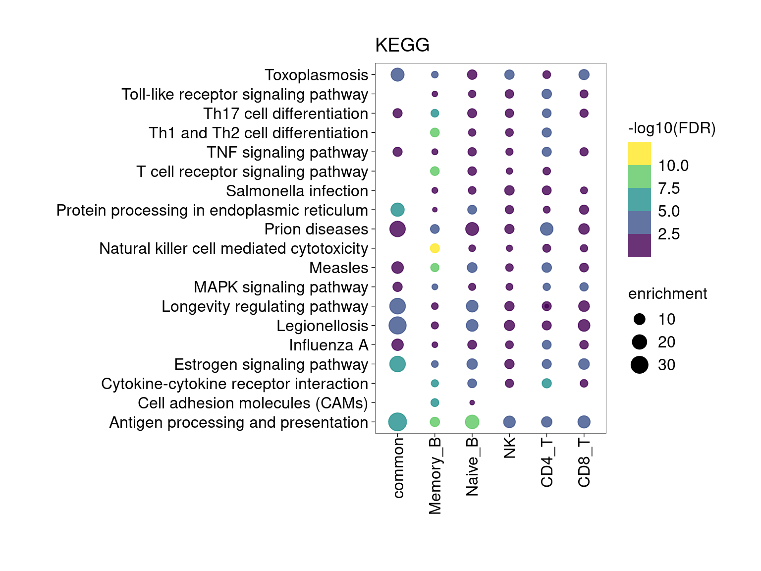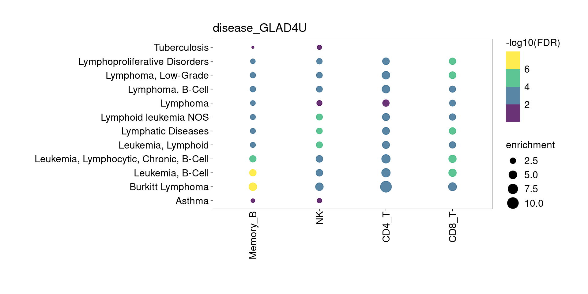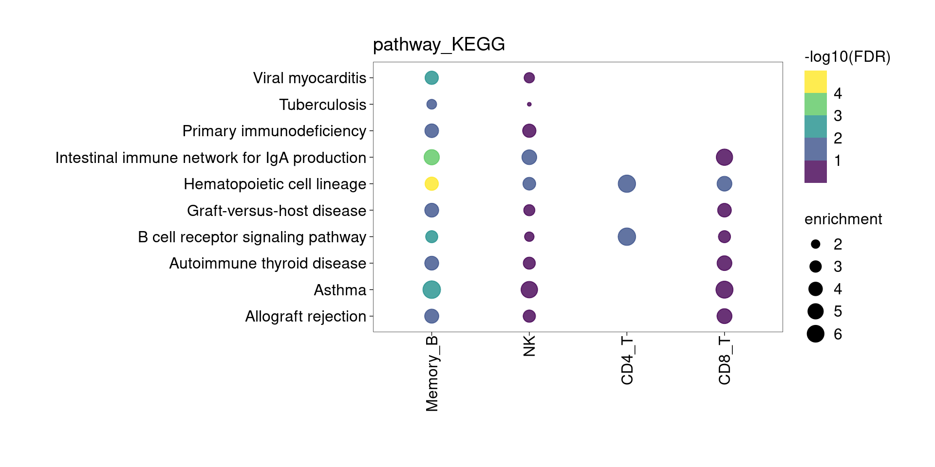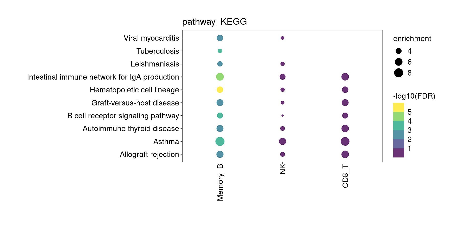 The DE genes down-regulated in lung detected from memory B cells are significantly enriched for asthma risk genes from KEGG pathway. The overlapped genes are HLA genes and CD40. Their function in B cells might be enhancing subsequent interaction with T cells.