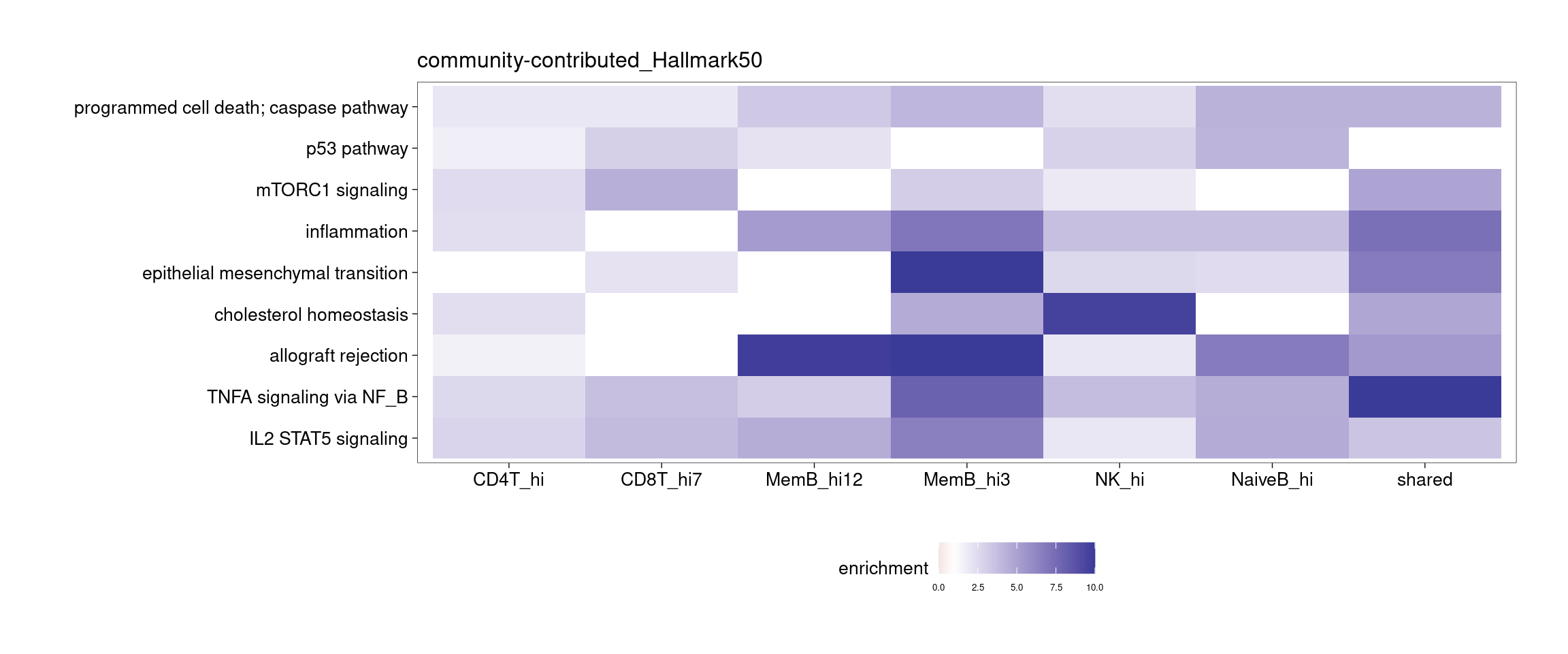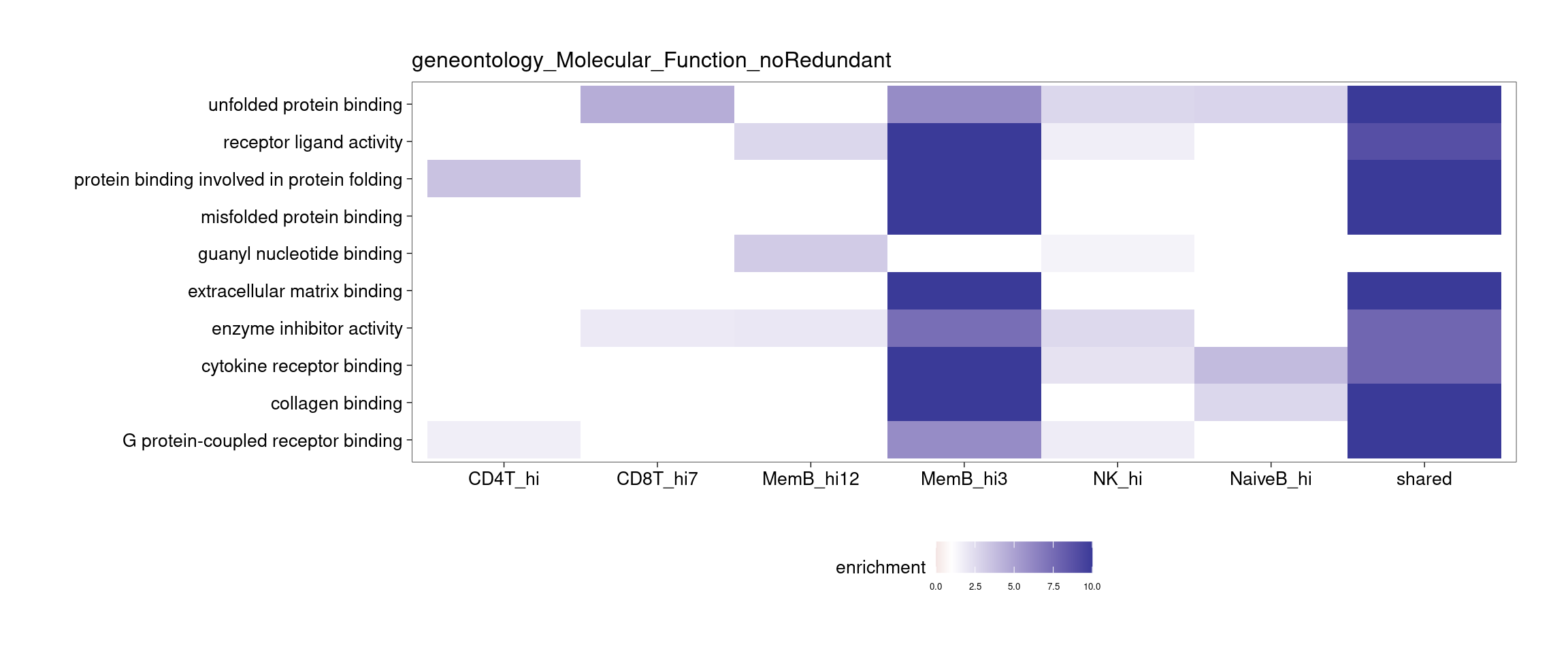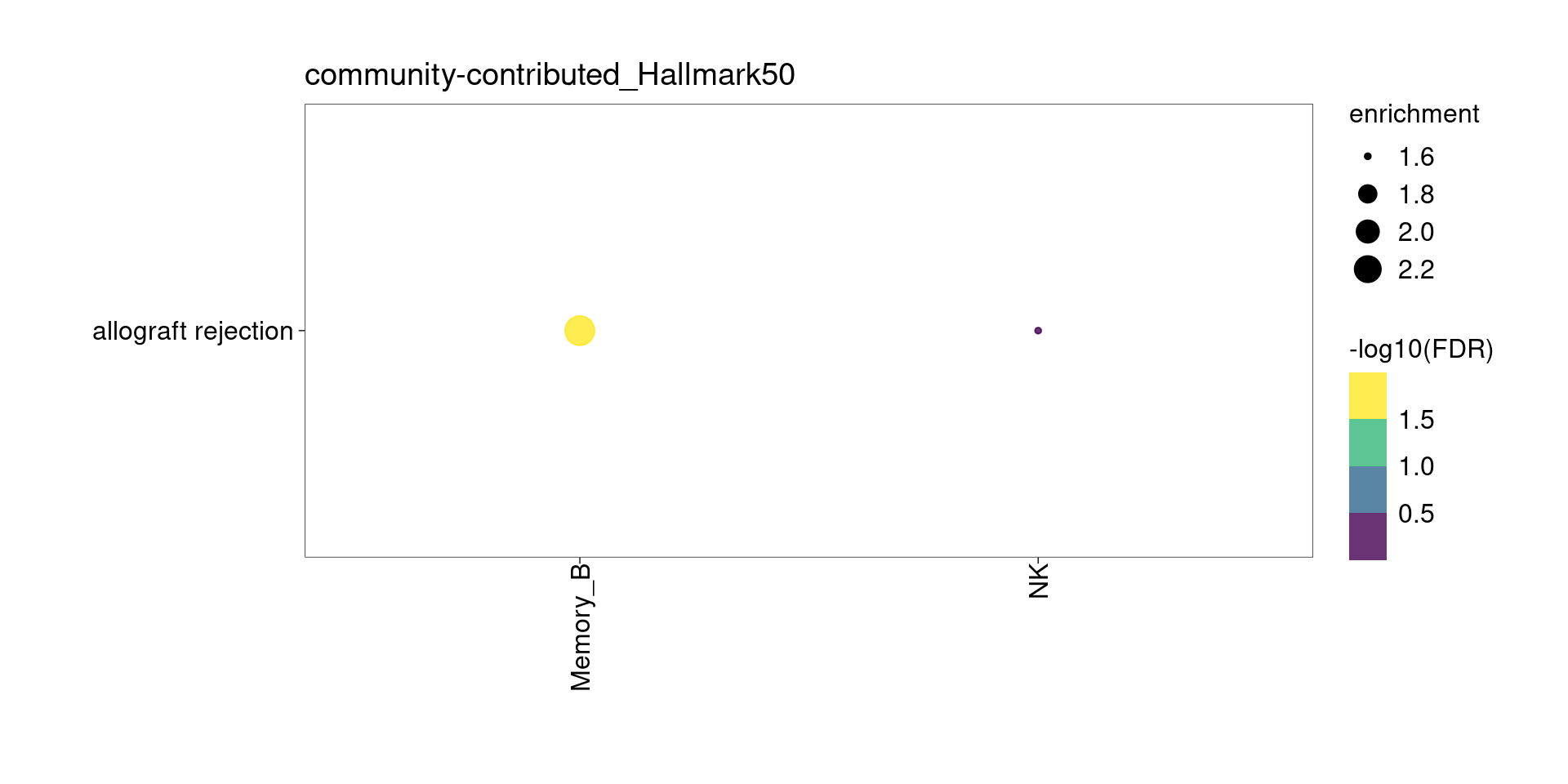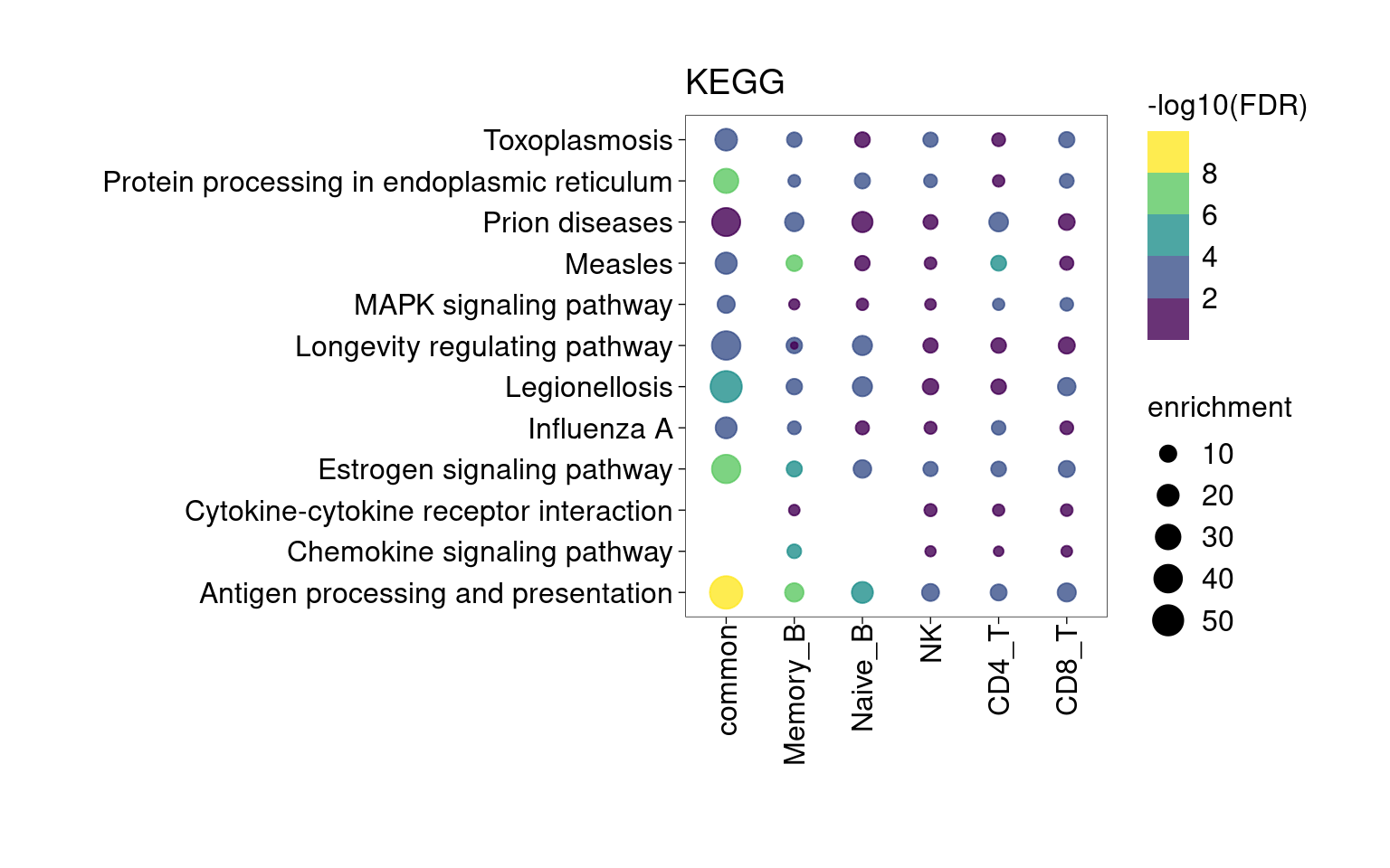 The DE genes down-regulated in lung detected from memory B cells are significantly enriched for asthma risk genes from KEGG pathway. The overlapped genes are HLA genes and CD40. Their function in B cells might be enhancing subsequent interaction with T cells.