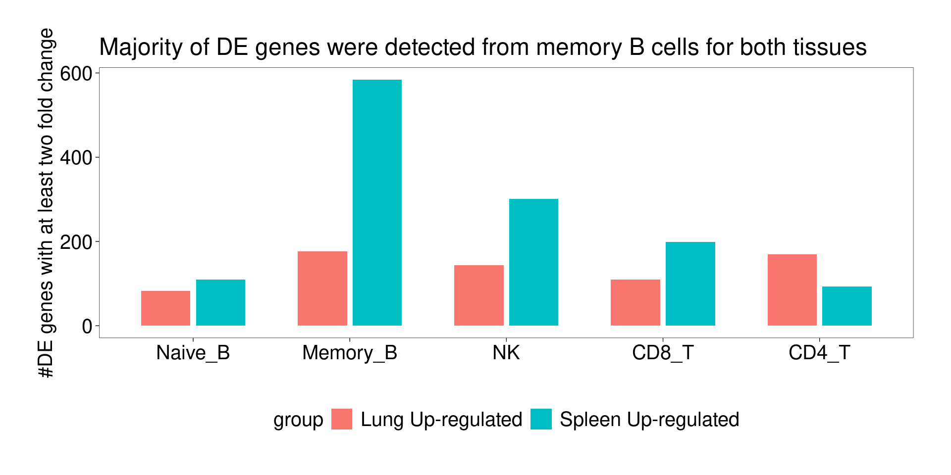 A barplot for number of DE genes detected for each cell type except for Th17 and Treg, due to low number of cells in spleen.