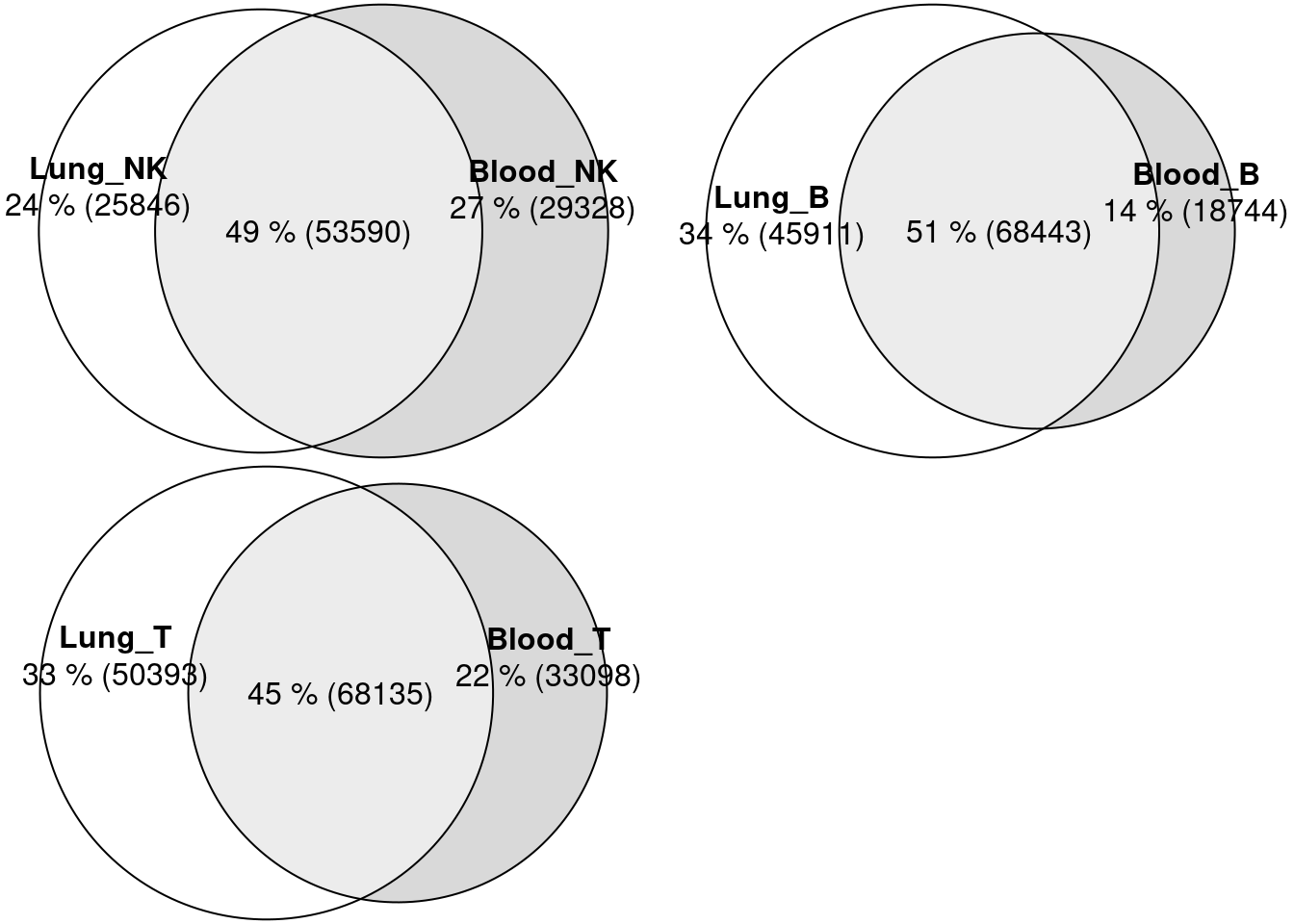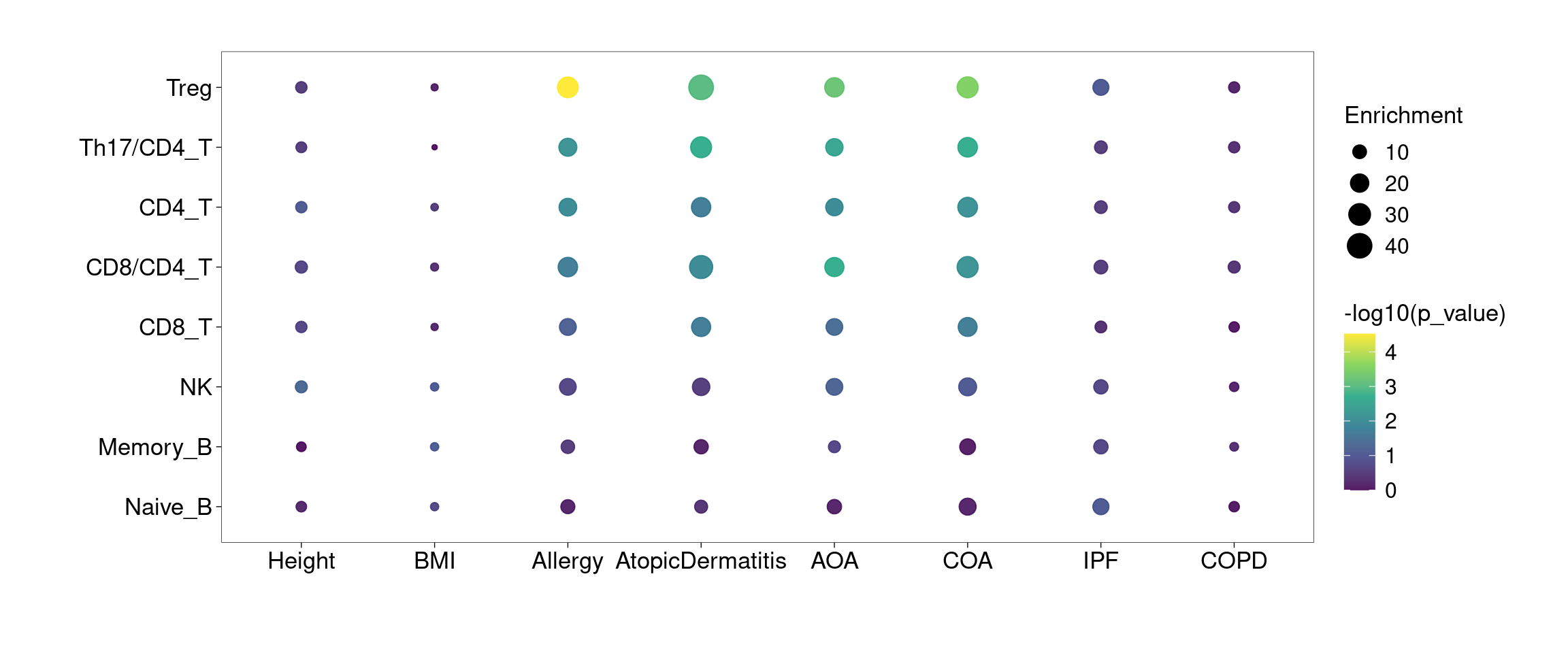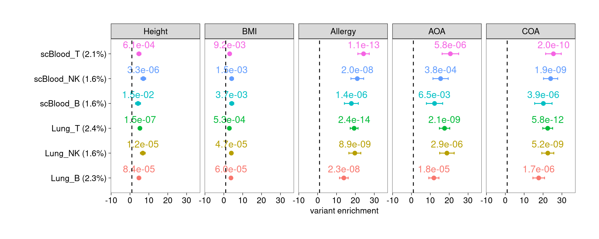 Compared with blood, open chromatin regions of lung T cells are significantly enriched for genetic risks of allergy, atopic dermatitis, and asthma, but not for control traits as well as IPF and COPD. Lung NK cells also show moderate enrichment.