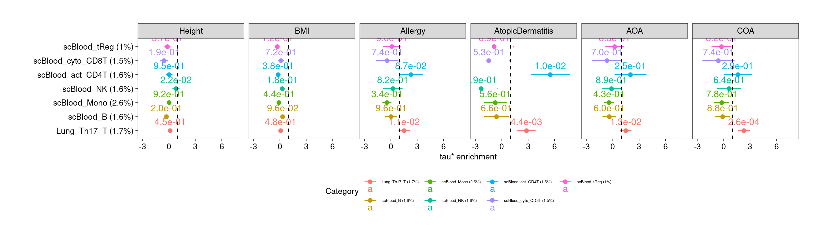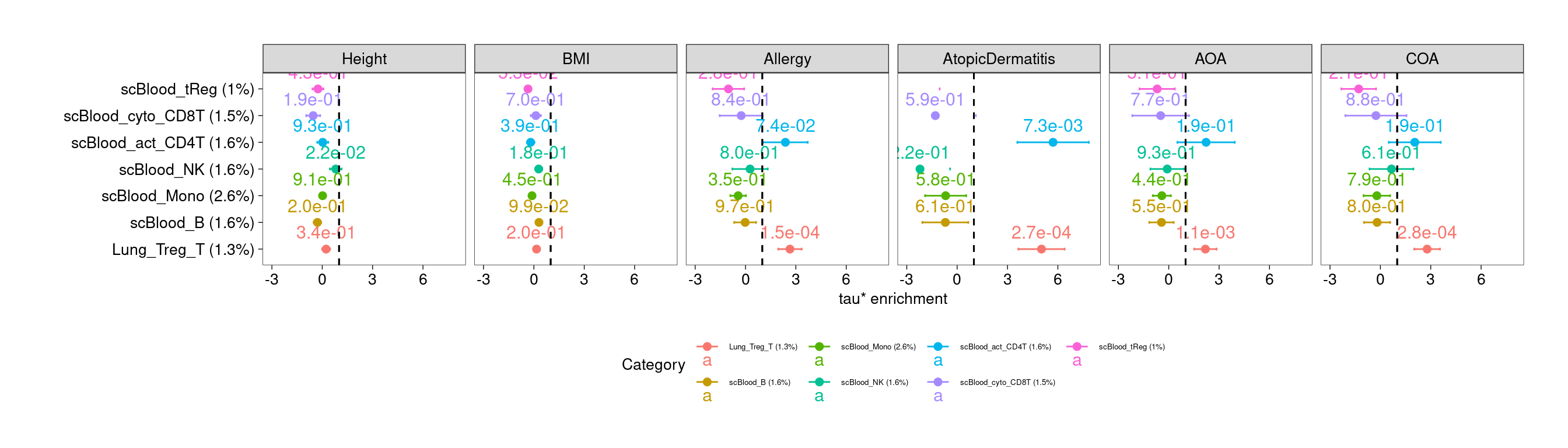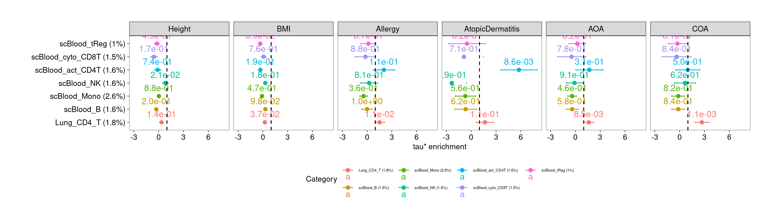 For individual test, the quantity of heritability enrichment is used to demonstrate overall contribution of each annotation. We can use p-values for cell-type specific coefficients to compare their contributions across cell types.