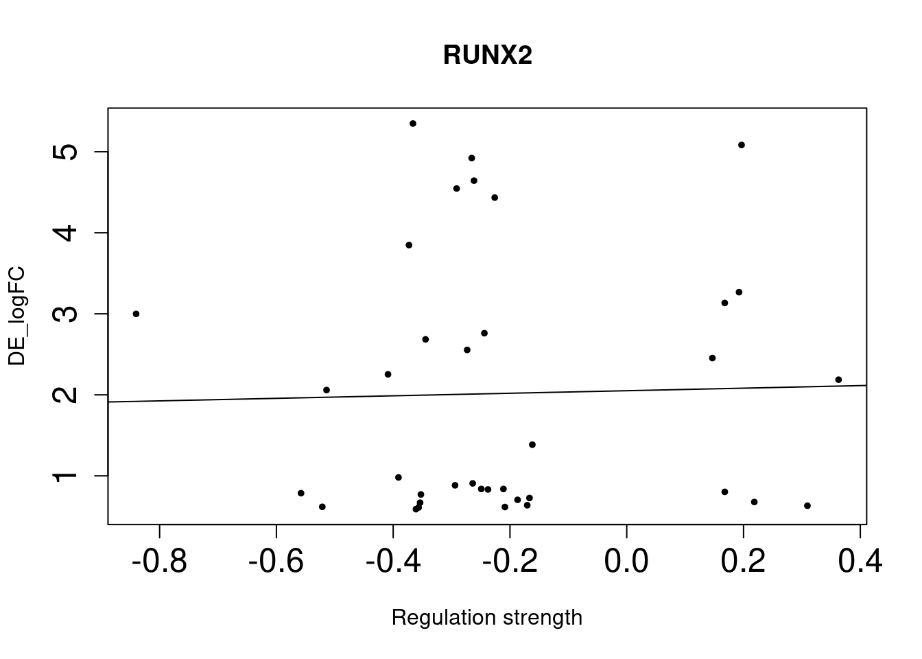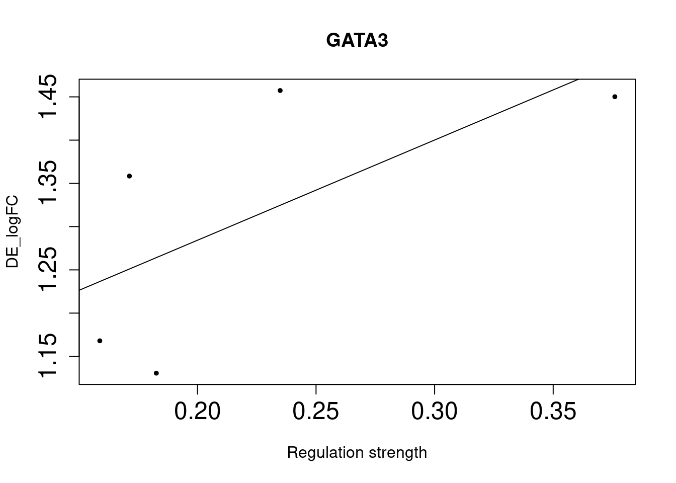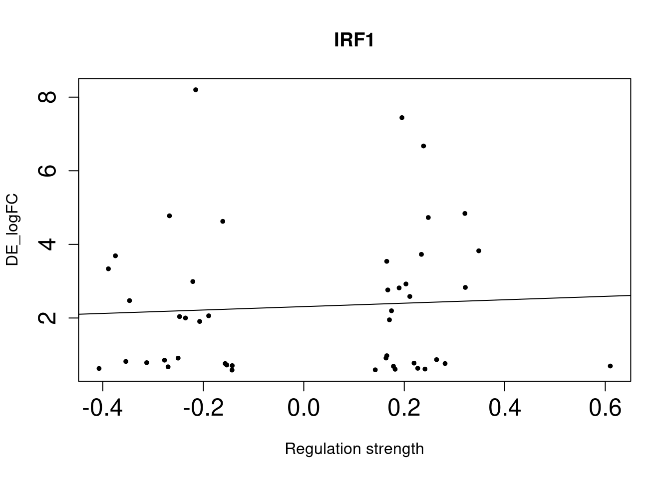As we identified lung-specific TFs enriched for DE genes, we further asked if TFs that have stronger links tend to have DE genes with larger differences between lung and spleen. Let’s use gene expression in spleen as baseline. If specific lung TFs drive gene expression in lung to be higher than baseline, we would expect to higher TF activity leads to higher expression.